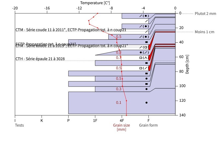 Sur les dernières chutes de neige, des instabilités sont encore présentes et donnent quelques résultats aux divers tests d'instabilités (CT et ECT). On retrouve quelques cassures linéaires sur de très fines couches fragiles. Ces dernières sont enfouies sous 30/50 cm de neige. Méfiance, un niveau de risque limité (soit 2) ne signifie pas une absence de risque.