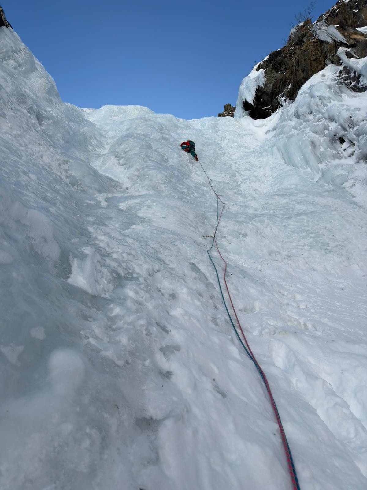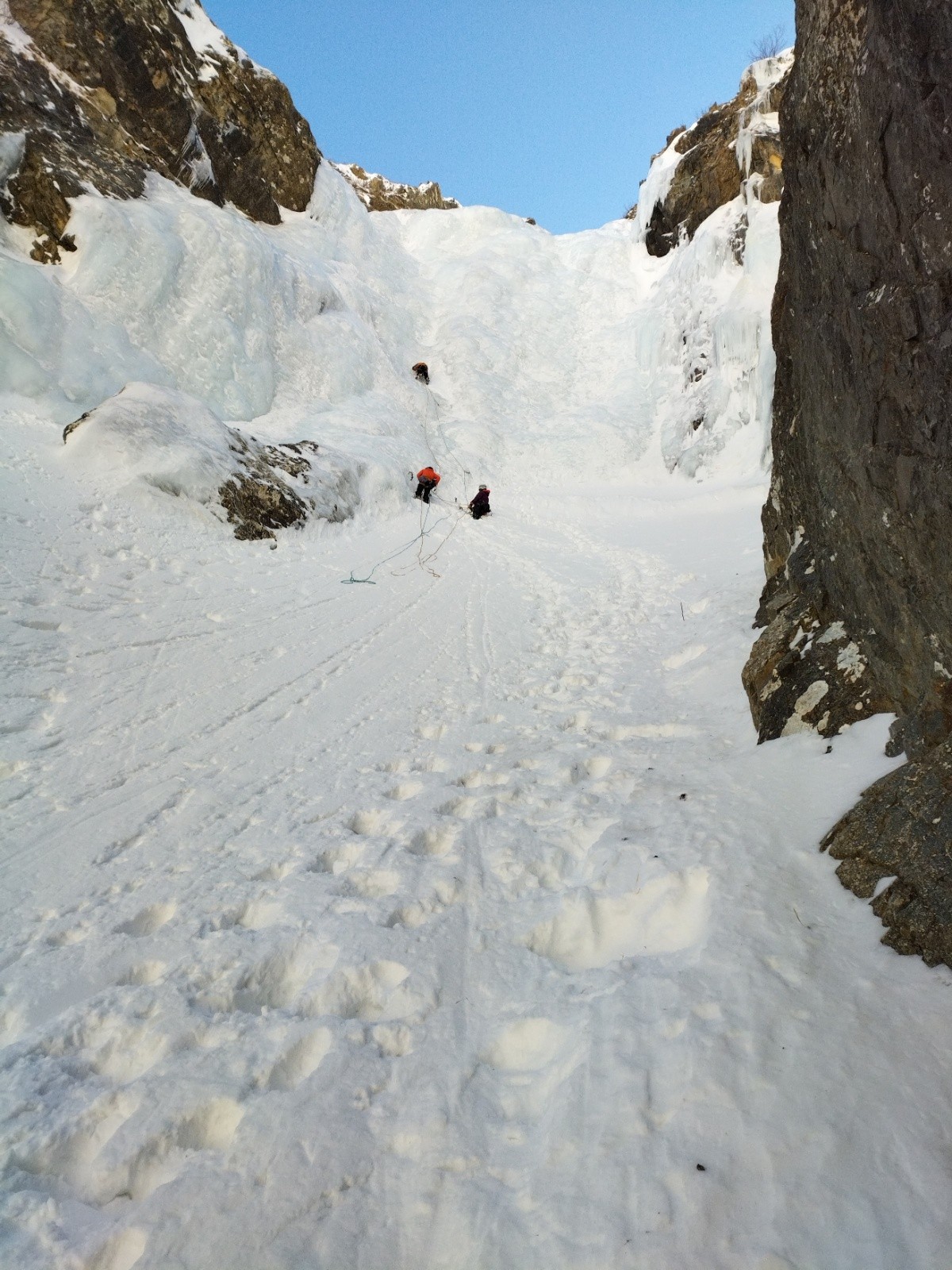 Et puis L2 réchauffe le cœur et les mains, les pieds sont, eux, foutus alors même qu'ils sont sous perfusion électrique. Le moral revient, la longueur est sympa à ouvrir, faut juste pas trainer quand on broche. On n'a pas trouvé R2 donc on a fait un relai sur broches. Apparemment il est en rive gauche, sous une petite grotte. La description nous fait investiguer un endroit, et non pas de traces du dit relai. A la descente le relai a été découvert par une autre cordée, il était littéralement juste à coté de l'endroit qu'on a déblayé, oups…
