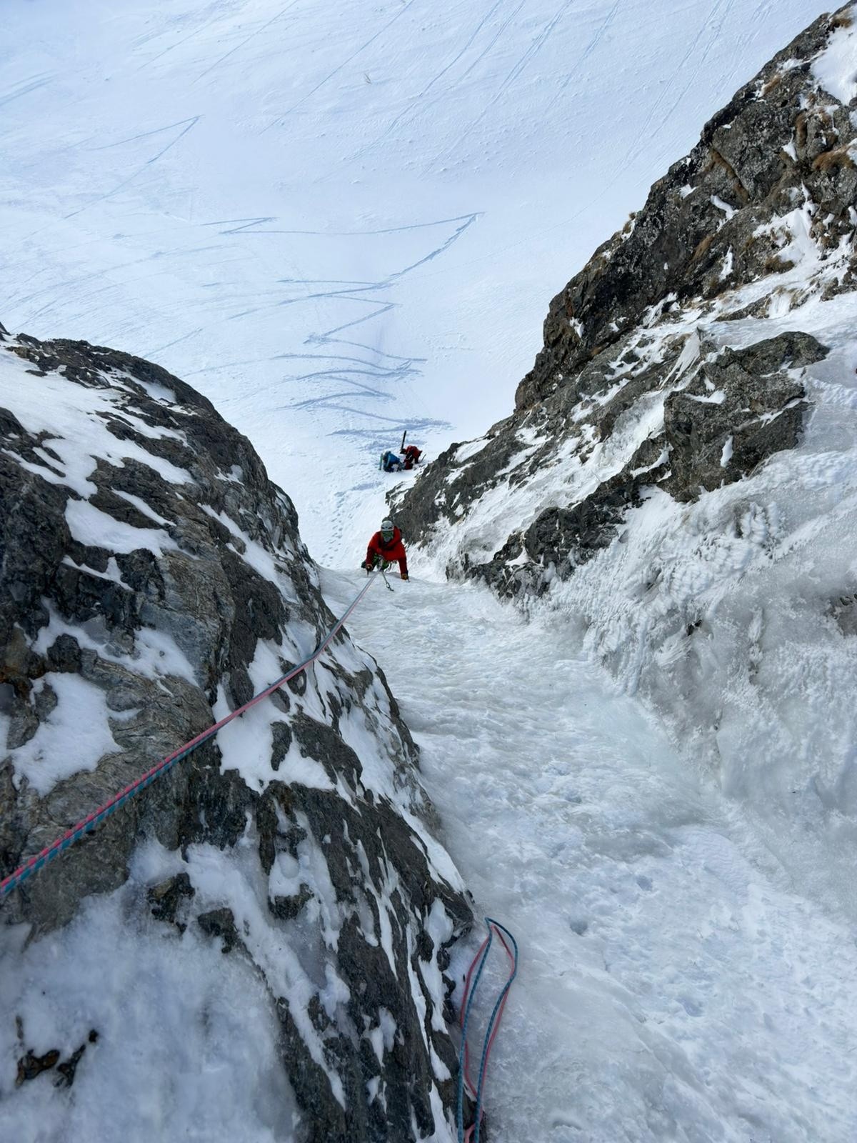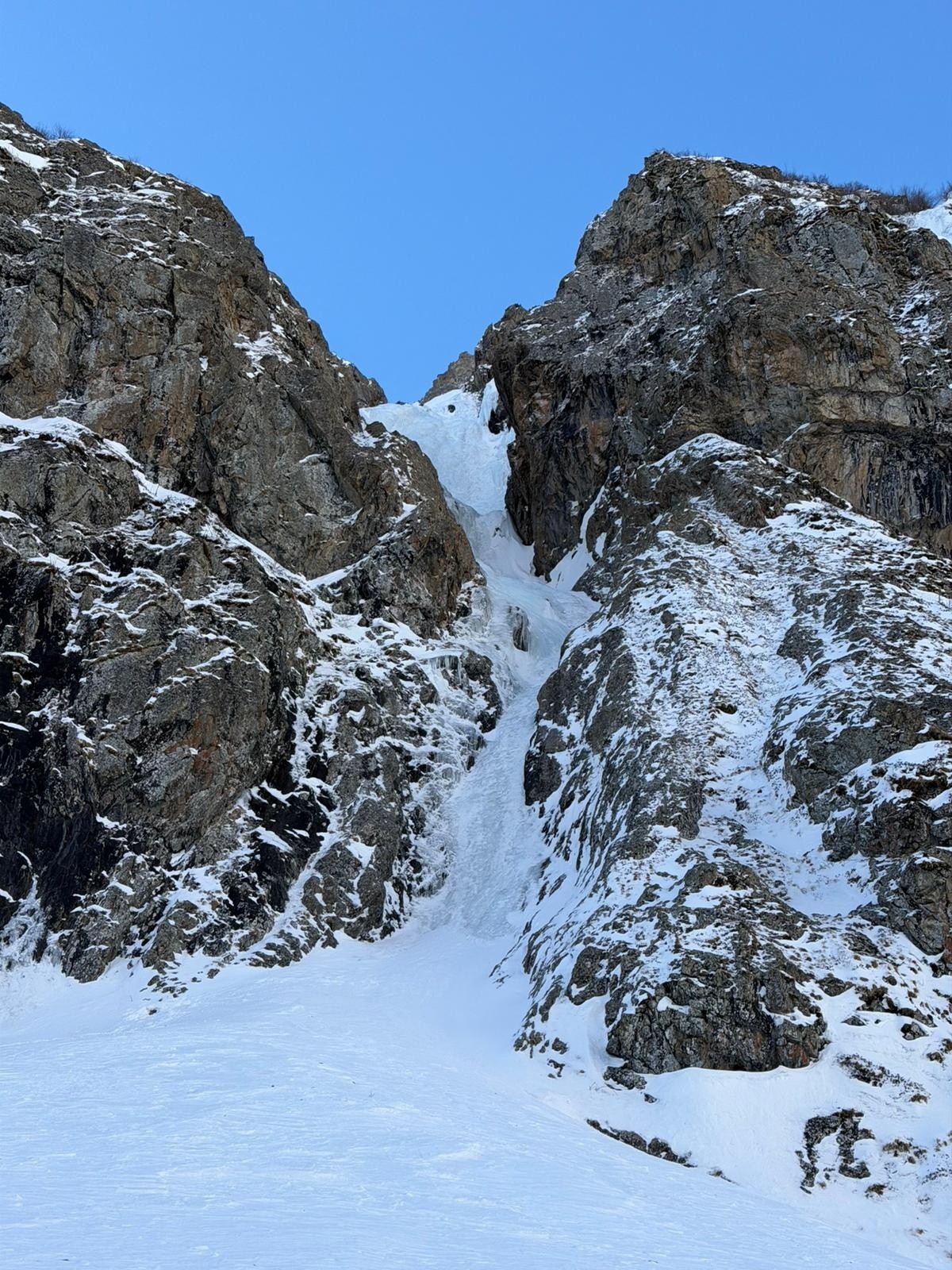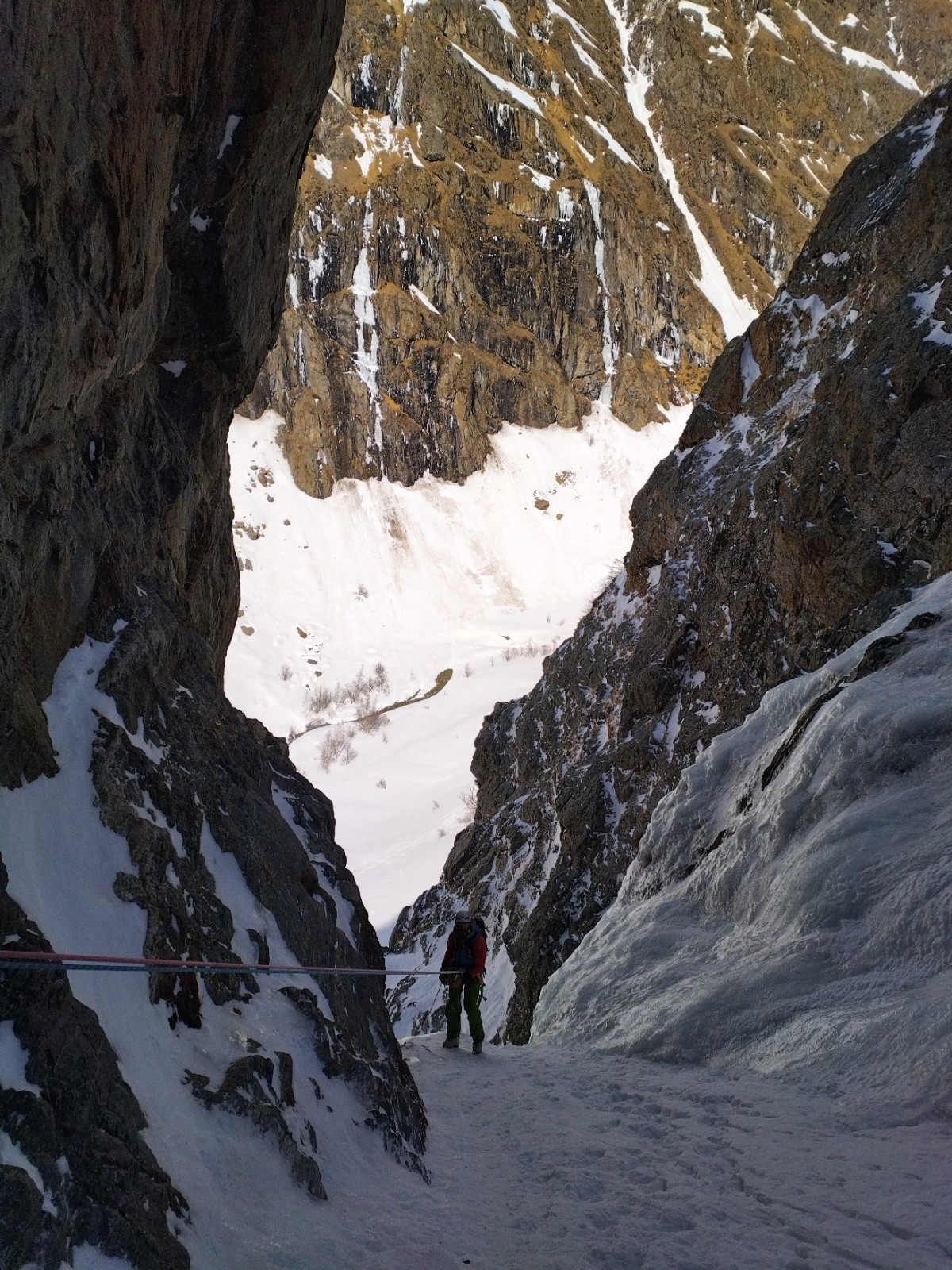 Pour L3 le copain file et disparait derrière le ressaut. Puis, un couloir à 45° dans une neige par faite à skier (mais c'était sûr en fait, c'était sûr!) plus tard, on se retrouve devant L4. Et là, j'ai bien envie de partir dans la variante à droite en IV+ , tant qu'à faire, on n'est pas venu ici pour du III !