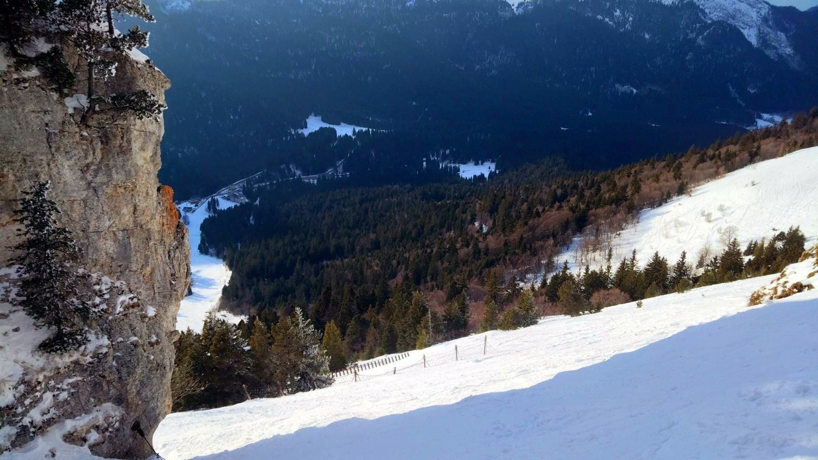 La descente, elle, oscille entre deux mondes. Quelques zones encore froides, presque poudreuses, côtoient une neige déjà transformée. Le ski devient lecture du terrain : agréable sur le plateau, joueur en forêt, plus banal sur les pistes. Mais au milieu, la neige s’alourdit, accroche, freine, comme un rappel que la transition est en cours.