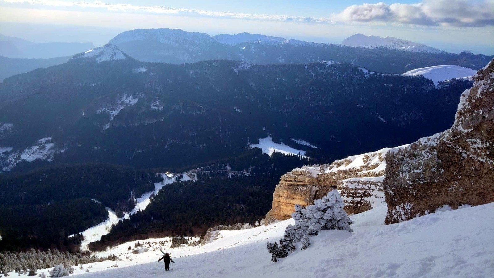Après une matinée à faire du ski de fond, les jambes déjà entamées mais l’envie intacte, je profite enfin de l’accalmie. Le vent du nord, qui balayait encore les crêtes ces derniers jours, s’est tu. Le silence revient, presque soudain, et avec lui cette impression fugace que la montagne se rend à nouveau accessible. Direction Chamechaude, valeur sûre des fins de journée, dont les pentes ouest capturent les dernières lueurs.