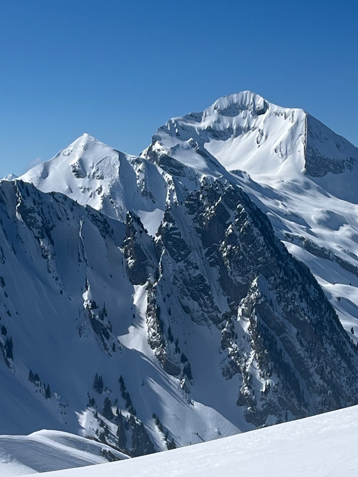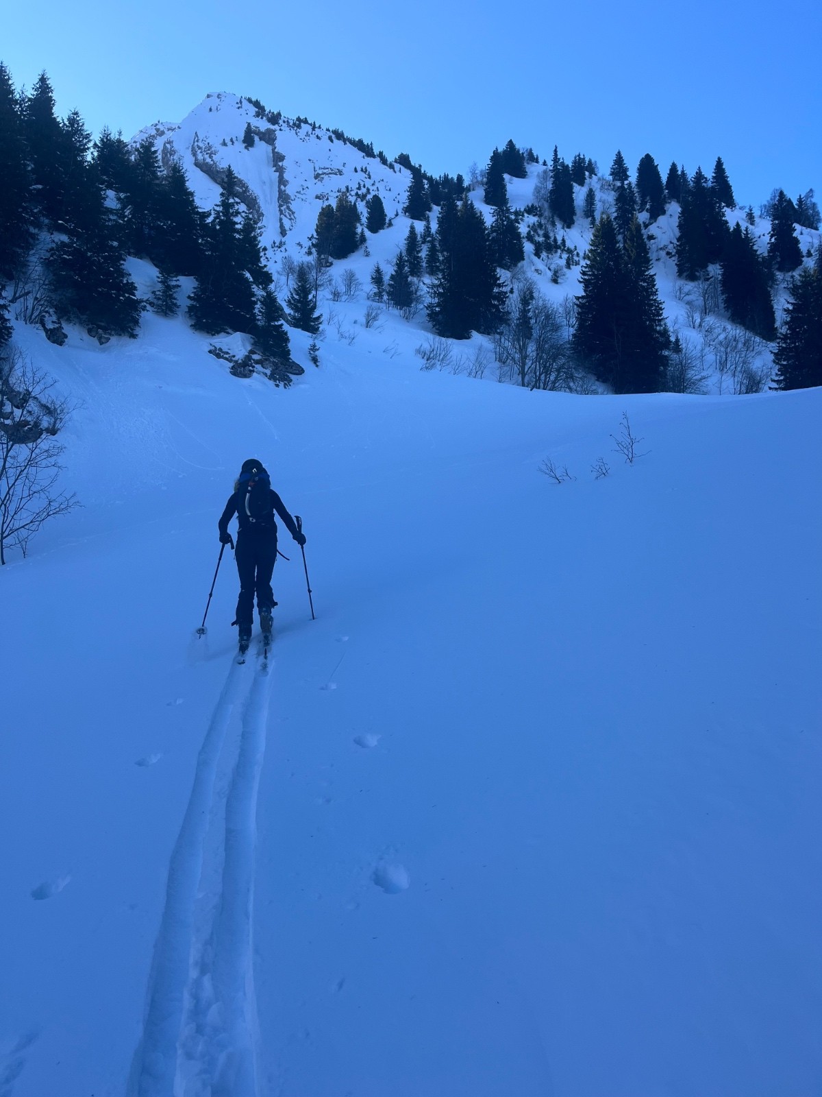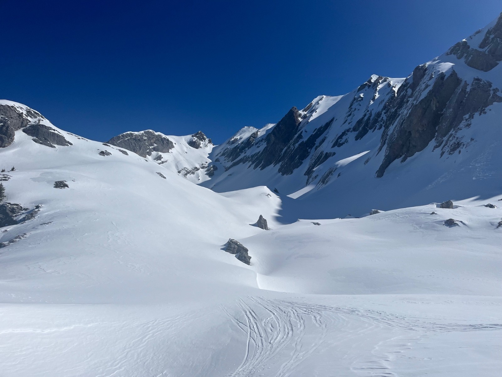 Que choisir après les dernières chutes de neige, le vent de Nord important et le froid persistant ? On fait le choix de partir sur l’Étale en s’offrant le luxe de descendre par le couloir Chauchefoin. Nous décidons de monter par la combe Foiroux, afin de découvrir cette itinéraire comme solution de repli dans l’hypothèse où les conditions dans le couloir orienté ouest ne sont pas bonnes. La montée se passe très bien dans la combe, beaucoup de neige froide des le bas. Ça donne envie, quand on débouche sur le plateau avant de se diriger vers l’Étale c’est vraiment grandiose ce cirque, là aussi tout donne envie de se faire skier les morceaux en Nord semblent être en bonne neige. Direction le col sous le sommet de l’Étal, nous laisserons les skis pour monter en crampons jusqu’au sommet en aller-retour. On attaque la descente, les faces orientées Est et Sud sont déjà transformées. On ne traîne pas trop, et on prend la direction du couloir, on se fait piéger par des traces et on essaye de rentrer trop tôt dans le couloir, on fait demi-tour et on descend plus bas. Et là le passage est plus simple, mais pas aisé pour autant. On rejoint la rampe qui donne accès au couloir, et de la une sacrée ambiance, il vaut le détour ce couloir ! Ici, on aura tous les types de neige, selon l’orientation, du crouté, du vanté, du cartonné, du transformé et de la poudre. Il y en a pour tous les goûts ! À la toute fin, c’est un peu plus serré, mais ça passe bien, puis descente tranquille pour rejoindre la voiture. Un très beau coin a retenir.