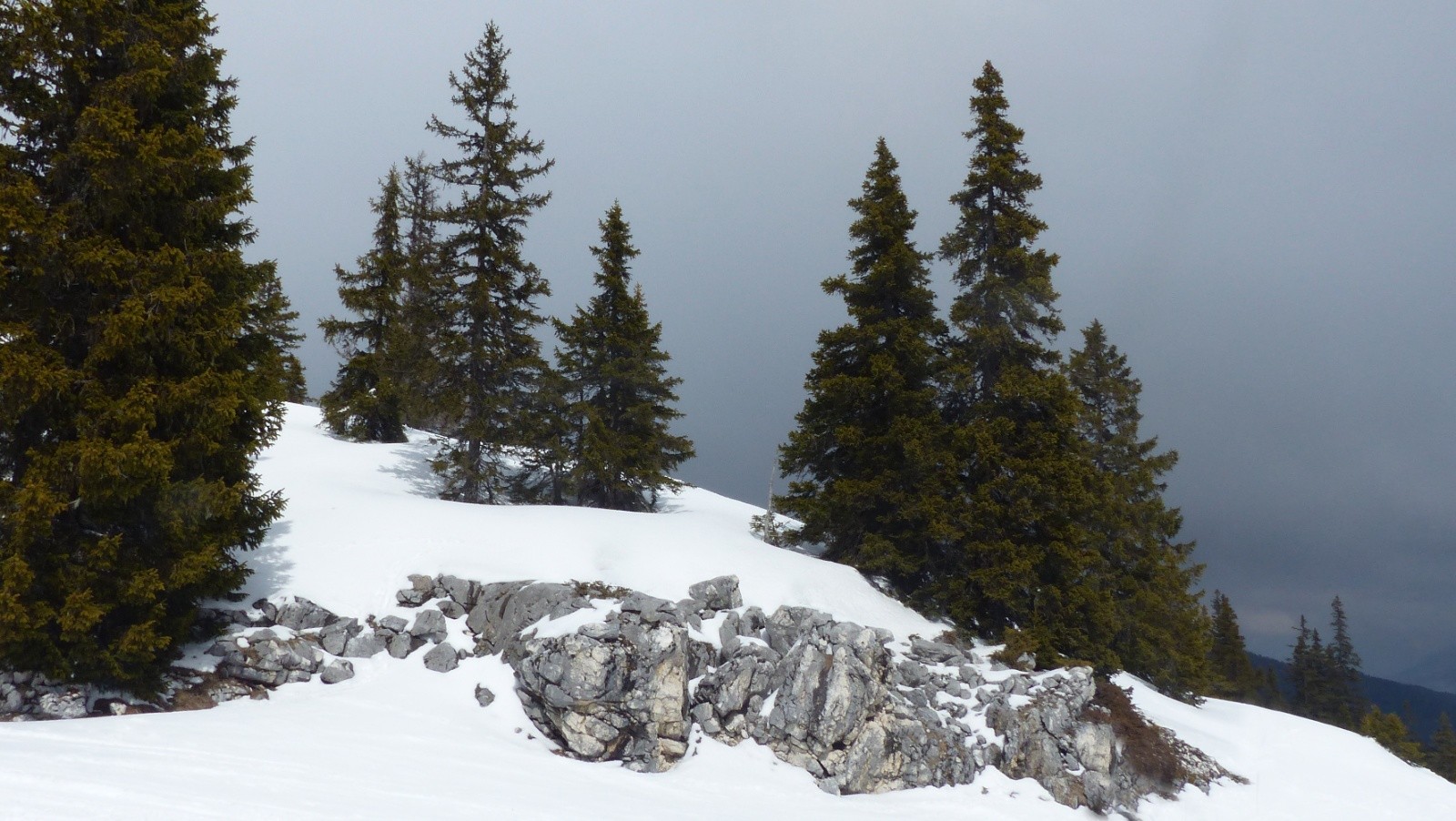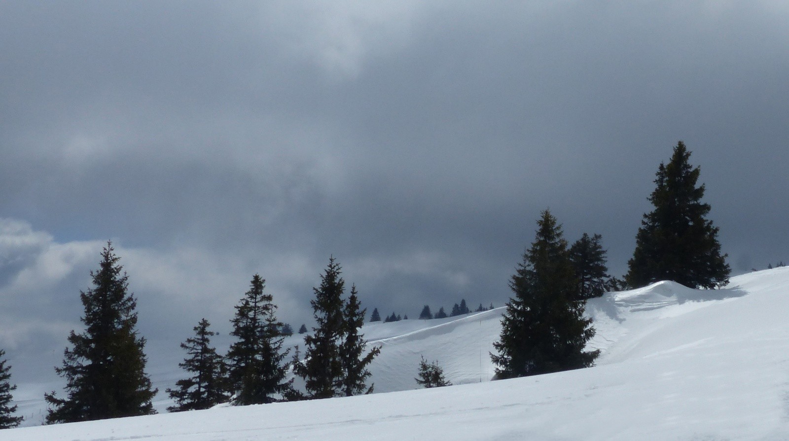 Je ne pense pas avoir choisi le meilleur jour: le ciel s'est vite beaucoup obscurci. Mais pratiquement pas de vent (ce qui explique les brumes épaisses et tenaces). Si la 1° montée-descente s'est révélée très agréable, la 2° a été gâtée par le ciel sombre la neige redurcie et un peu de jour blanc. Les skieurs de l'après-midi auront probablement eu plus de chance.