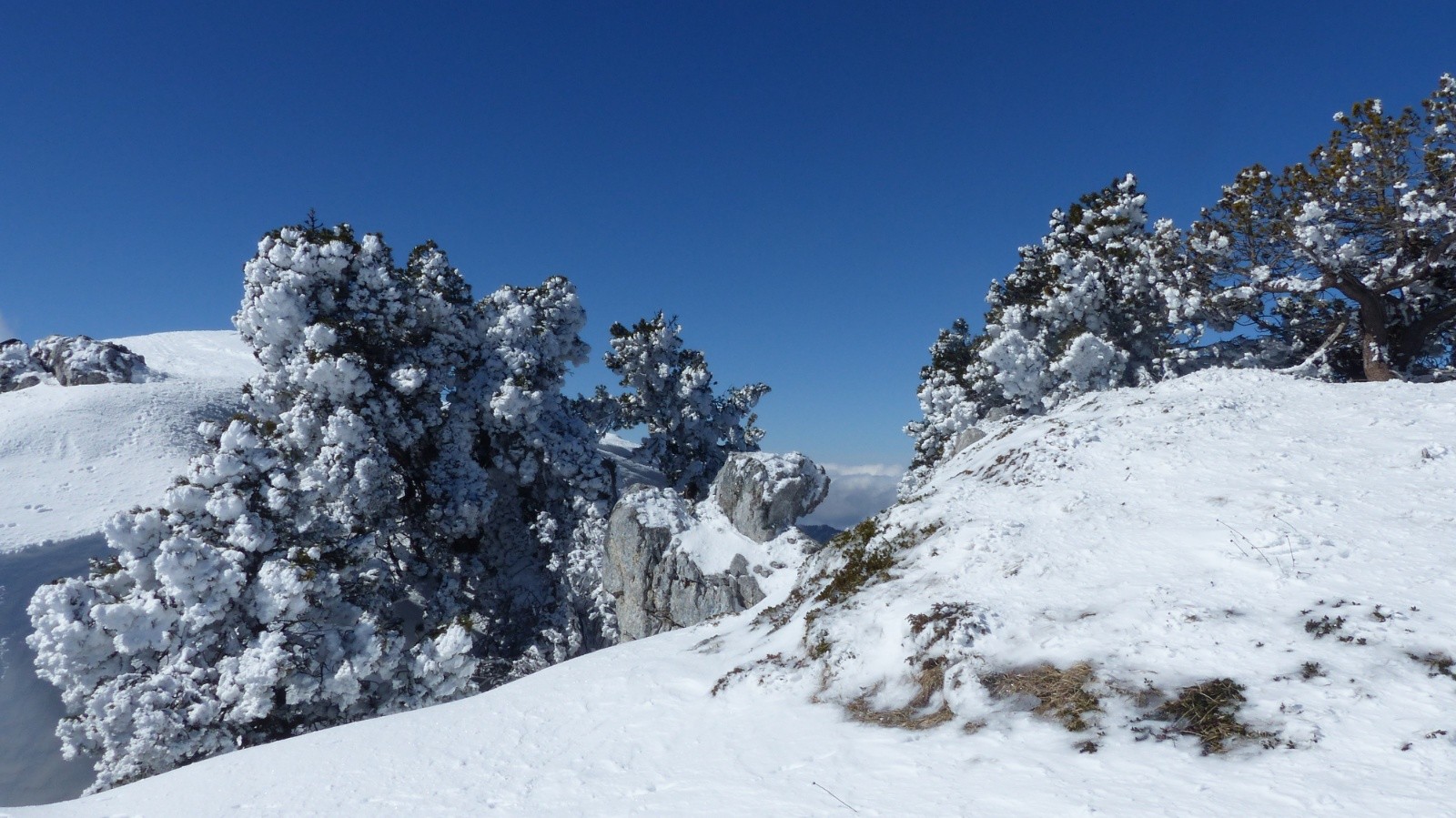 Météo/températures : froid mais sans vent! Départ -2°; grand bleu se couvrant rapidement, puis sombre avec quelques rares et brefs flash ensoleillés, semblait se découvrir à mon départ!