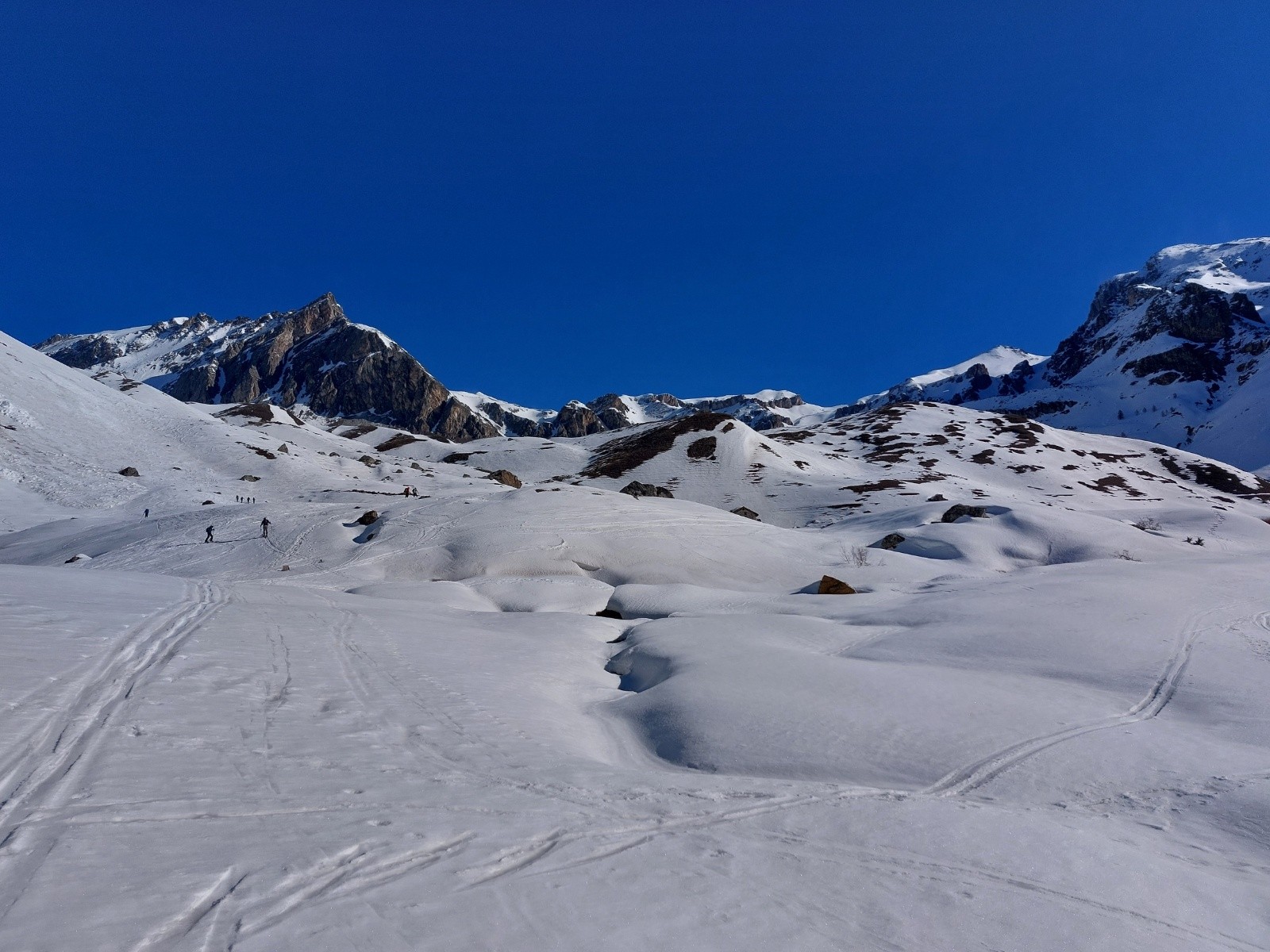 Conditions pour le ski : globalement bonnes dans la moquette parfois un peu lourde. La descente sous le col est à point à 14h , ensuite dessous c'est tout collant même en ouest, on descend un poil trop tard. Les pentes qui sont restées à l'ombre longtemps sont les meilleures, ça déroule en belle moquette jusqu'à rattraper le chemin puis la piste de fond.