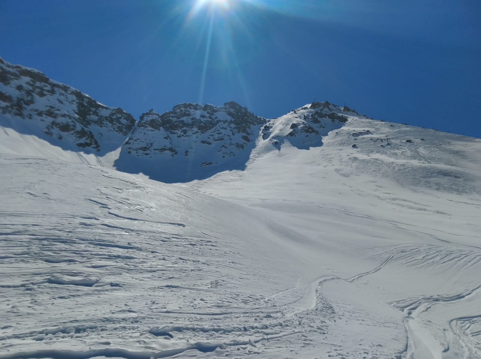 arête sommitale en béton (glace), puis poudre dense, puis poudre tout court dans les 2 1/3 du couloir, cône en poudre parfaite