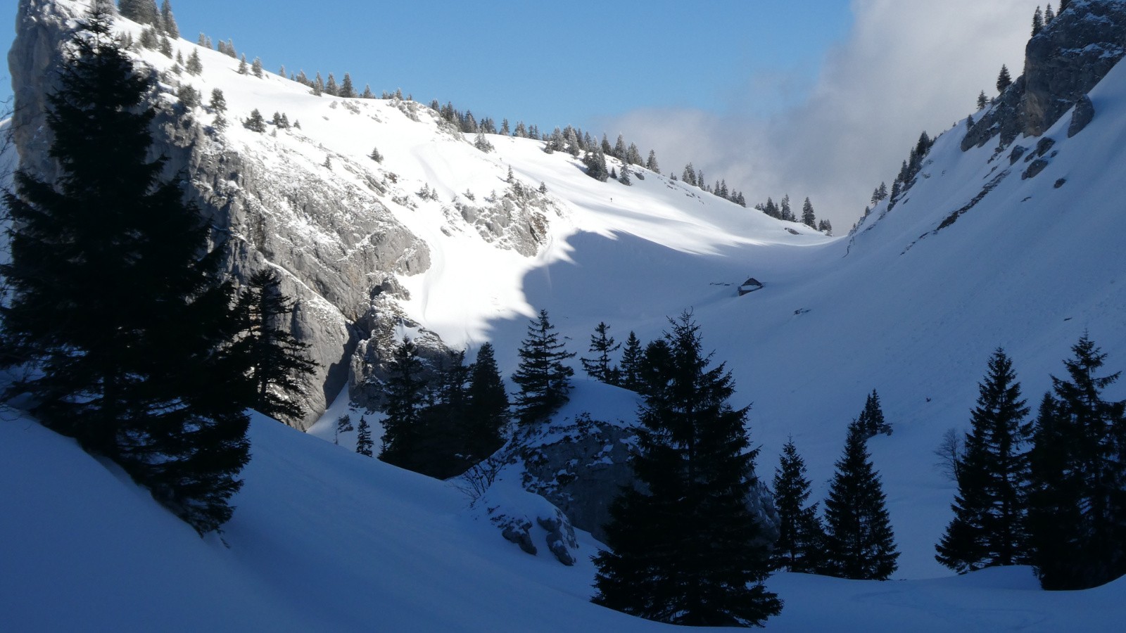 Conditions nivo et activité avalancheuse : apparemment bien stable sur l'itinéraire ; une large coulée de surface en départ de la face W du Grd Som s'étalant au haut de la combe en rive D - en cas de réchauffement rapide ou pluies, le sentier de traverse risque d'être exposé au glissement des masses de neige qui le surplombeSkiabilité : 🙂 Bonne