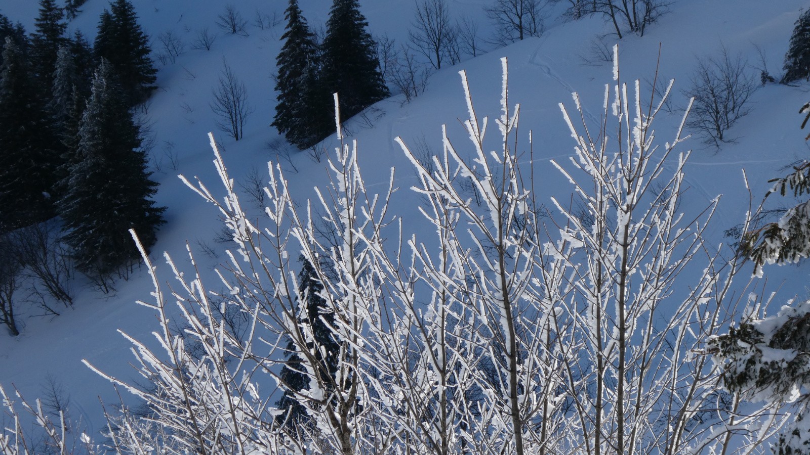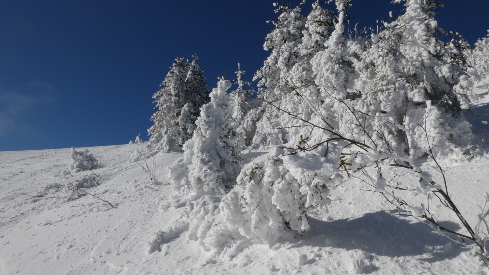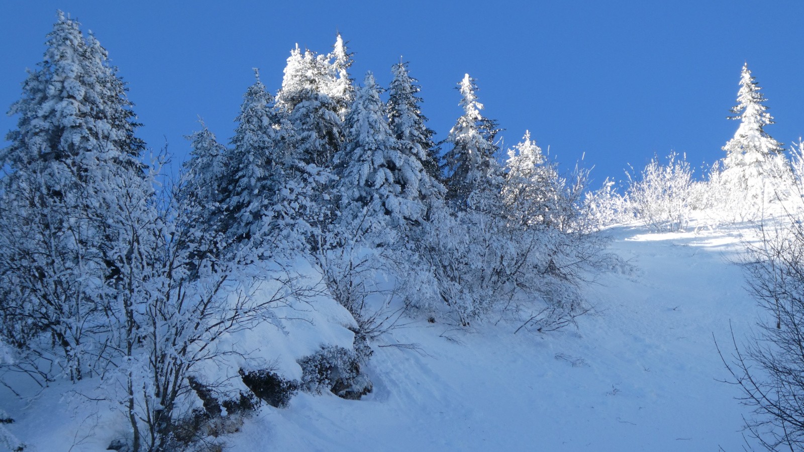 La neige est restée impeccable, douce, poudre un peu tassée par les passages, les sous-bois comme remis à neuf la nuit par une fée bienveillante. Même le chemin de traverse n’est pas retors (mais attention si ça se réchauffe brusquement, il y en a des paquets suspendus au-dessus qui ne demanderont qu’à glisser).
