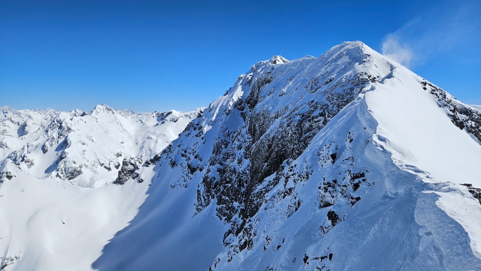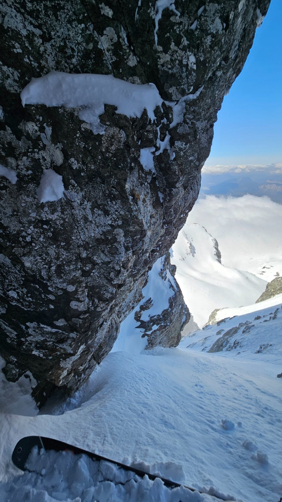 Conditions pour le ski : excellentes dans la diagonale, poudre dense concentrée sur la rive gauche, quelques mètres en glace dans le ressaut inférieur (passé en rappel), le ressaut supérieur est comblé mais étroit (1 m de large) avec un rocher saillant qui émerge dans l'axe, je suis passé en rappel aussi. La pente sommitale côté sud était également en neige fraîche.
