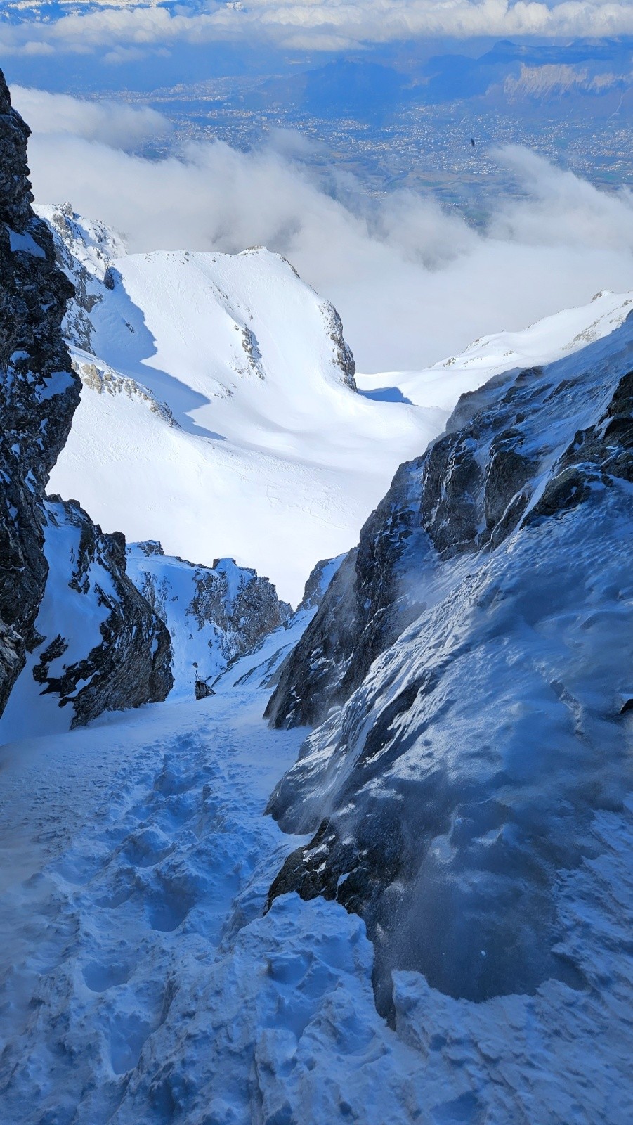 Météo/températures : frais, ciel bleu toute la matinée, rafales et spindrifts intermittents dans le couloir, remontée d'une couche nuageuse épaisse en début d'après-midi.