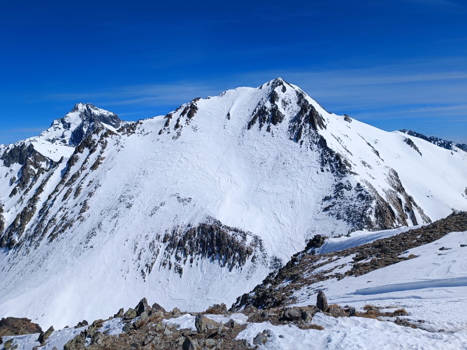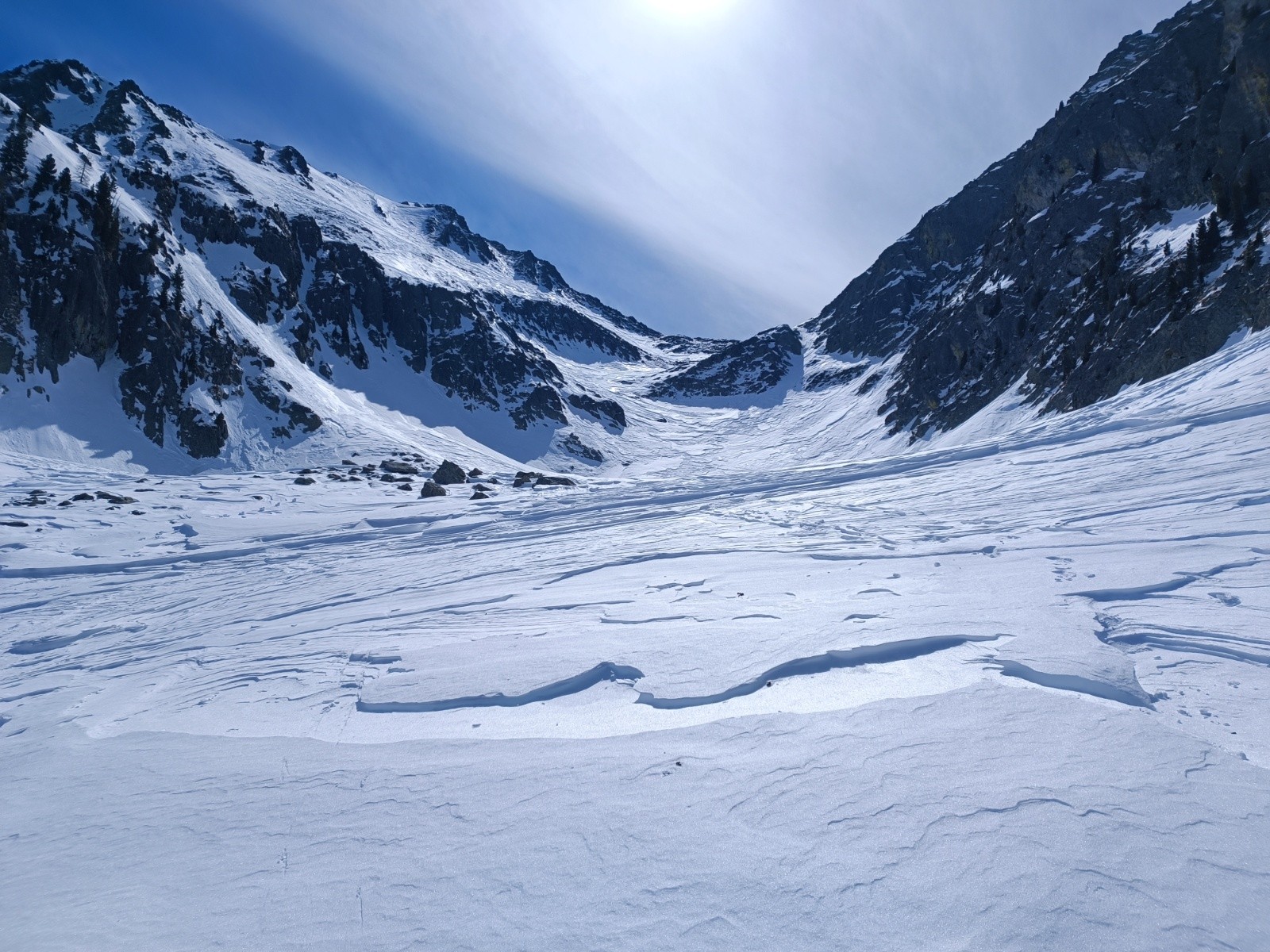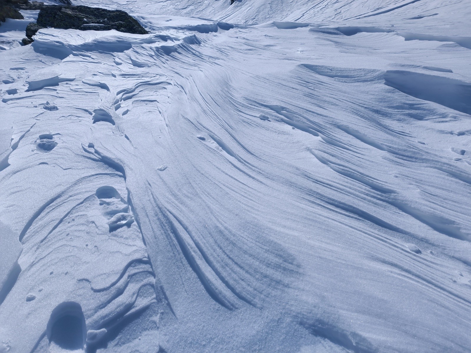 Conditions pour le ski : correctes dans le couloir, neige très travaillée par le vent dans la combe nord