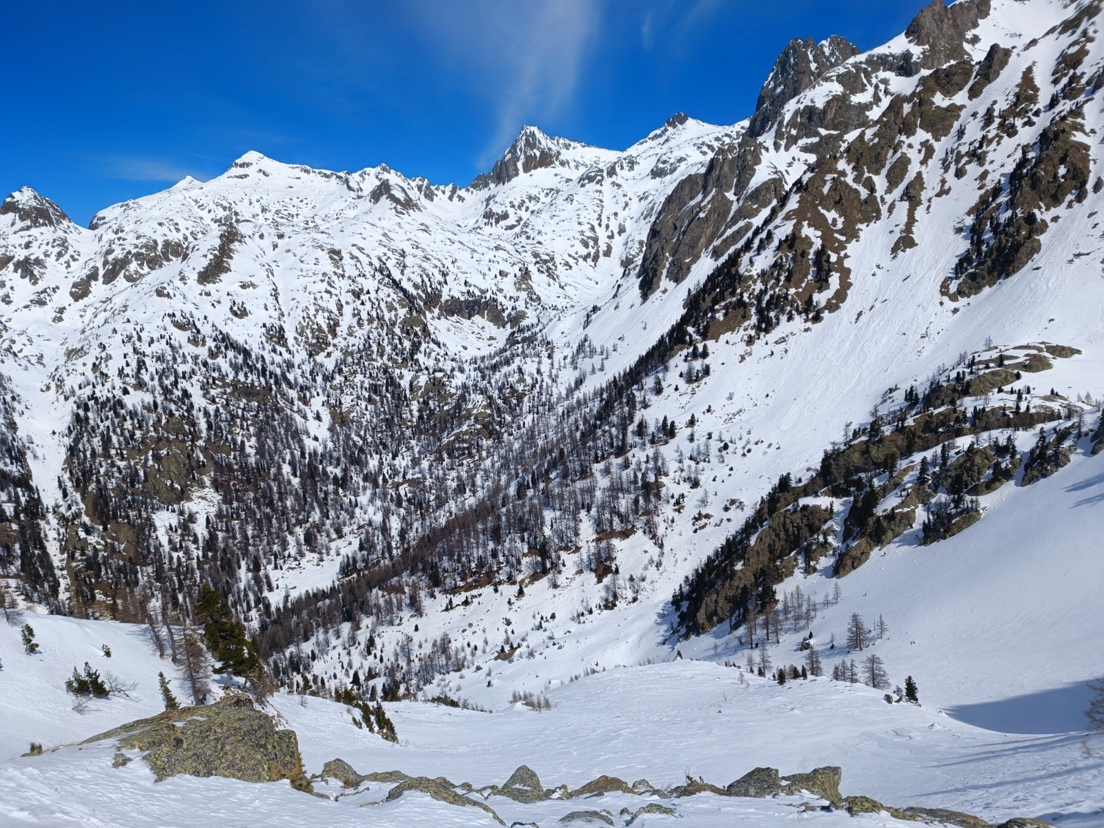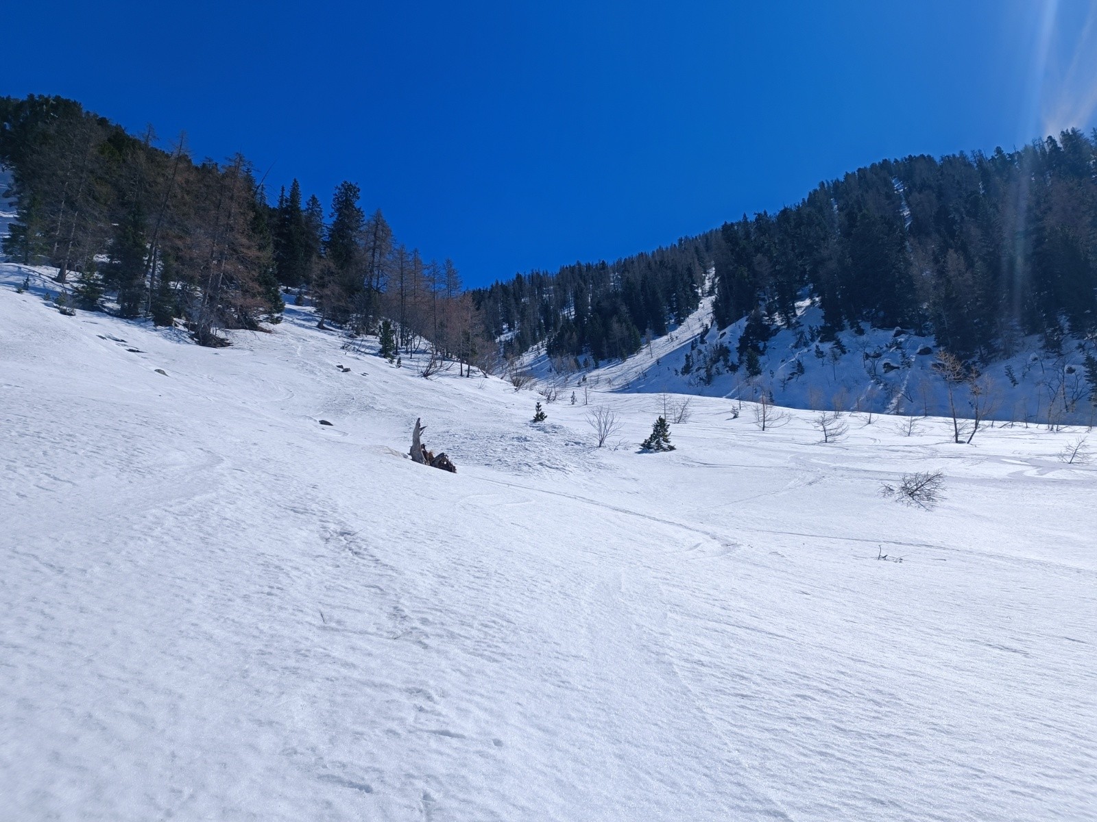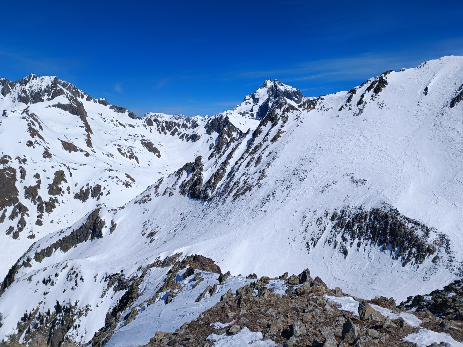 Conditions pour le ski : correctes dans le couloir, neige très travaillée par le vent dans la combe nord