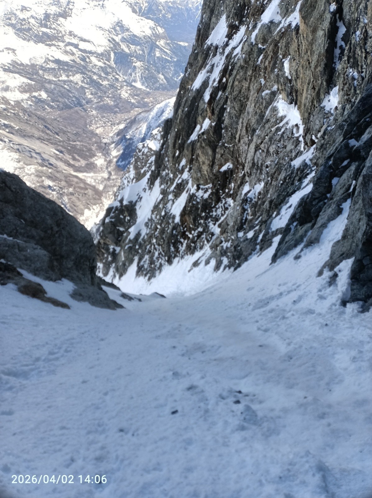 Après avoir descendu environ 150 m de neige pas si mauvaise sur la pente somiale de l'itinéraire , je m'engage ensuite dans 150 m moins bon vieille neige qui avait pris le soleil les jours passés. Puis un rappel de 50 m sur becquet pour passer la dernière longueur de la goulotte Berhault grade 5 en glace, pour s'engager réellement dans l'itinéraire encaissé.