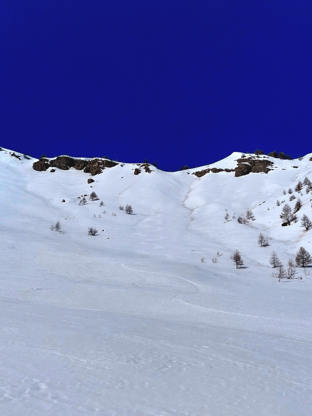 Itinéraire suivi : montée par le bas du ravin du Clot puis cabane du vallon et la crête qui la domine pour sortir au point 2384 et sommet de Pinfol. Descente par une entrée orientée E du haut ravin du Clot puis au plus direct vers le pré Michel. Un peu de skating pour rejoindre Mikéou