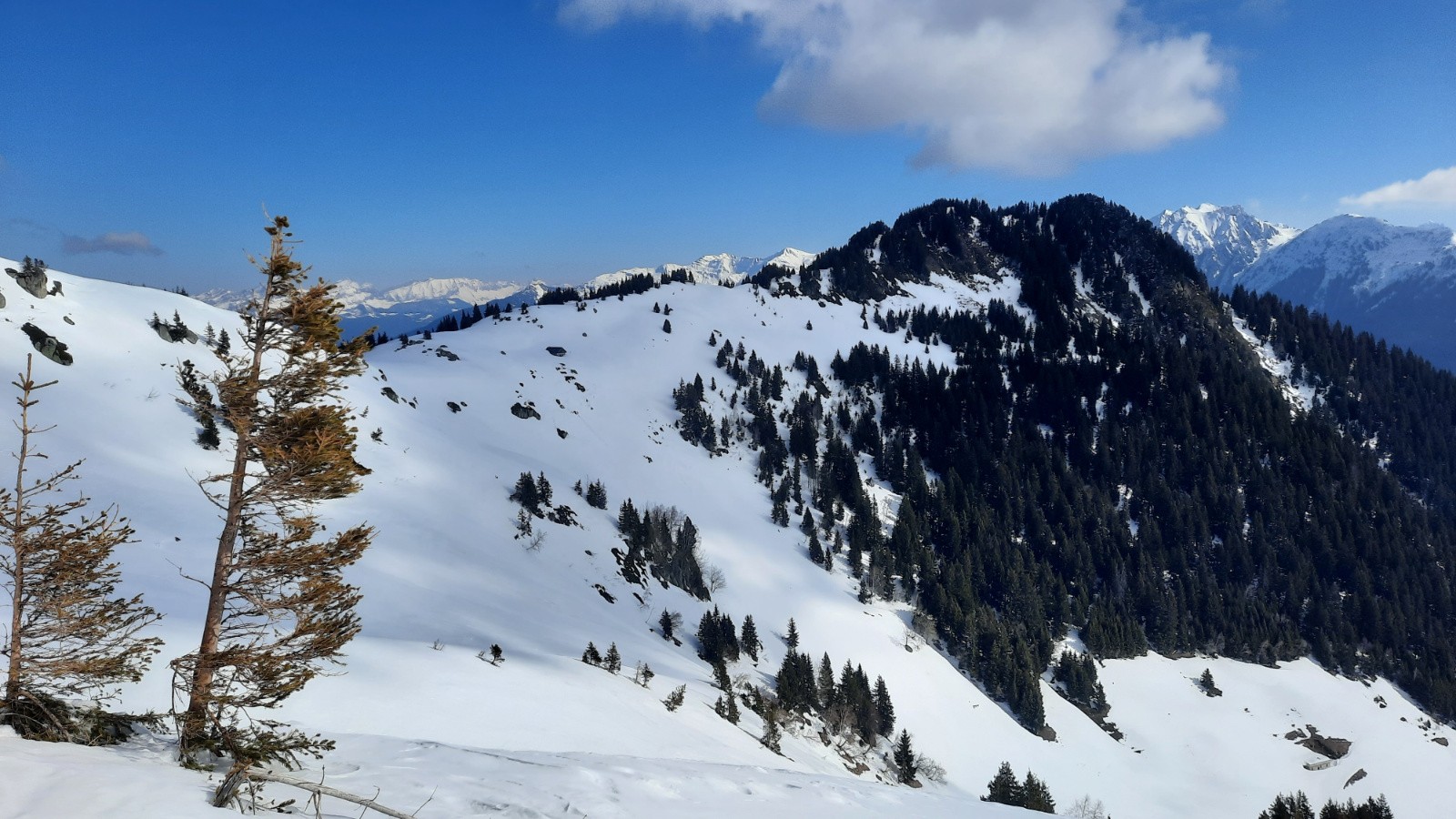 Conditions pour le ski : Il fait chaud. Le regel n'a pas dû être excellent dans la forêt car la neige s'affaisse déjà un peu sous notre poids. Dans le vallon, c'est déjà moquette à 8h30. Les peaux sont donc bien humides quand nous trouvons de la neige (ex-?)froide. Vers 10h00 ça commence à botter vers 1850 jusque vers 2250.