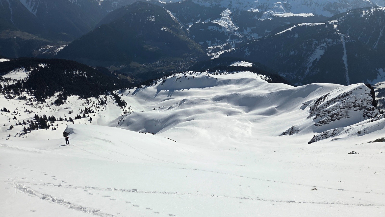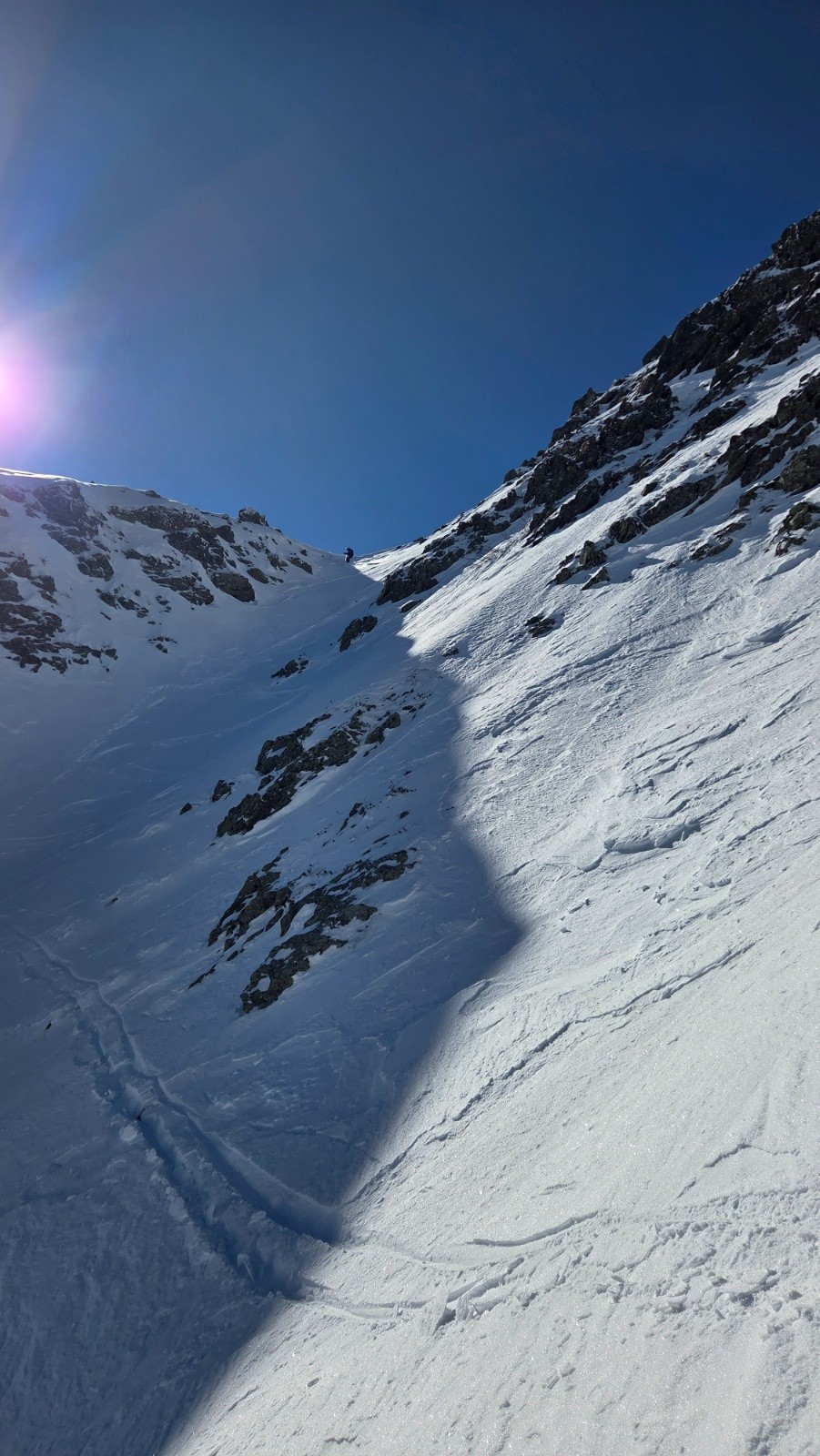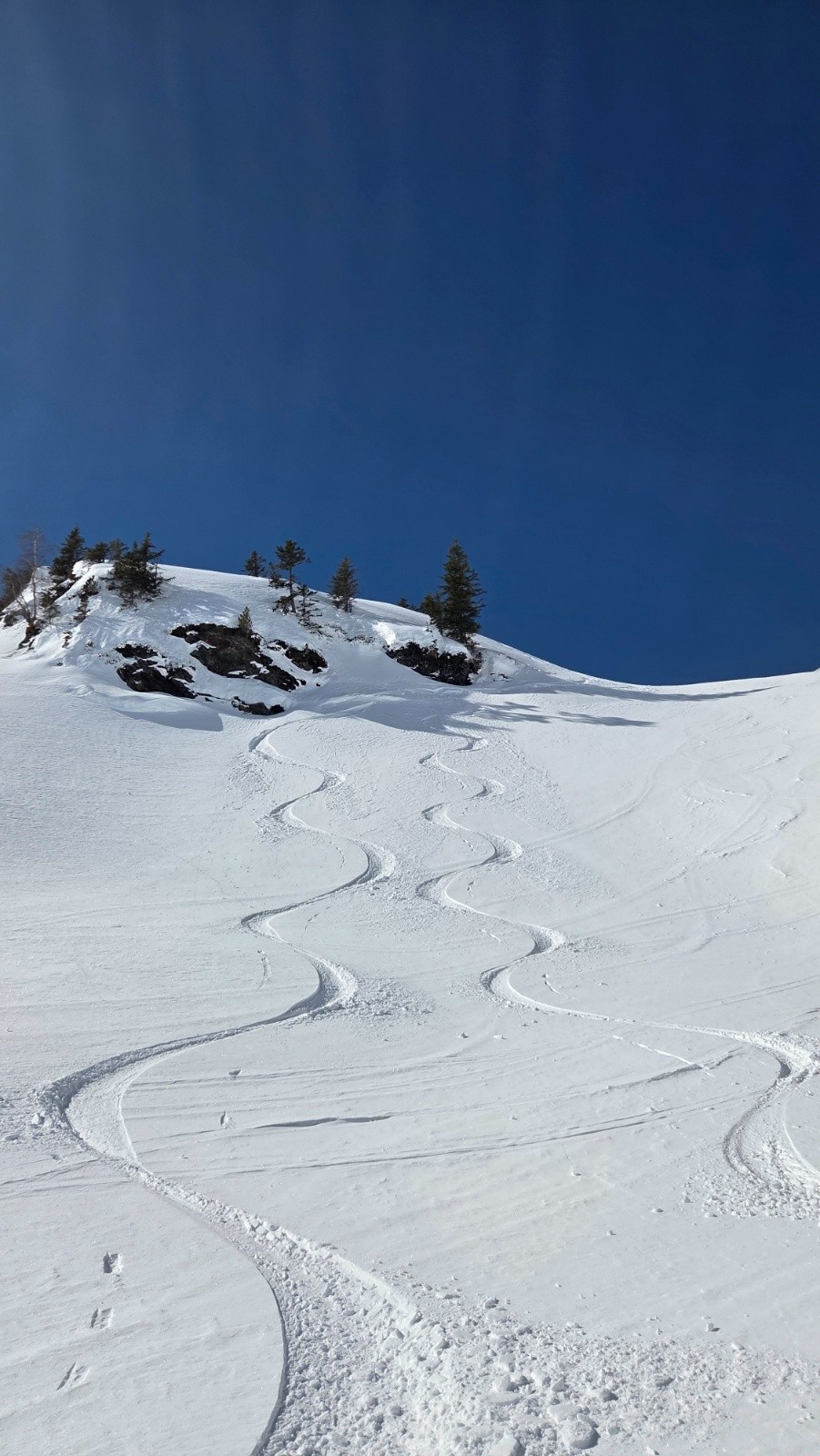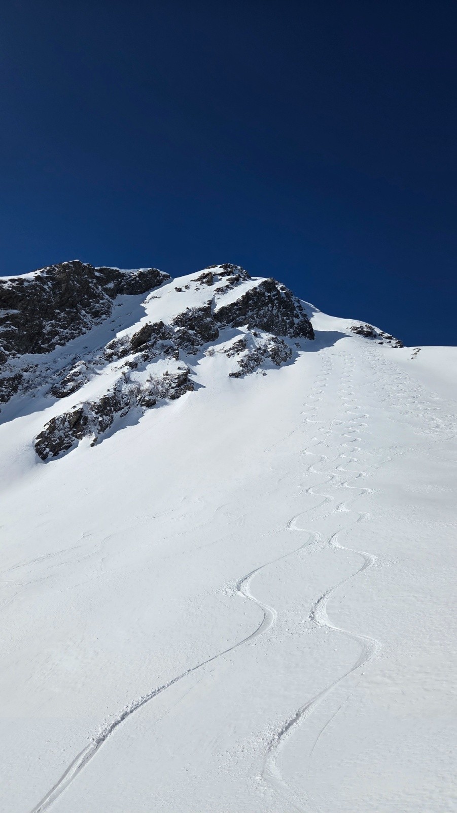 Conditions pour le ski : Excellente. Bon grip dans le couloir puis poudre en orientations NE. Puis décaillage après Cote 2000