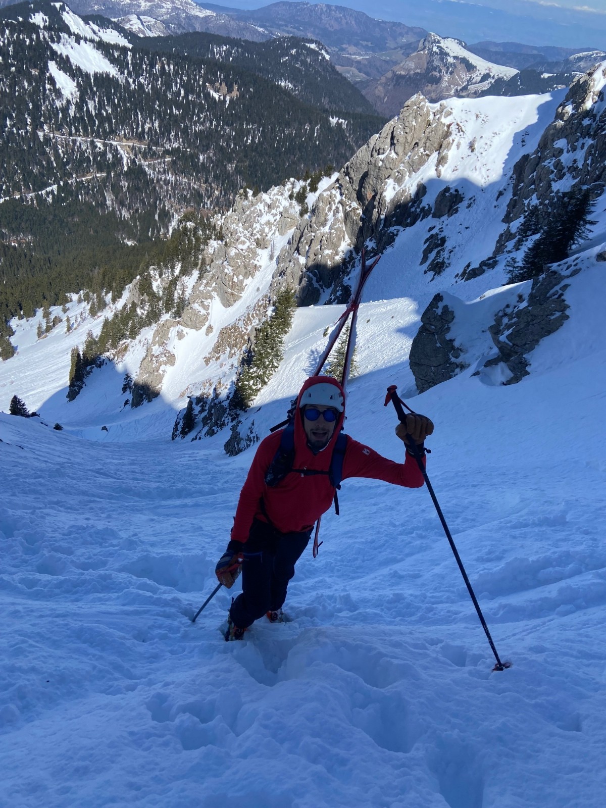 Au début, après les conditions exceptionnelles d’hier dans le coin et une personne qui sortait du couloir central de Chalune en disant que c’était en super conditions, je me suis dit qu’on allait faire pareil aujourd’hui. Mais surprise, en arrivant en haut du couloir W de Pététoz, ça a bien chauffé hier après-midi et une croûte s’est formée. On est quand même descendus dedans (le verrou est enneigé mais skié et assez béton) mais sans grand plaisir. On remonte au pied du couloir central W mais, pas convaincus par la qualité de la neige, on décide de remonter le NW (un bon bout à ski). La neige y est bien froide. En haut, on attaque pour aller sur l’arête mais je bute dans les rochers (il y a une fine couche de poudre pas bien agréable pour mettre les pieds sans savoir si c’est de la roche ou de l’herbe…). On descend un petit peu et après une traversée on remonte un poil plus à droite dans une pente de neige jusqu’à un verrou, pas évident quand même mais faisable si on a un peu l’habitude. On poursuit sur l’arête, et après une pause casse croute, on sort au sommet de Chalune. Descente S dans une moquette lourde, puis remontée au col de Vésinaz et à Chavasse. Descente N poudre. Passage du verrou pour descendre dans le vallon de Chavan > Bellecombe.