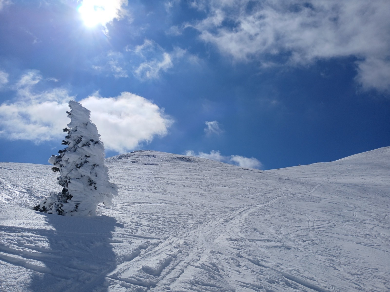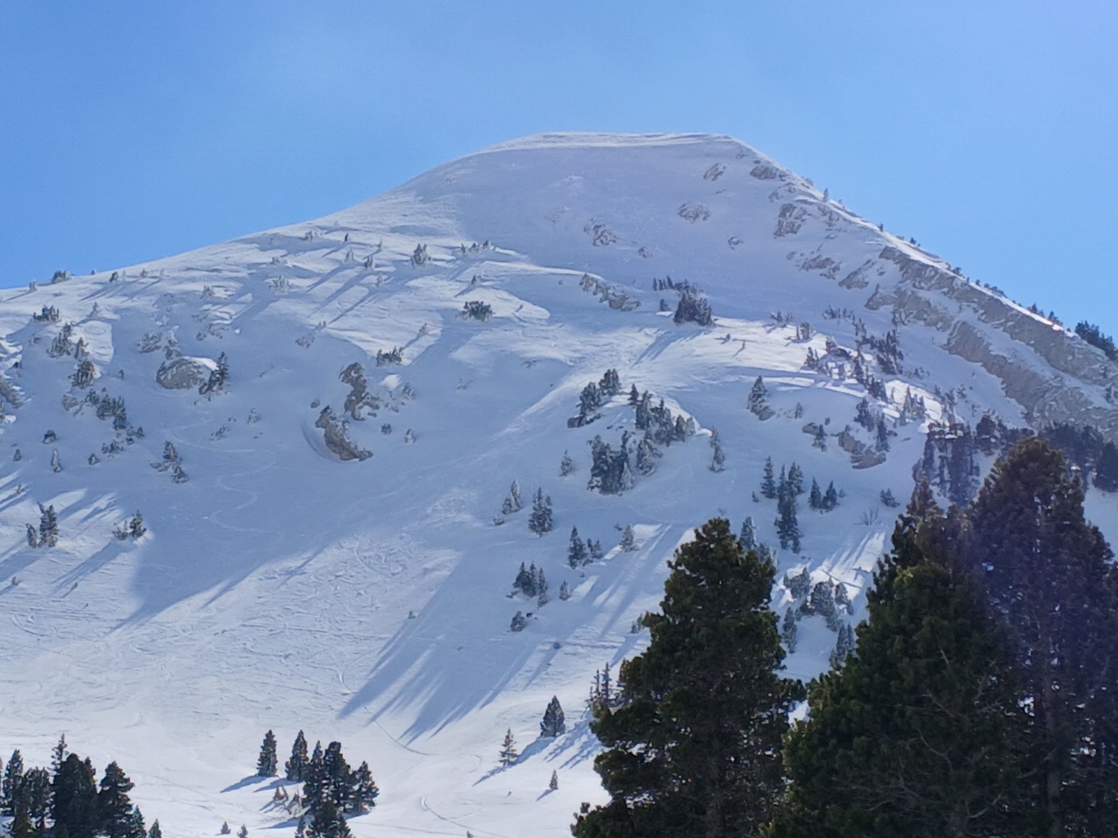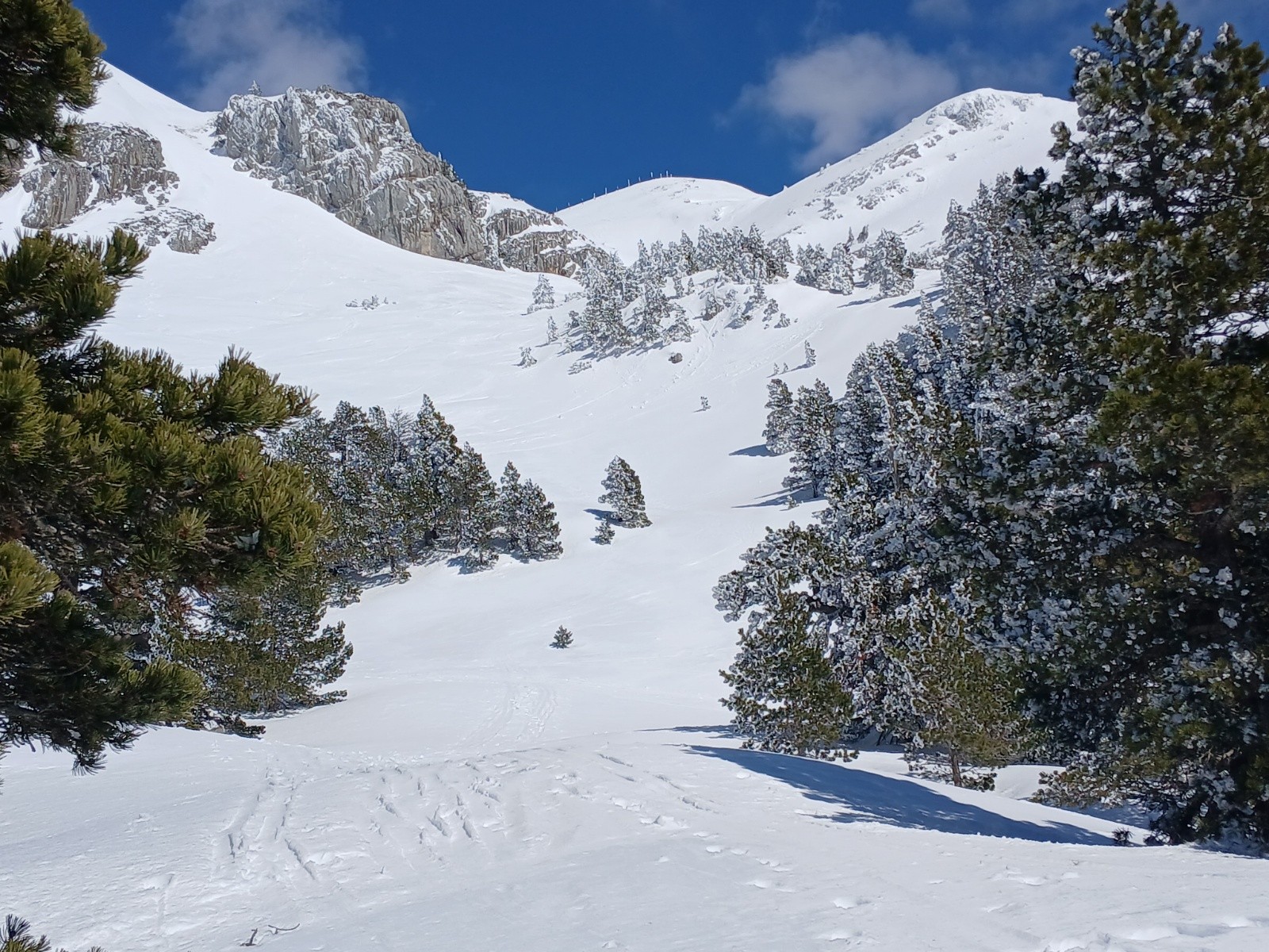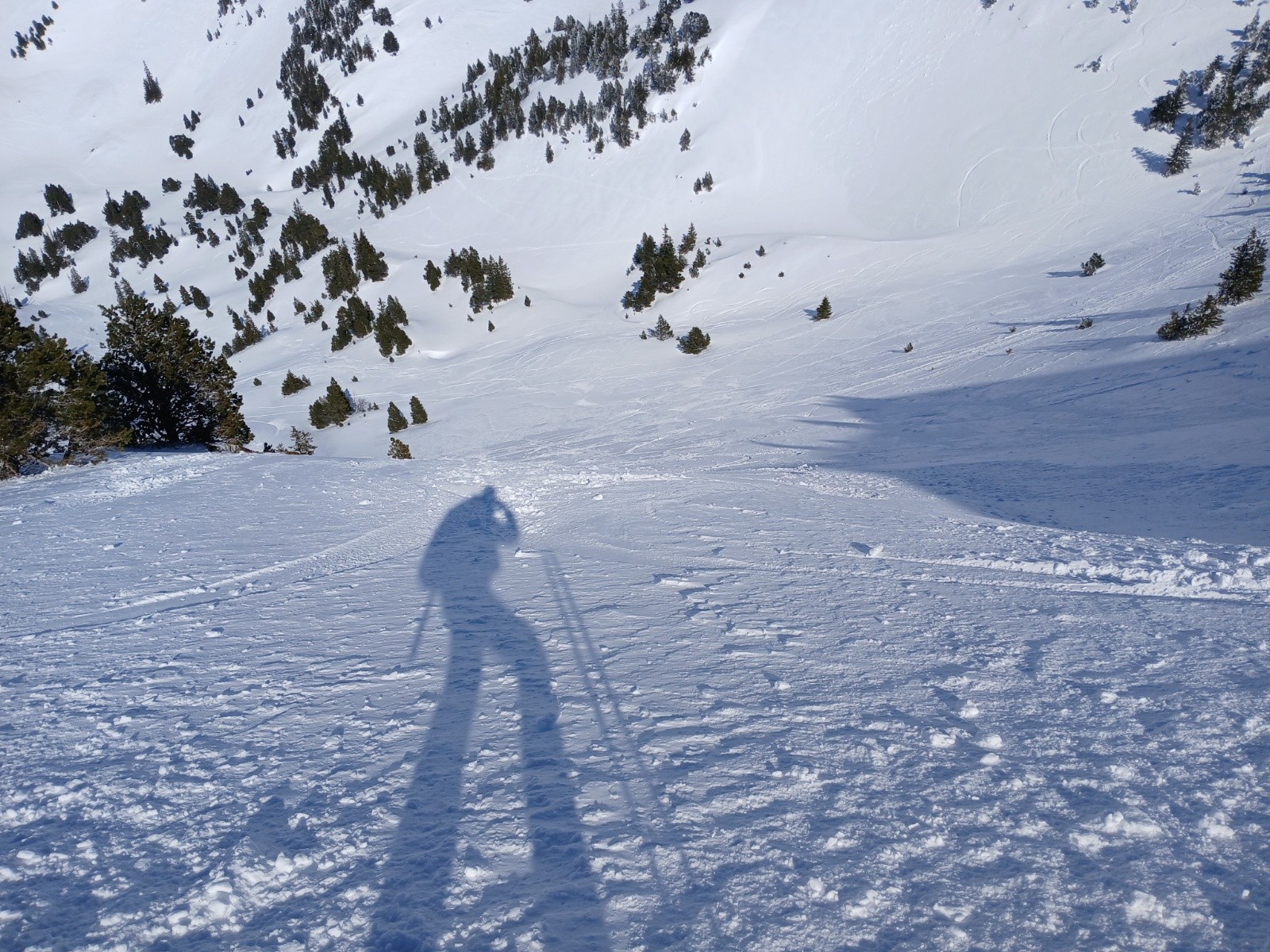 Je n'étais pas dans le super timing pour traquer le décaillage mais on ne fait pas toujours ce qu'on veut. La skiabilité reste correcte car il y a ce qu'il faut mais peut être plus pour longtemps en bas. Mon anti botte m'a sauvé à la montée et à la descente. En cherchant bien on trouve encore de la poudre tassée dans les vieilles accus en face nord de la tête des chaudières mais globalement ce n'est pas très bon, croutée ou soufflée. J'ai repris l'itinéraire de montée où il faut aller skier à l'ombre près des sapins sinon la neige est détrempée, l'ancienne piste passe encore très bien (aucune touchette).