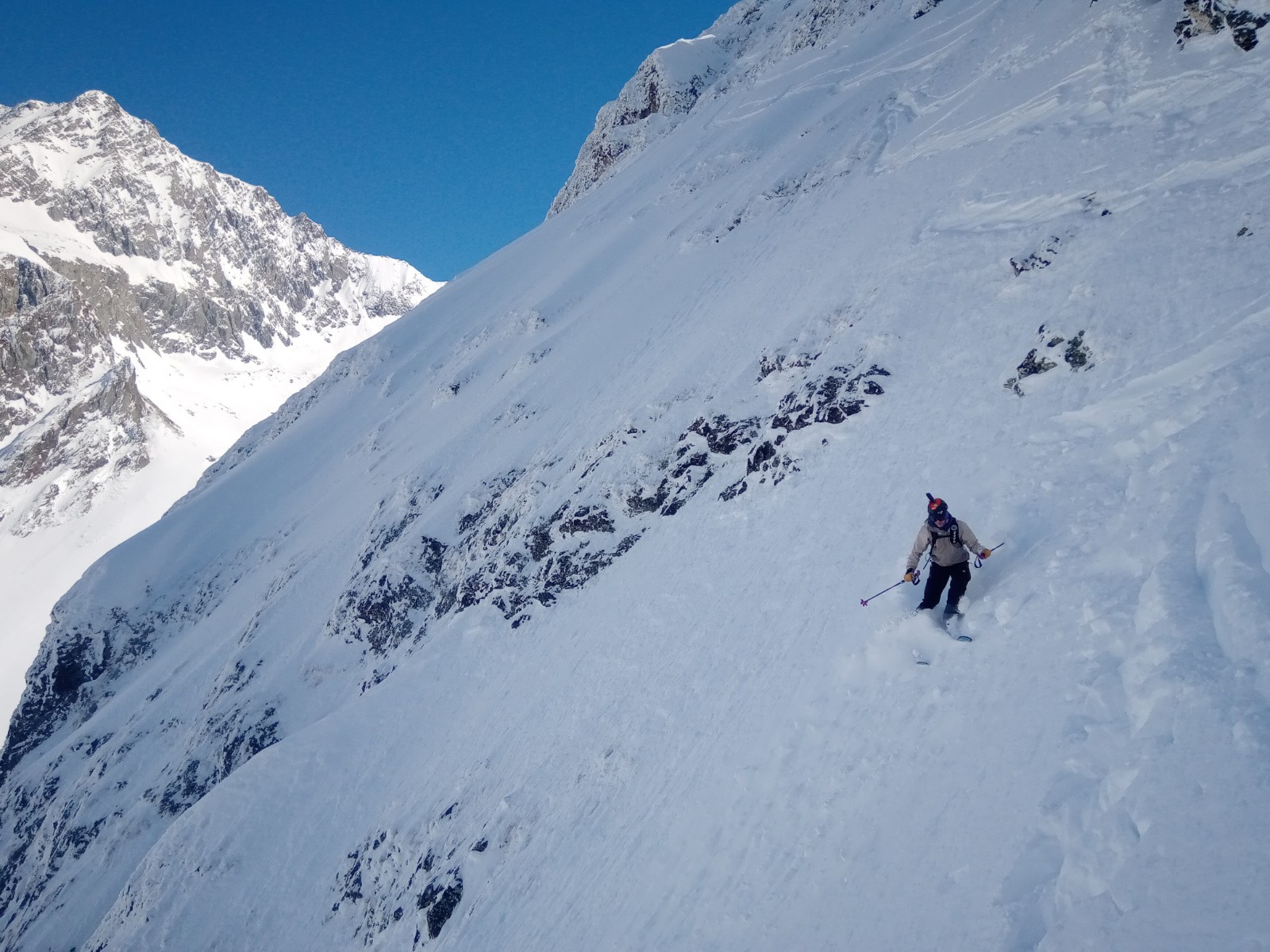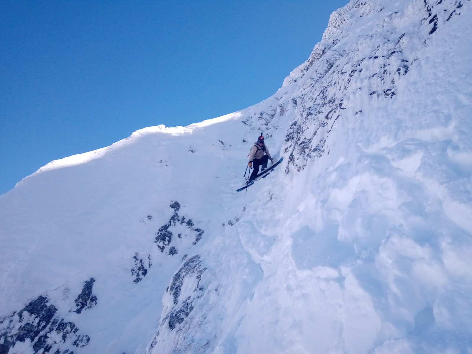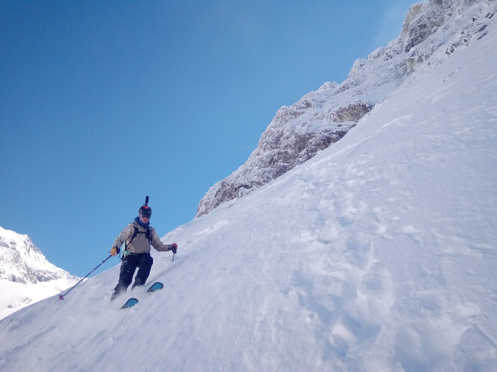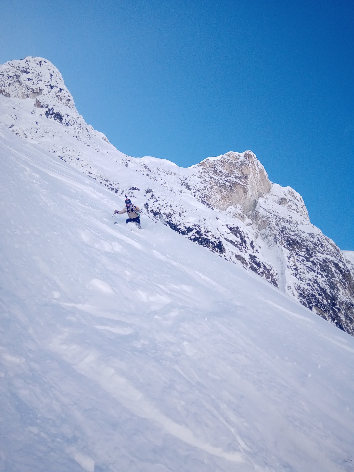 Conditions pour le ski : En nord superbe poudre, en nord raide de la poudre mais aussi faces planes et gobelets sans cohésion, en ouest légère croûte le matin bonne à skier une fois réchauffée, en sud en bas début de moquette un peu collante