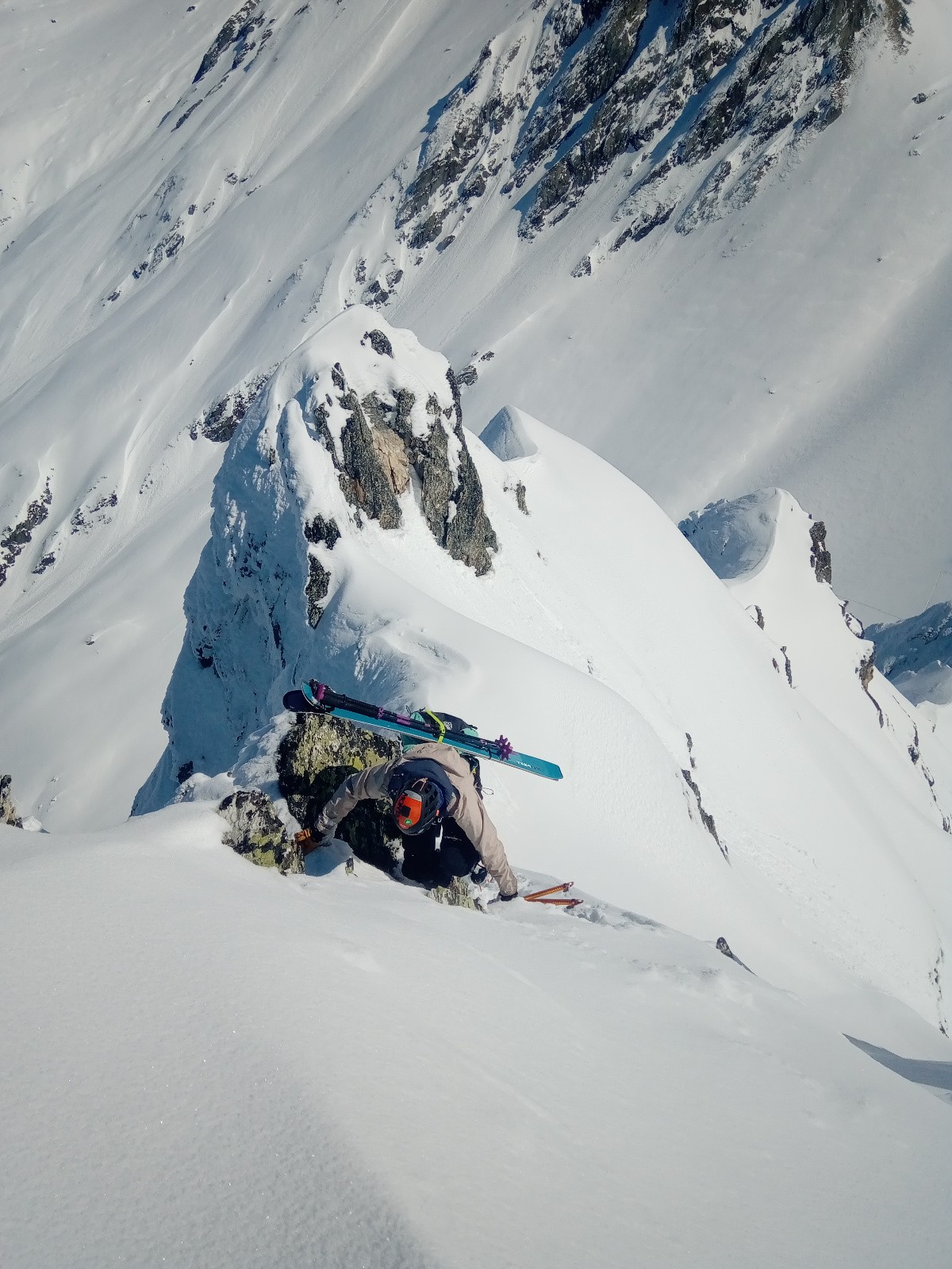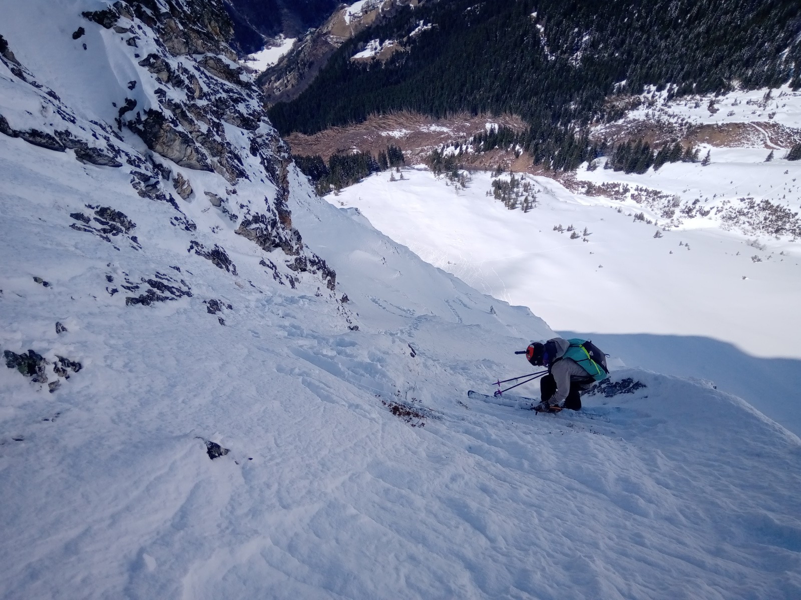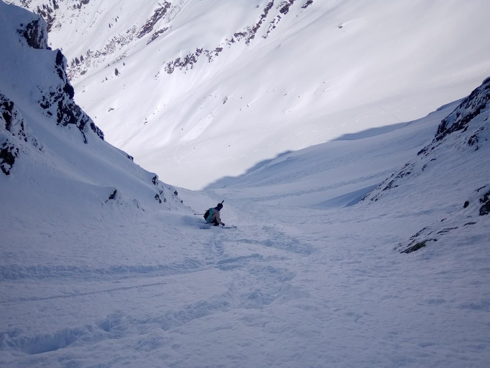 Et bien ça aura attendu 7 ans, comme le temps file bordel. Mais maintenant Paulo est guide et pas dispo, c'est donc avec l'ami Gaël que l'affaire se conclu. Et on bien failli buter de la même manière ! Brassage monstrueux, 10 fois j'ai cru qu'on butait parce qu'on n'arrivait plus à progresser vers le haut, la neige au torse avec les pieds qui partent dans du sans fond. Puis de nouveau dans le finish les rochers sous la neige déstructurée, est-ce que les skis pourront rester en surface ? 4h30 pour 1100d+, c'est dire l'horreur. Mais on fini par sortir, et alors qu'on avait la certitude de devoir faire un peu de désescalade à la descente en fait tout passe à skis, et quand ce n'est pas une partie technique c'est bien freeride. Un bon mélange en bonne proportion de freeride et de dryski en fait, très plaisant.