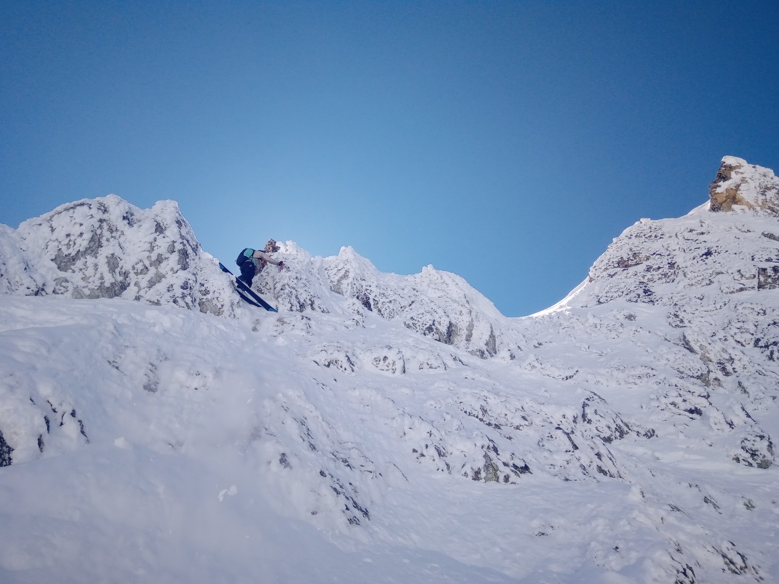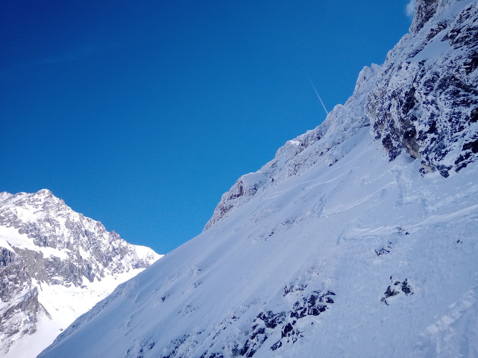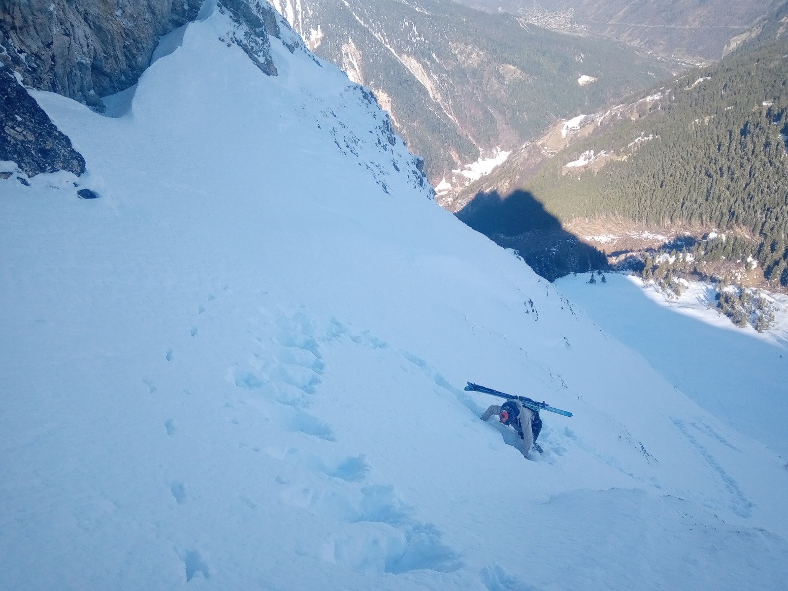Et bien ça aura attendu 7 ans, comme le temps file bordel. Mais maintenant Paulo est guide et pas dispo, c'est donc avec l'ami Gaël que l'affaire se conclu. Et on bien failli buter de la même manière ! Brassage monstrueux, 10 fois j'ai cru qu'on butait parce qu'on n'arrivait plus à progresser vers le haut, la neige au torse avec les pieds qui partent dans du sans fond. Puis de nouveau dans le finish les rochers sous la neige déstructurée, est-ce que les skis pourront rester en surface ? 4h30 pour 1100d+, c'est dire l'horreur. Mais on fini par sortir, et alors qu'on avait la certitude de devoir faire un peu de désescalade à la descente en fait tout passe à skis, et quand ce n'est pas une partie technique c'est bien freeride. Un bon mélange en bonne proportion de freeride et de dryski en fait, très plaisant.