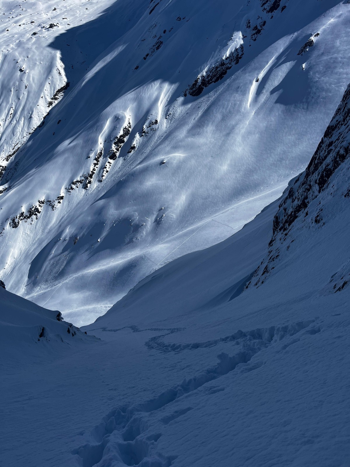 Conditions nivo et activité avalancheuse : Sluff avec la quantité de gobelet, purge sous les skis en Est/Sud-Est bien réchauffée.