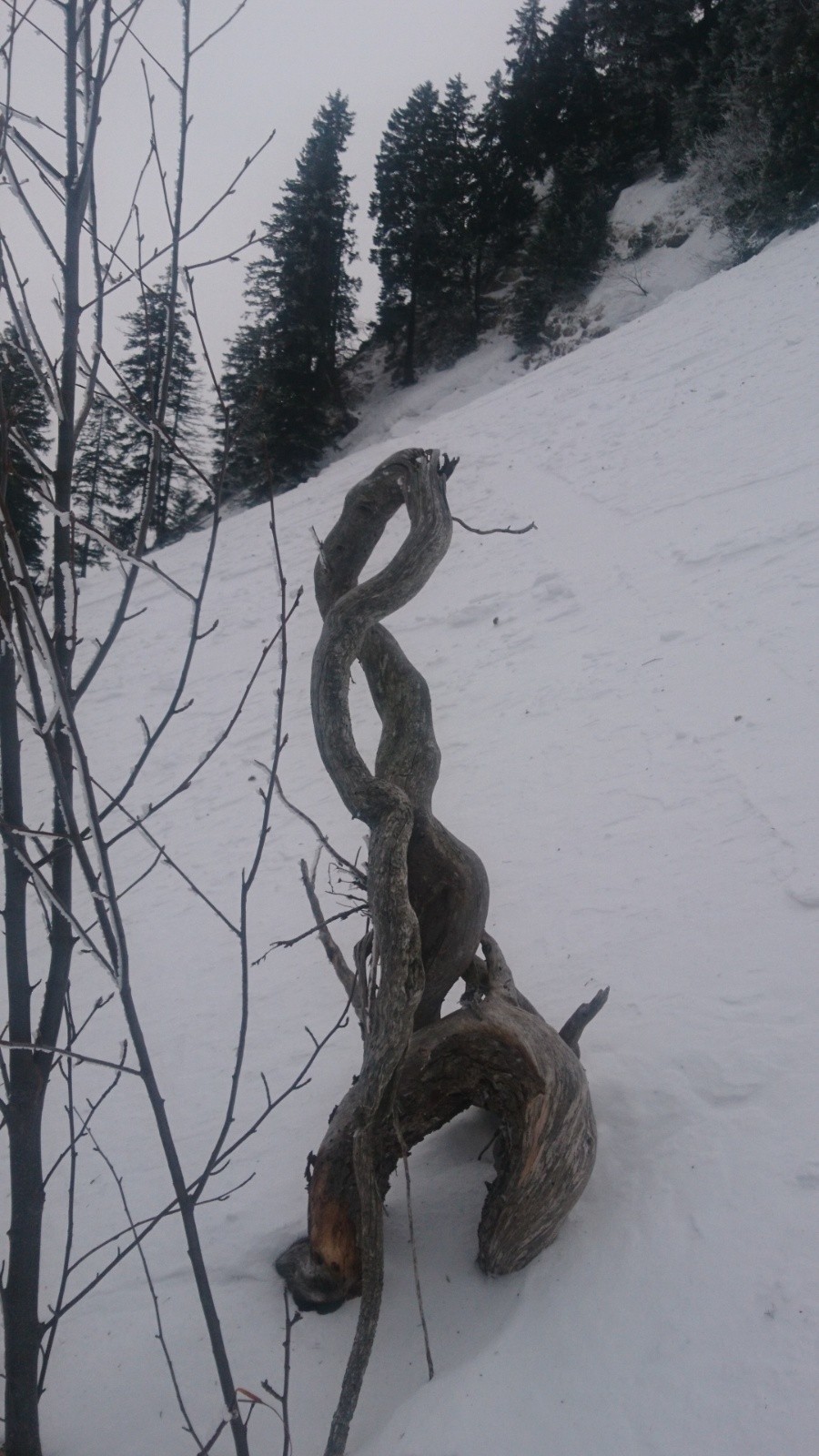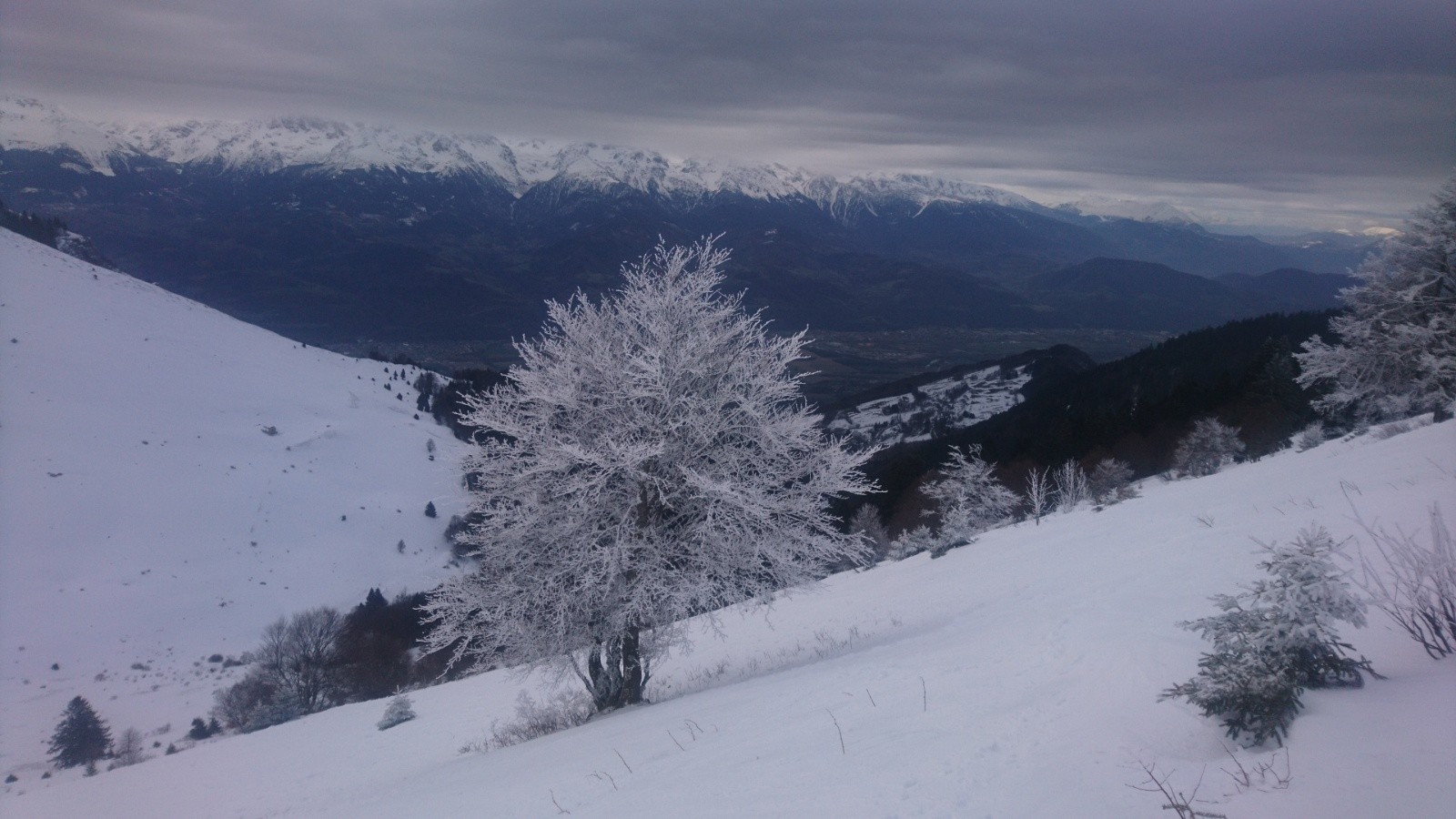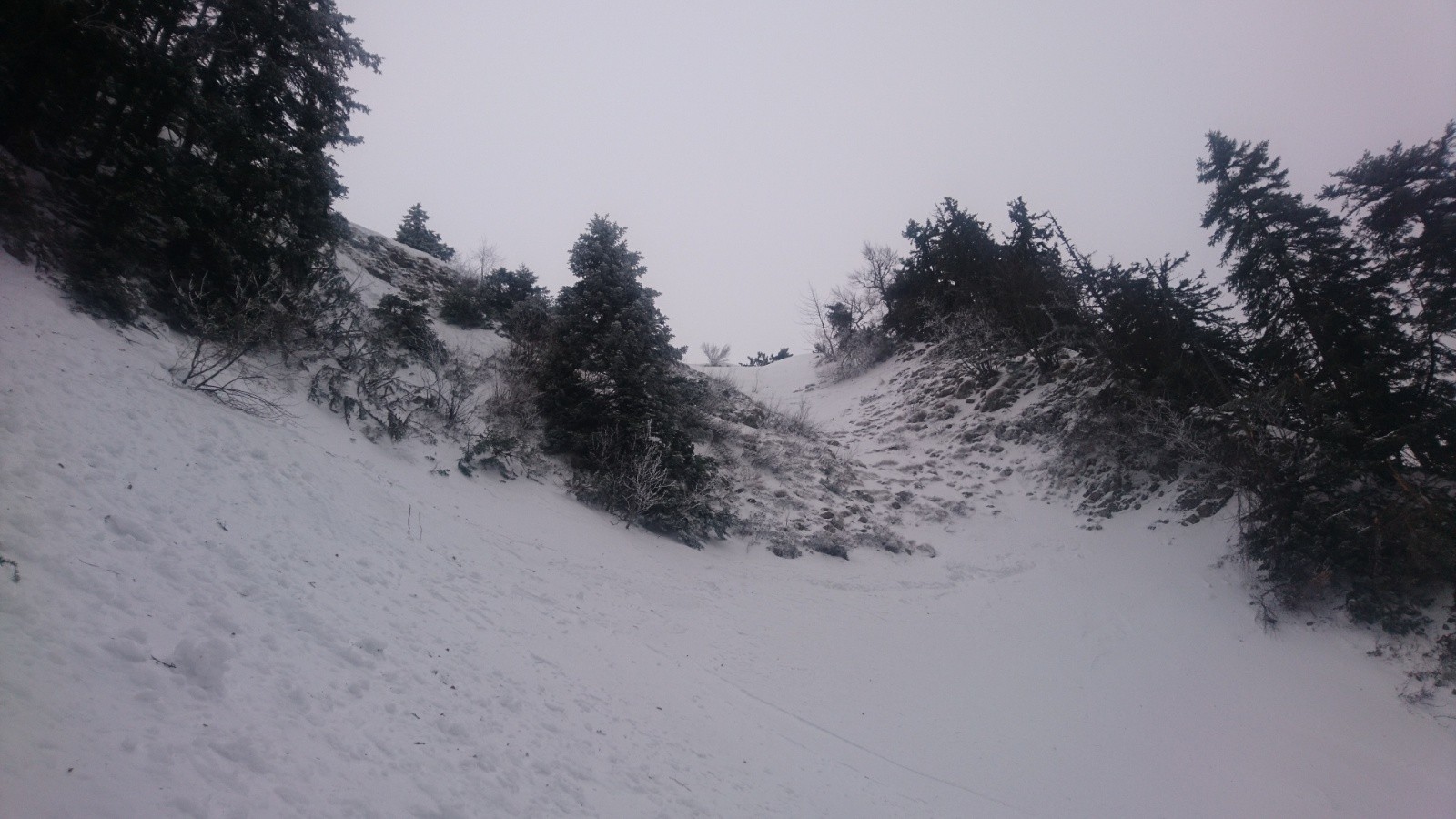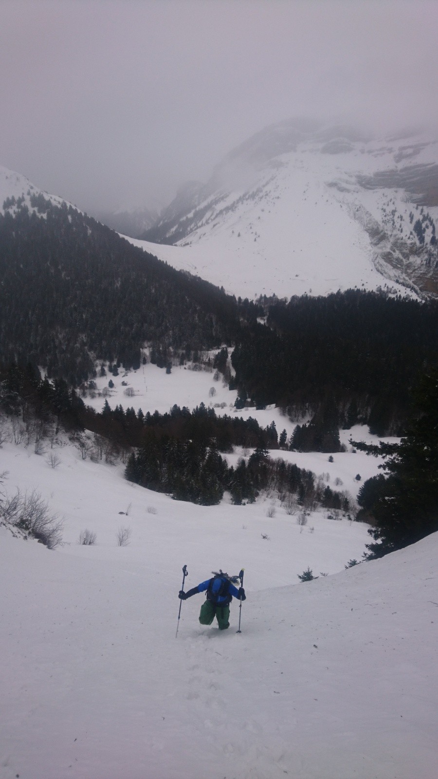 Itinéraire suivi : prvouta par la prairie, encore enneigé, descente à l'ouest, trafolze dans la clairière, excellente poudre en sous bois, mais trop d'arbres.