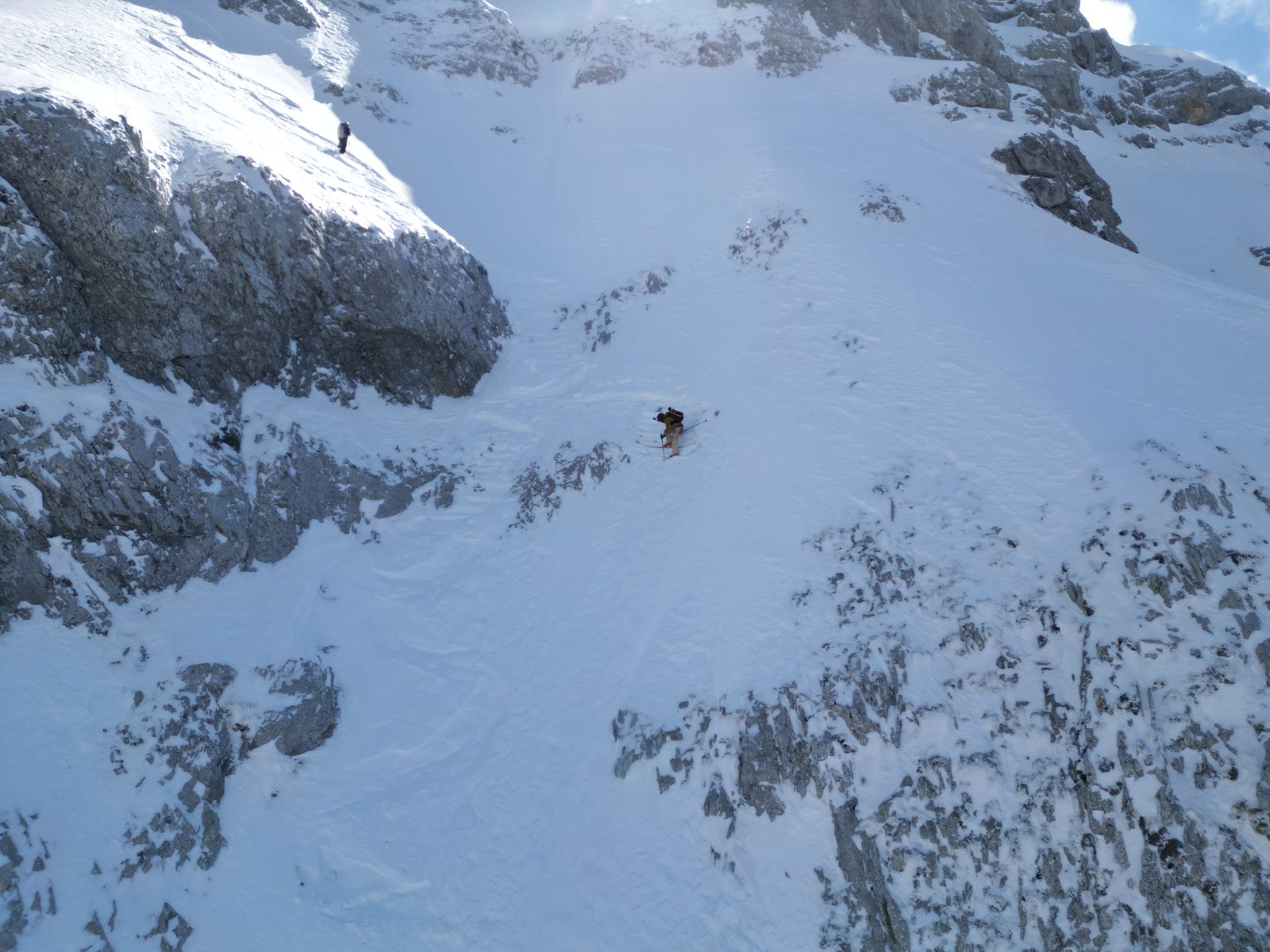 C’est joli, c’est assez variable mais un peu flippant avec des accus prononcées. On test et rien ne bouge on va d’îlots en îlots. Sous le goulet c’est délicat sur un passage où la neige est posée sur le rocher au bord du vide, on traverse ensuite et skions au bord du gaz et du relais de 50m. C’est pas confortable on doit faire la manip à 2/3m au dessus car juste au bord en caillou/glace et un gros gros gaz 2m dessous.