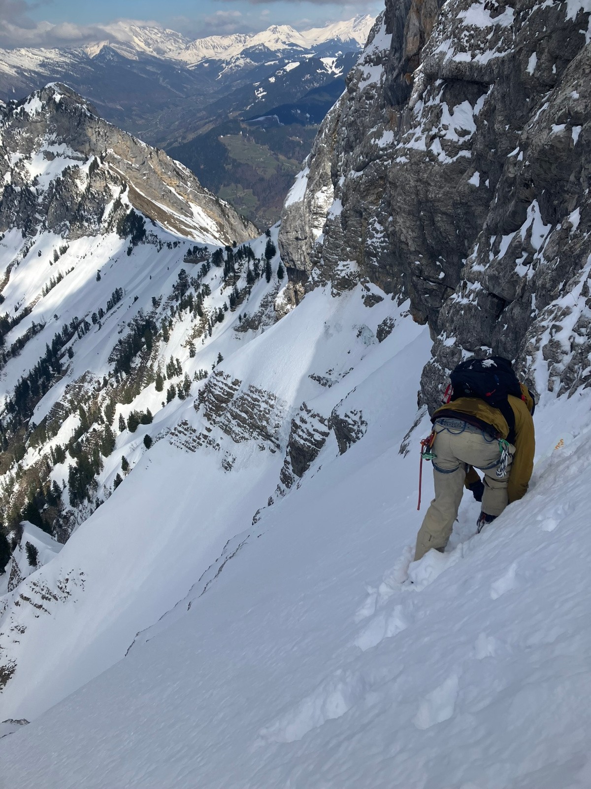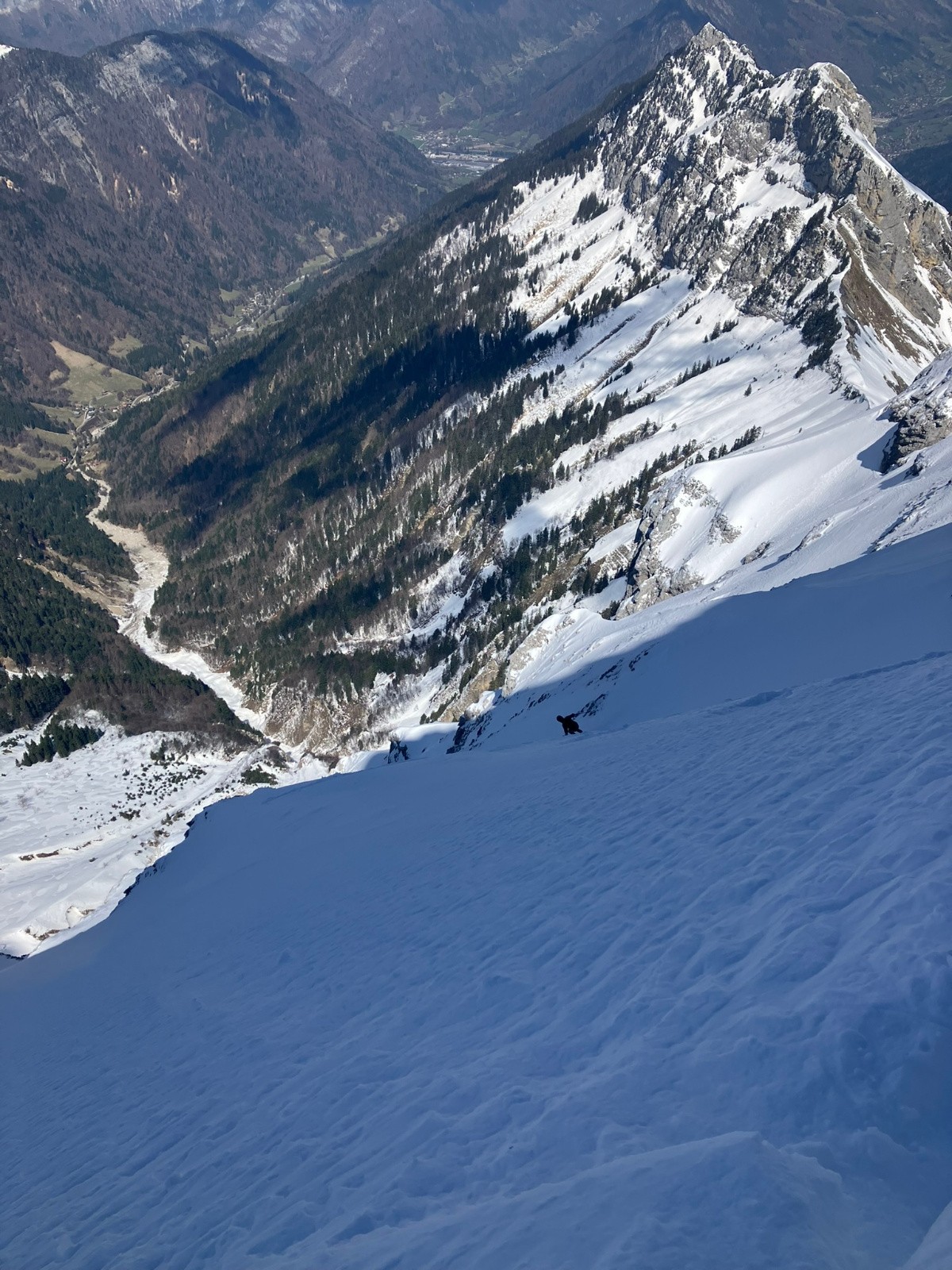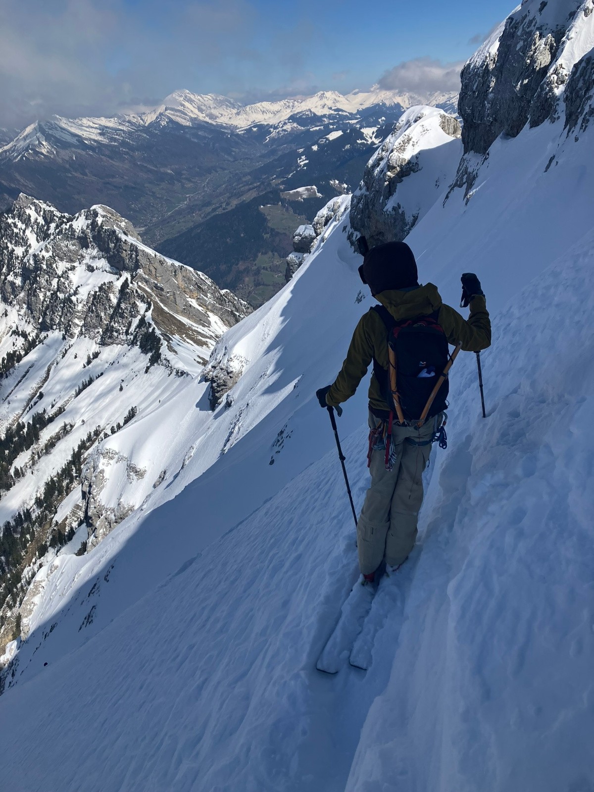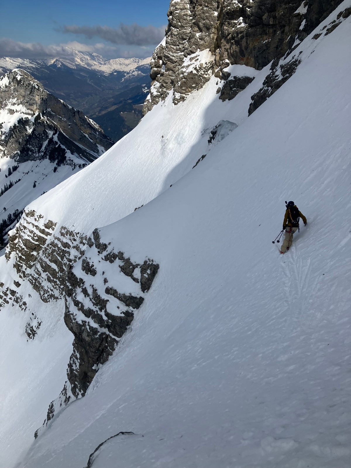 2 bonnes courbes pour rejoindre le 2e rappel de 15m et nous voilà dans la partie skiante où on déroule le ski, plaisant. On continue jusque la vire qui se dévoile au dernier moment. C’est très très raide et malcommode, expo . On se contreassure seuls, de manière assez psycho, l’arbre étant bien bien désaxé on a pas envie de prendre le pendule et plomb de l’année sur 5mm.