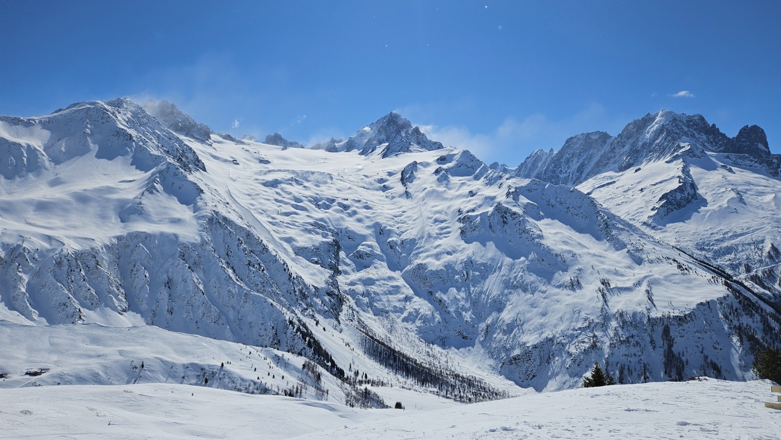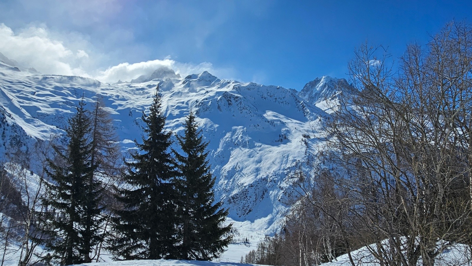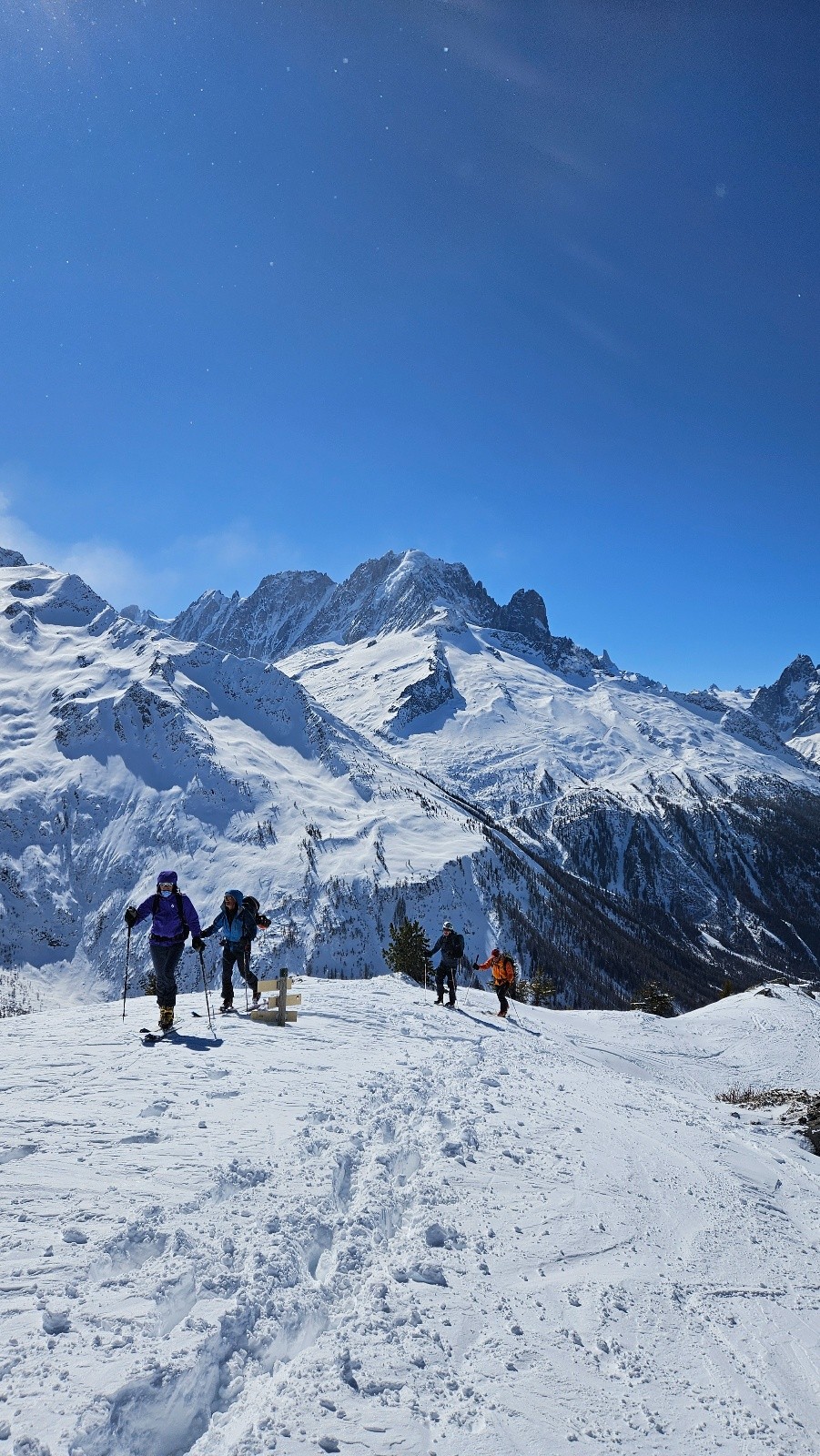 La Flegere fermée pour cause de bise violente, donc c'est mort pour la traversée prévue Col des Crochues - Glacier du mort, un plan B s'organise au départ du Tour pour tenter (avec +/- de succès) de s'abriter de la bise glaciale. Bon plan, la redescente sur le Buet etait top et l'idée - pour les plus courageux qui n'ont pas immédiatement cédé à la tentation de la terrasse de l'hotel du Buet - de remonter a Praz Torrent excellente, neige poudreuse a la descente ds le vallon puis legerement transfo dans le bas juste au dessus de la station