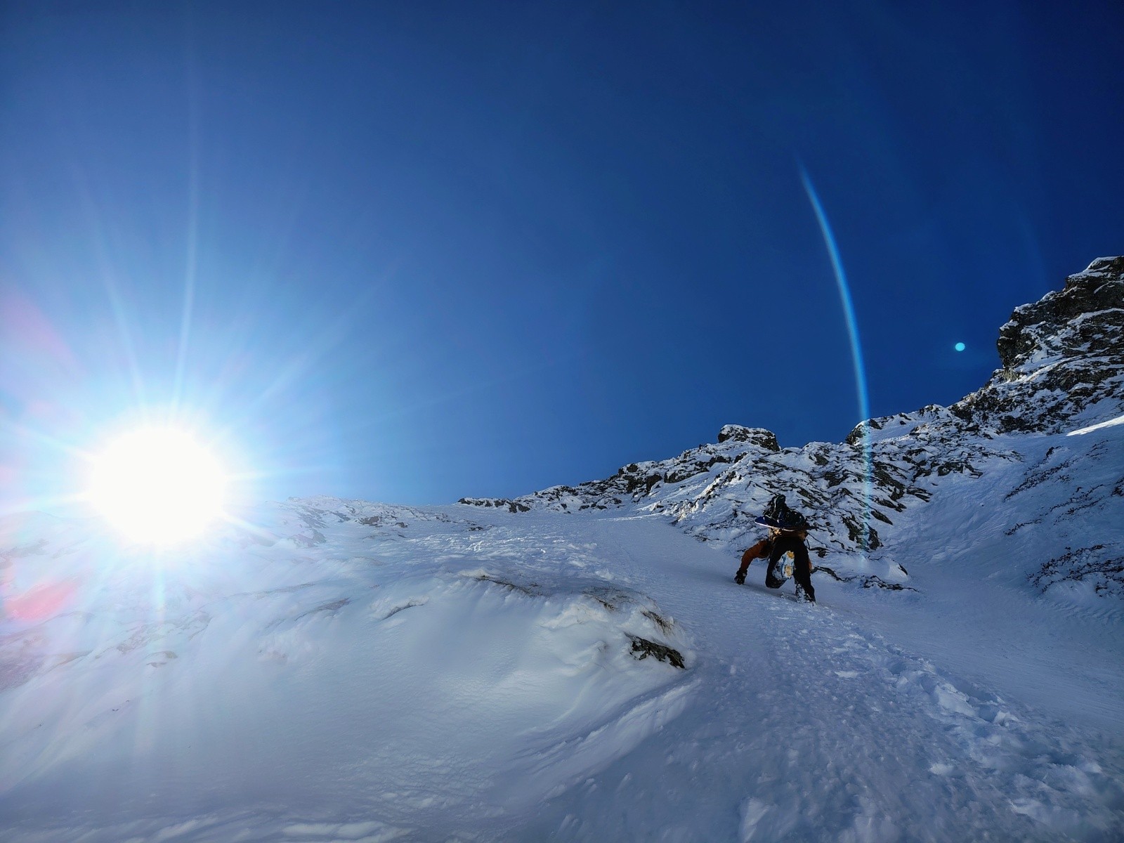 Itinéraire suivi : variante directe dans la face en A/R. Globalement très bon remplissage avec 2/3 étroitures à négocier avec plus ou moins d'élégance.