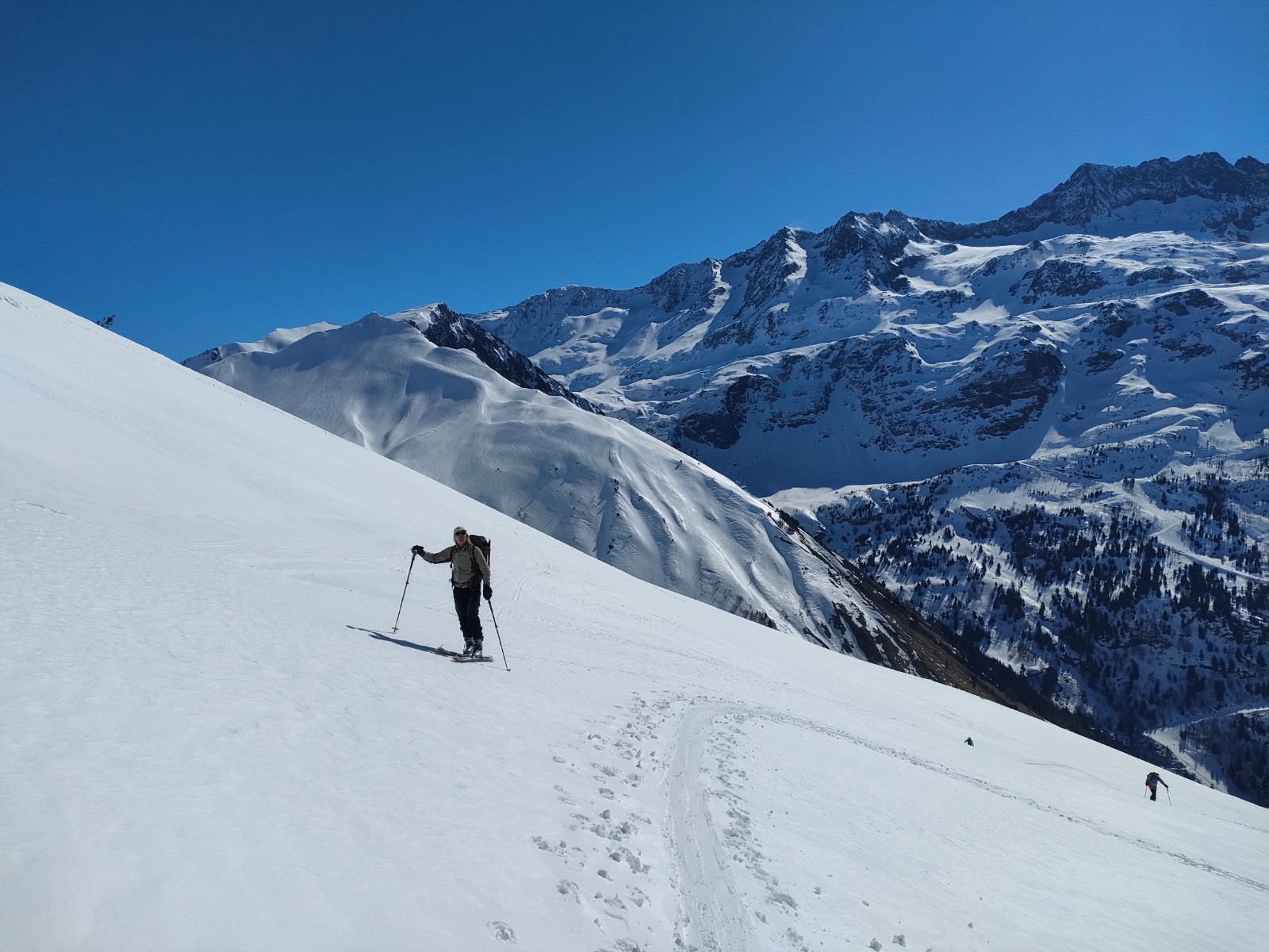 Mais la moquette nous attend, on ne peut pas traîner ! Et nous n'avons pas été déçu vraiment, jusqu'à 2100m, la moquette est un poil hétérogène mais elle reste fort agréable, on progresse prudemment, il faut profiter un maximum, et comme disait Jeanne d'Arc, inutile de s'enflammer. Au pied du Gros Treu, on s'avance vers un bas de couloir NE avec une neige semblant dure, on arrive à son niveau et là...