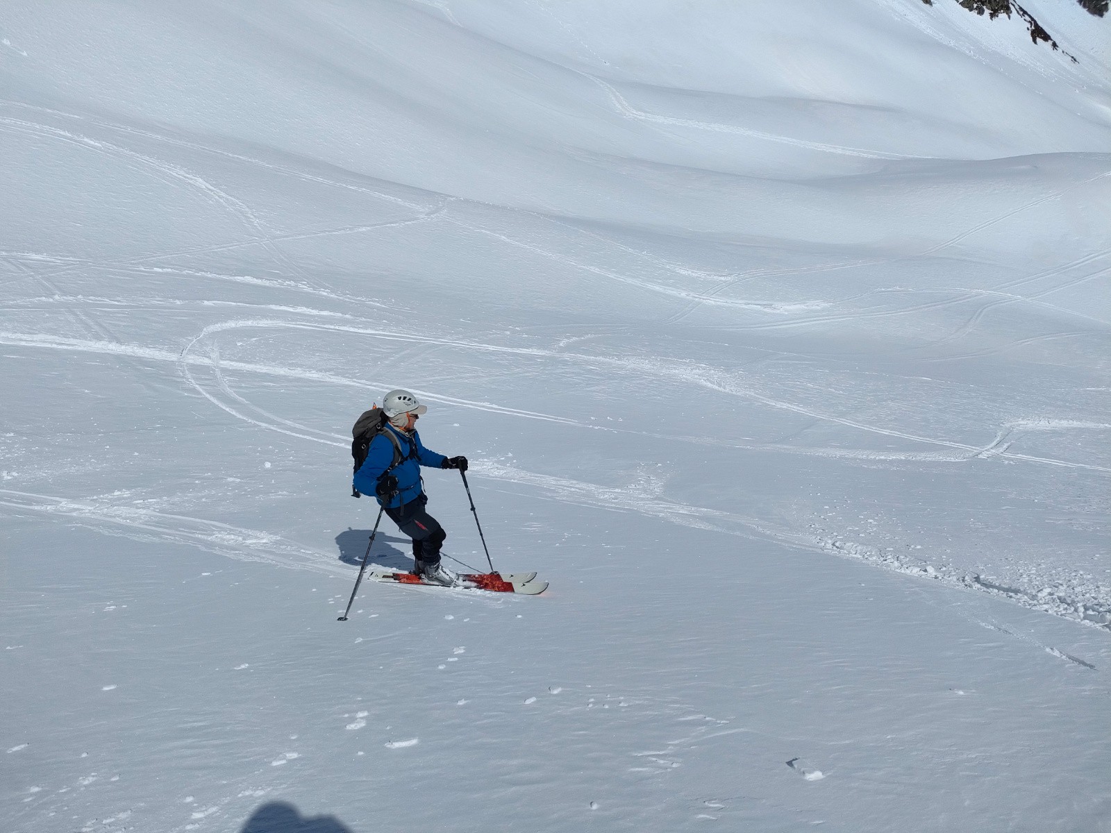 Conditions pour le ski : Absolument parfaites. Sur les pentes raides SO en haut des cols, lourde mais finalement pas si désagréable, près des pentes ombragés E, de la poudreuse de rêve, tout le reste oscille entre moquette quasi-parfaite et moquette parfaite.