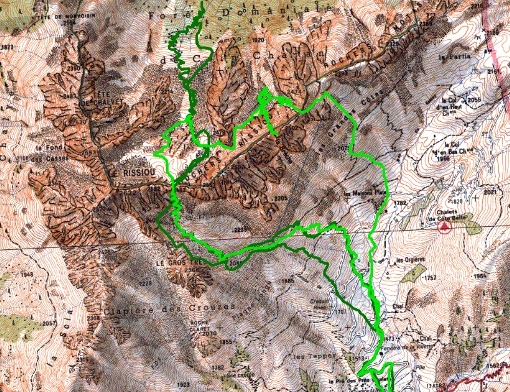 Itinéraire suivi : Le Collet->maisons plates->Breche 2463 à l'Est du Rissiou->combe sous tête de Chalvet 1700m Jeudi