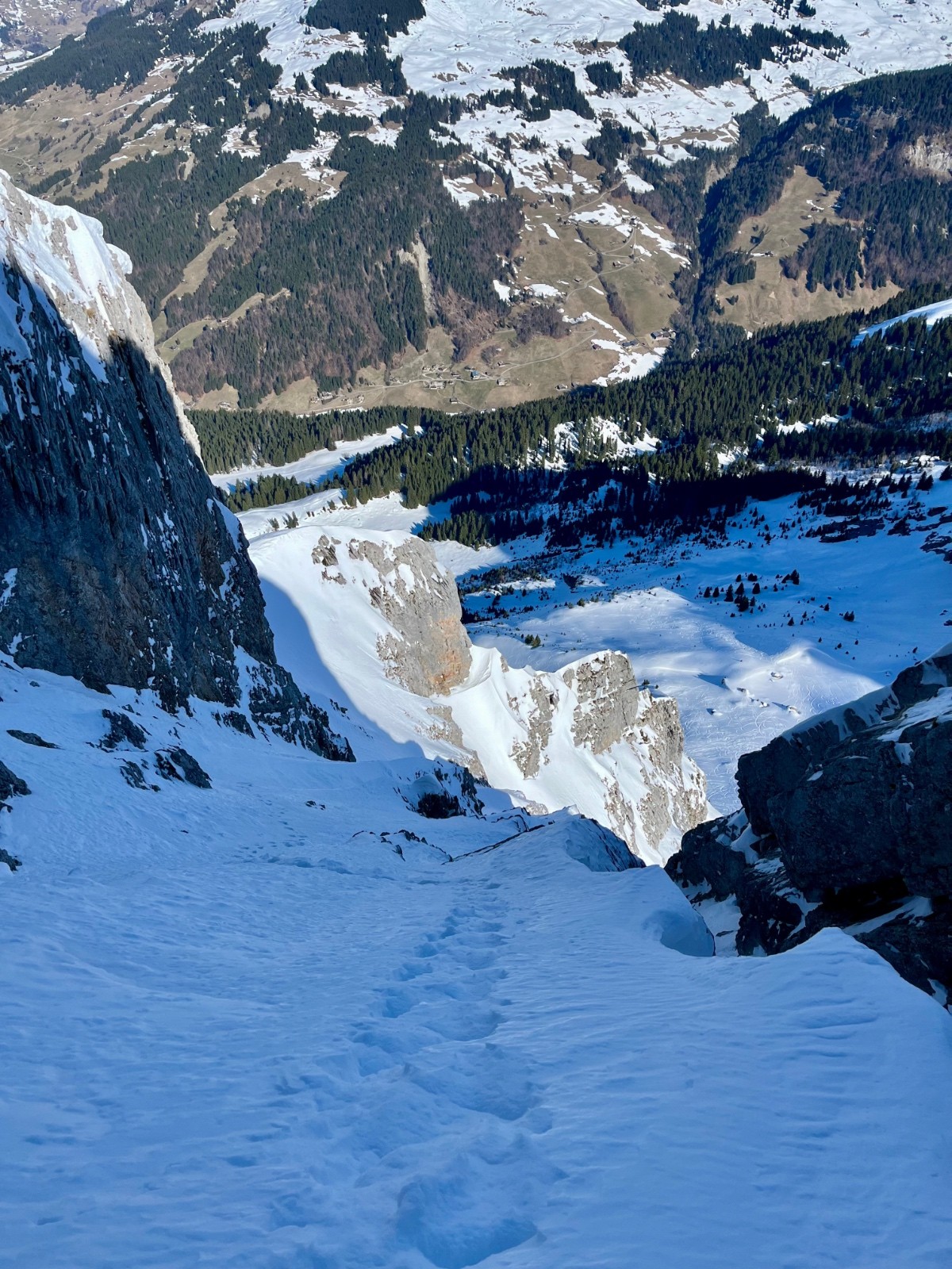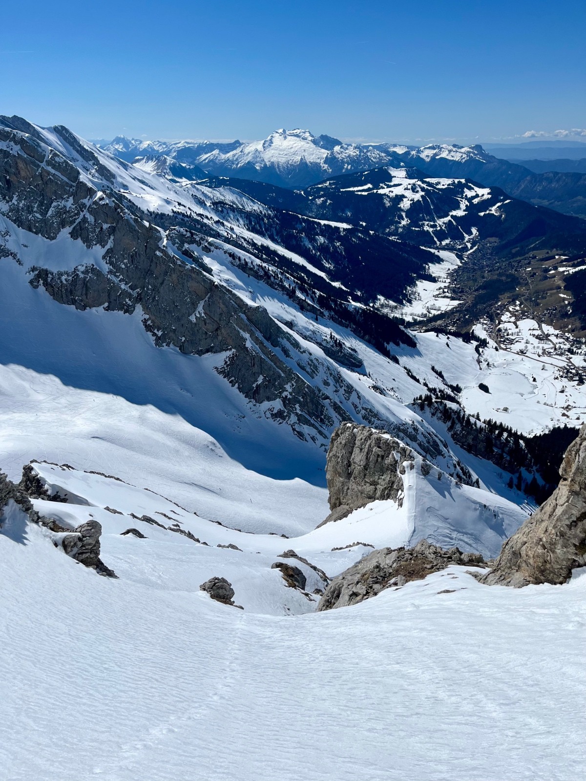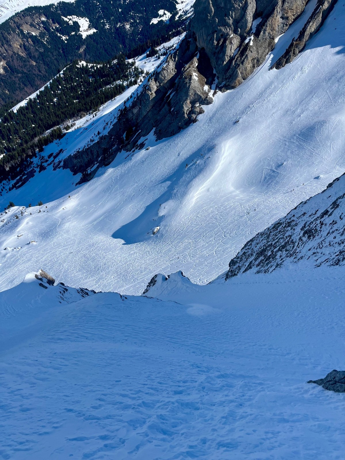 Départ prudent, la neige est pas folle (dur dans les traces, du sucre ça et là, un peu de relief lié au vent) mais ça ski bien. Je met la corde pour passer le petit ressaut (merci Alain ou les copains pour la sangle), mais finalement je passe en mode mains courante. La suite est génial, vraiment trop beau cette section de couloir en écharpe. Retour dans la traversée où j'essaye de suivre mes pas pour éviter la goulotte, mais impossible à cause du sucre j'en serais quitte pour passer la petite goulotte en dry (sucre sur dalle pas fameux sans être extrême). Puis du bon ski jusqu'au rappel. Comme mes prédécesseur je rate complètement le piton des ouvreurs. Le copain m'avais dis rappel de 15 m, sauf que depuis le relai évident, la corde arrive à peine au sommet du ressaut, les calculs sont pas bon chef. Tant pis je remet les crampons pour 5 m, j'aurais pu sauter, mais c'est pas bien sage. Neige dure et ancienne trace dans le raidar du bas et fin en bonne neige. Presque 40 min de descente, c'est quand même sérieux ce bazard !