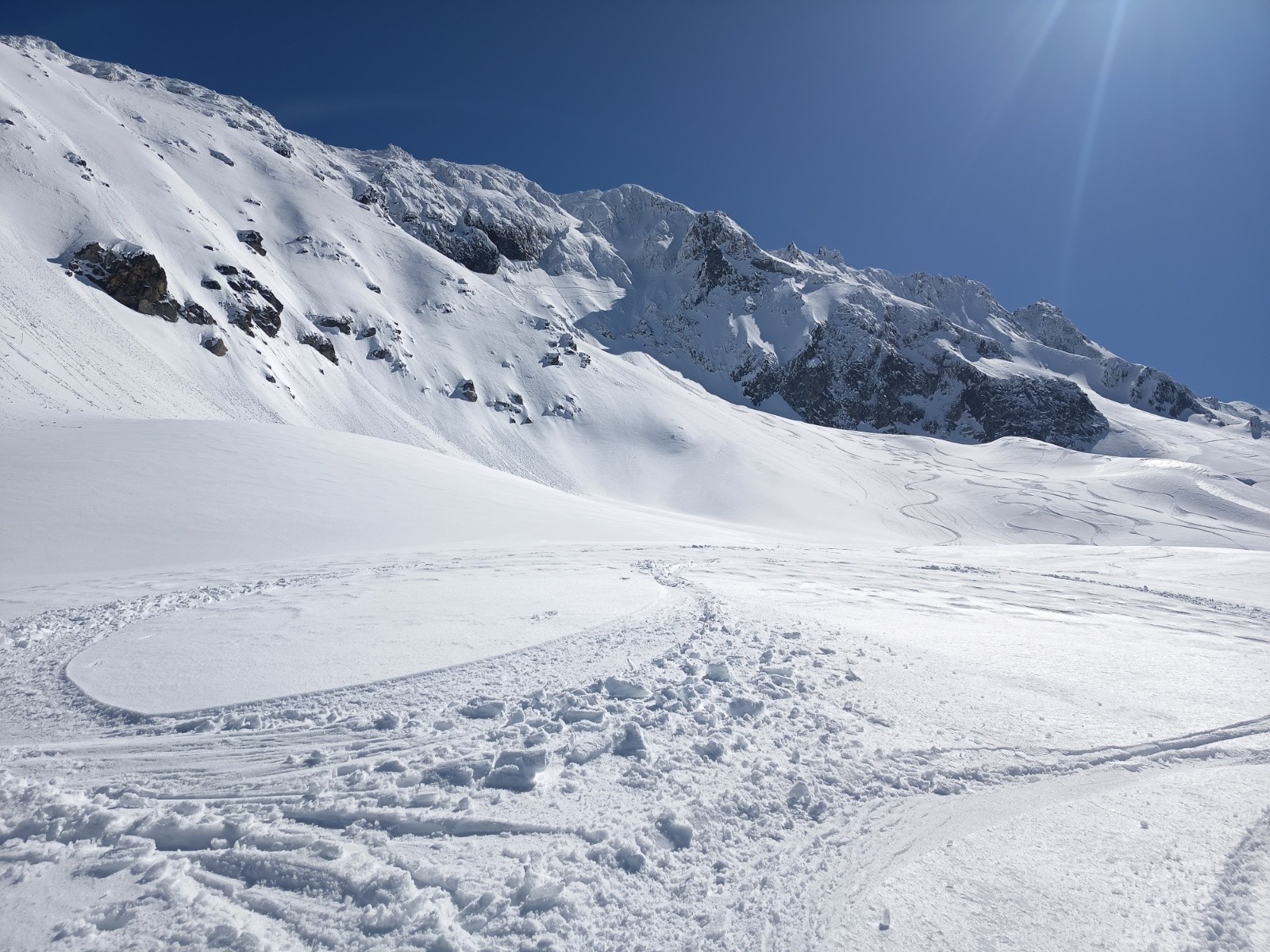 Conditions pour le ski : conditions très bonnes sauf sous 1800 m dans la combe du Pendet en poudre lourde