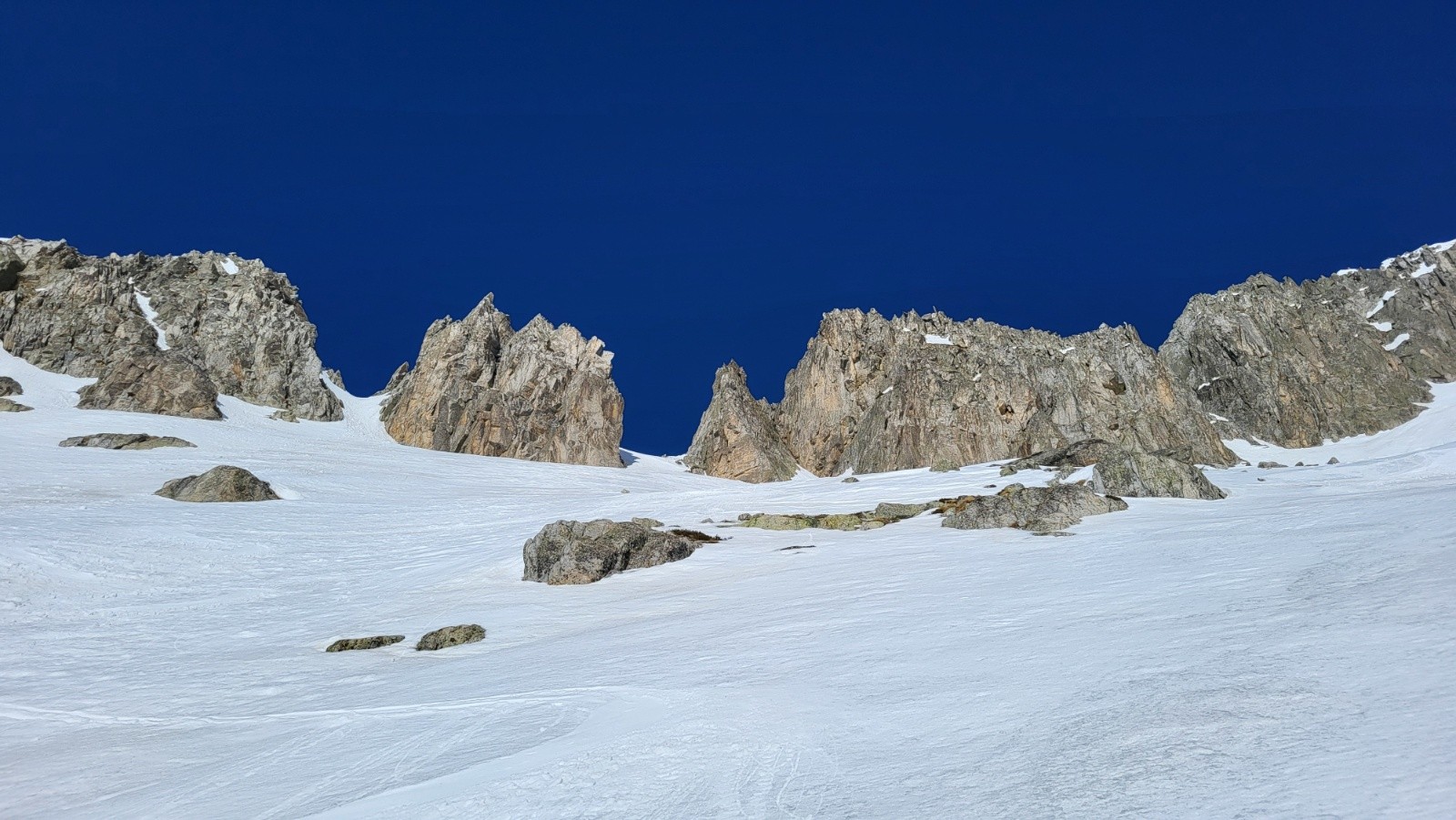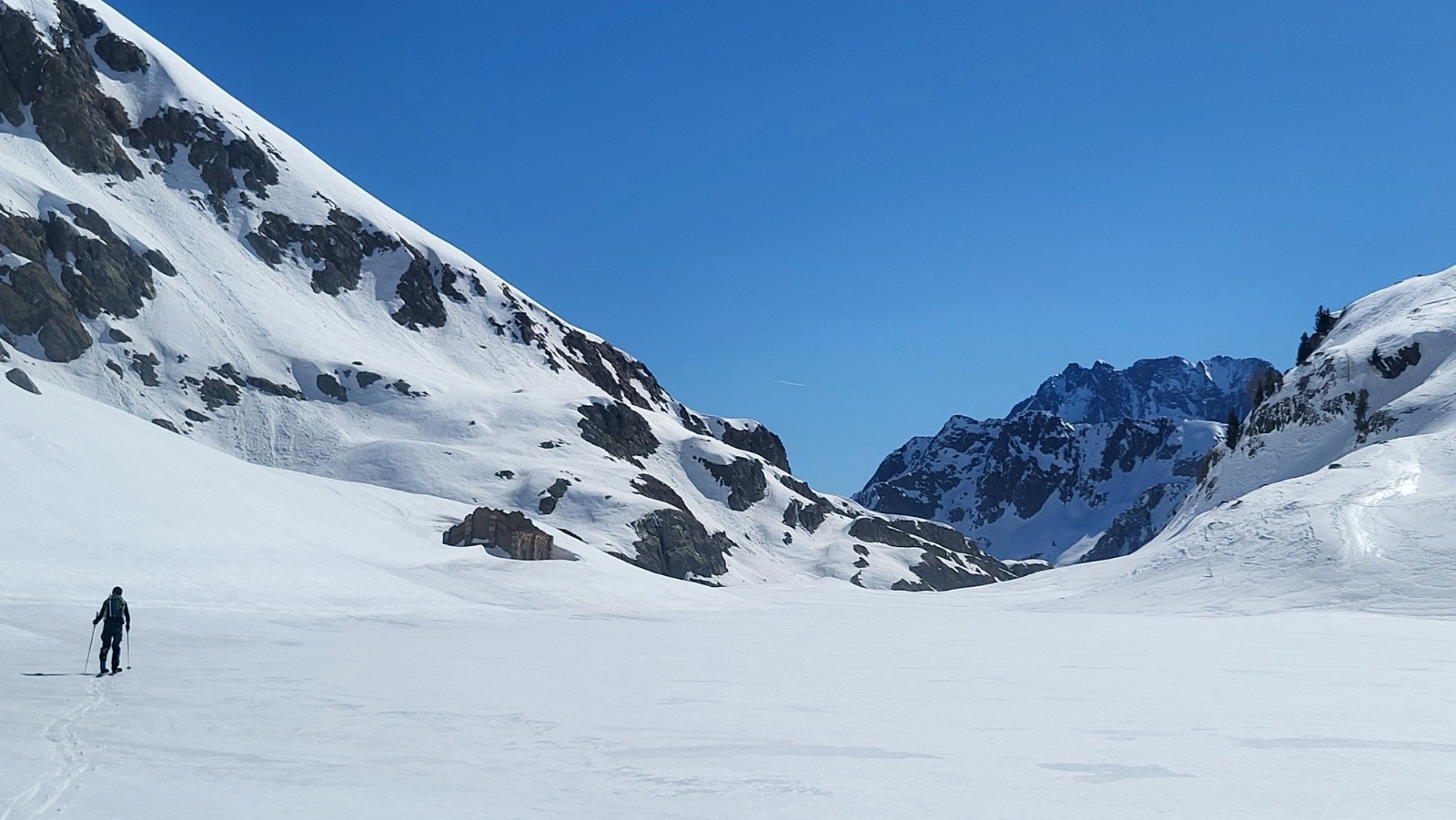 Grands espaces sauvages, pas grand monde, vues superbes depuis Valrossa sur le massif de l'Argentera et les Tablasses, le vallon du Prefouns et Cresta Savoia, remontée de deux couloirs. Et du bon ski...