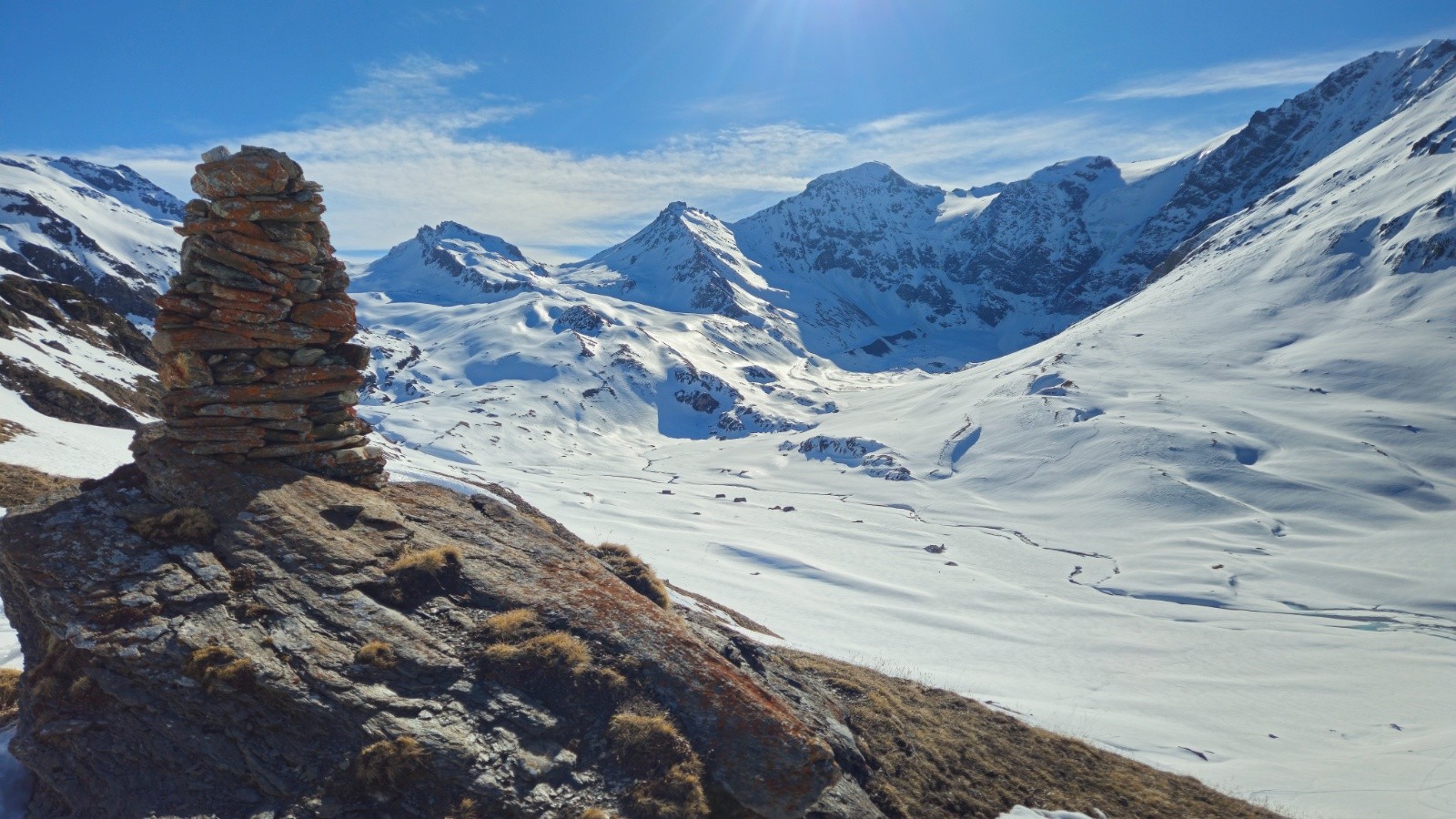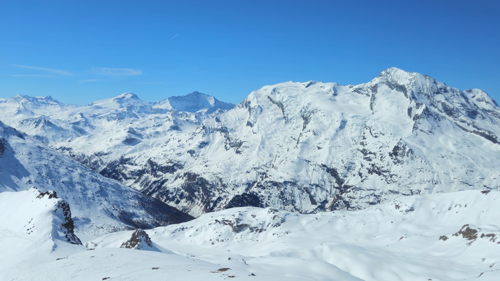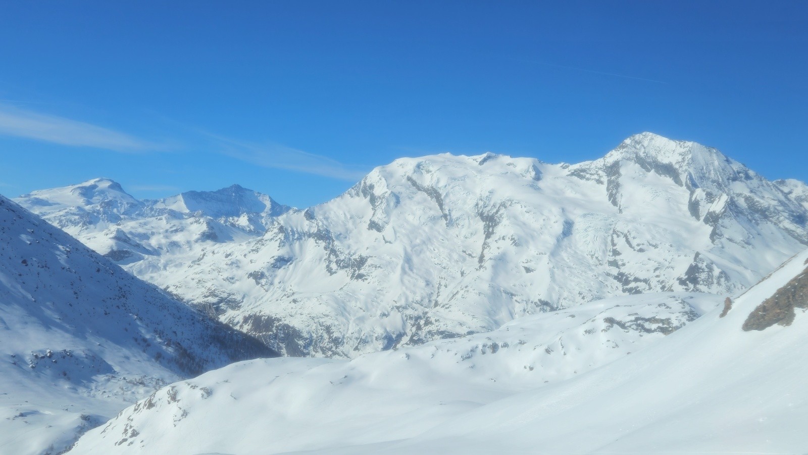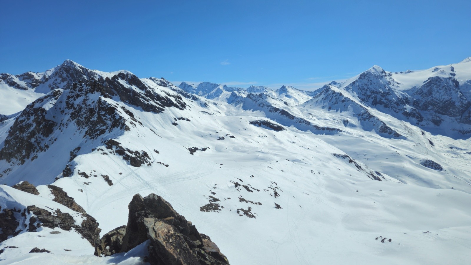 Après une montés sans histoire - même si il y a toujours de la distance dans ces grands vallons, on arrive enfin au sommet pour profiter de la vue à 360 degrés sur la Grand e casse, le Mont Blanc, les Jorasses, et toutes les montagnes du coin. Superbe.