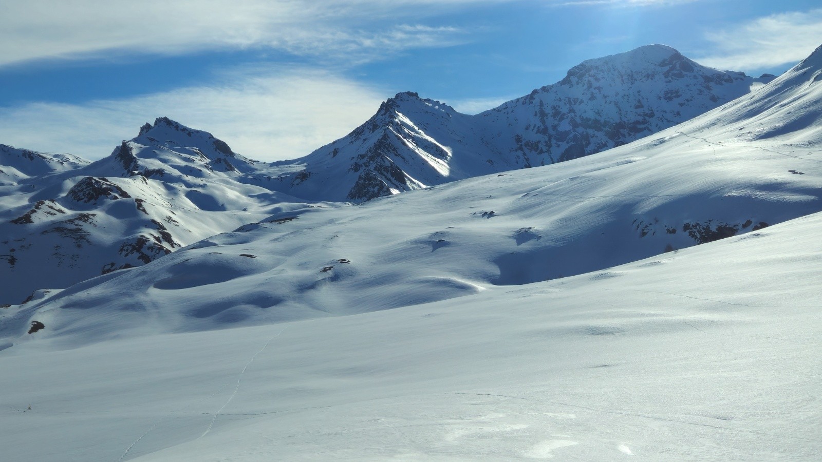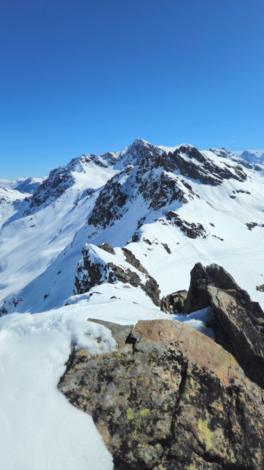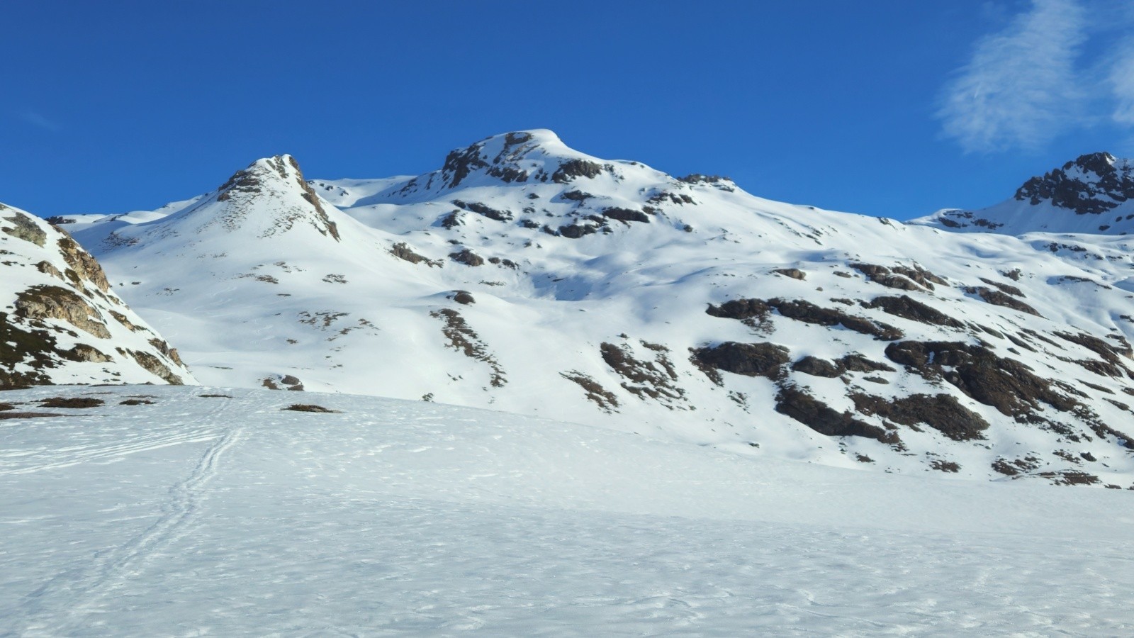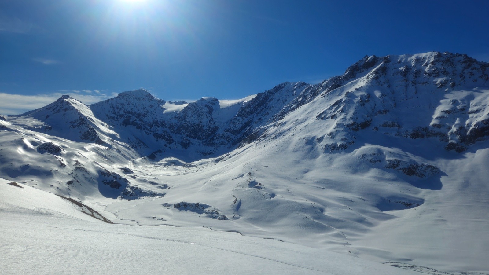 Après une montés sans histoire - même si il y a toujours de la distance dans ces grands vallons, on arrive enfin au sommet pour profiter de la vue à 360 degrés sur la Grand e casse, le Mont Blanc, les Jorasses, et toutes les montagnes du coin. Superbe.