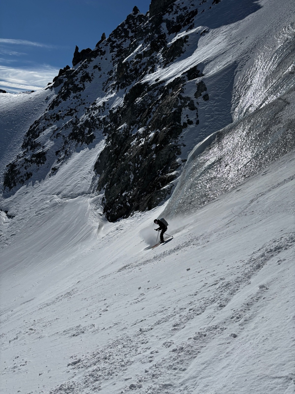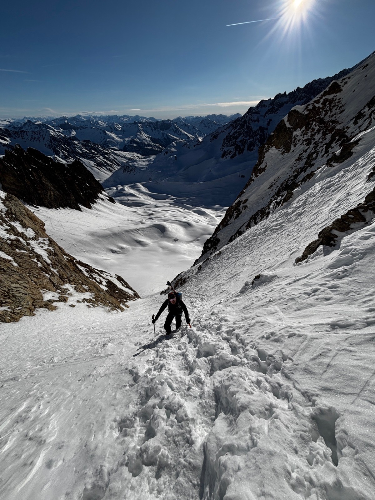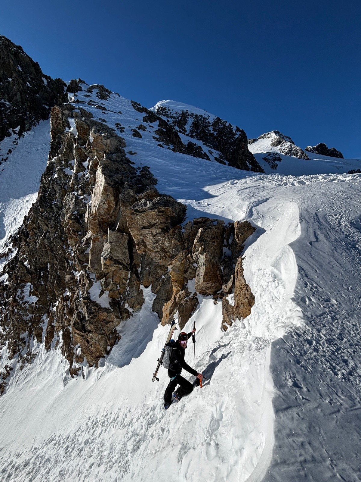 Ressaut à 3200m en crampons, assez large et qui passe encore bien (montée et descente). On rechausse, puis ressaut/couloir à 3400m. Là c'est bien plus étroit et technique, pointes avant et piolet traction sur un bon 50° en neige dure limite glace par endroits. Un champignon de neige est dispo pour tirer un rappel à la descente.