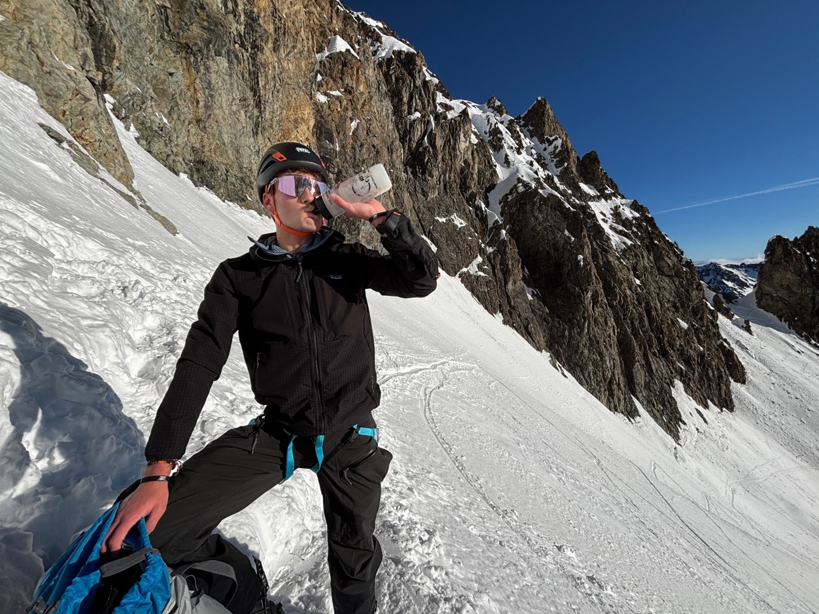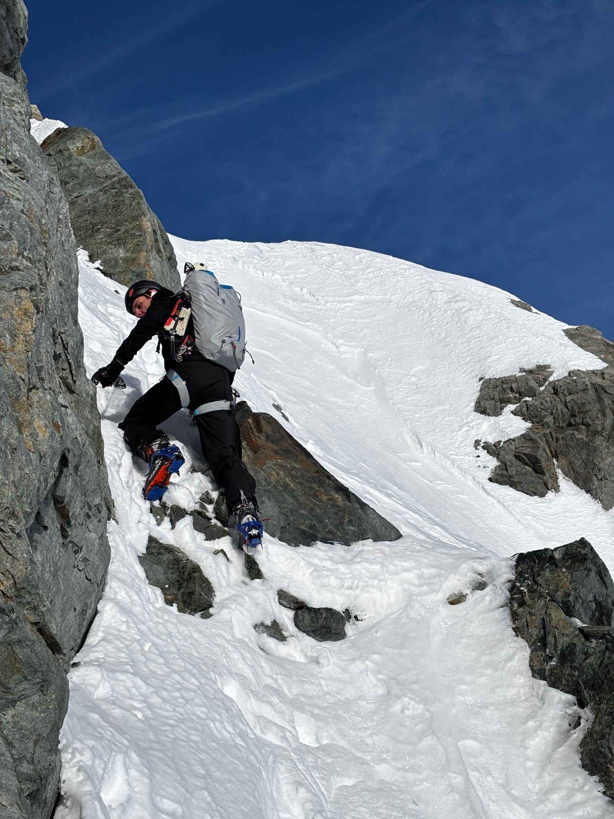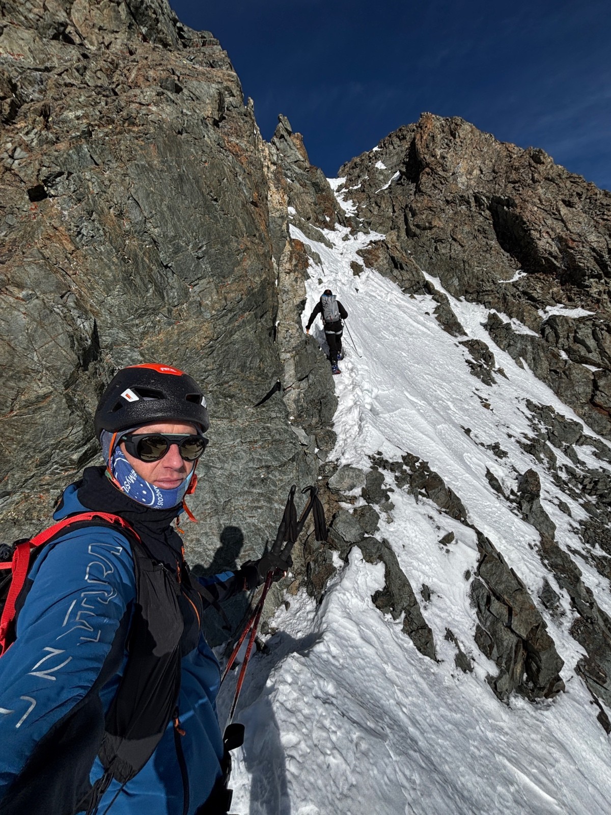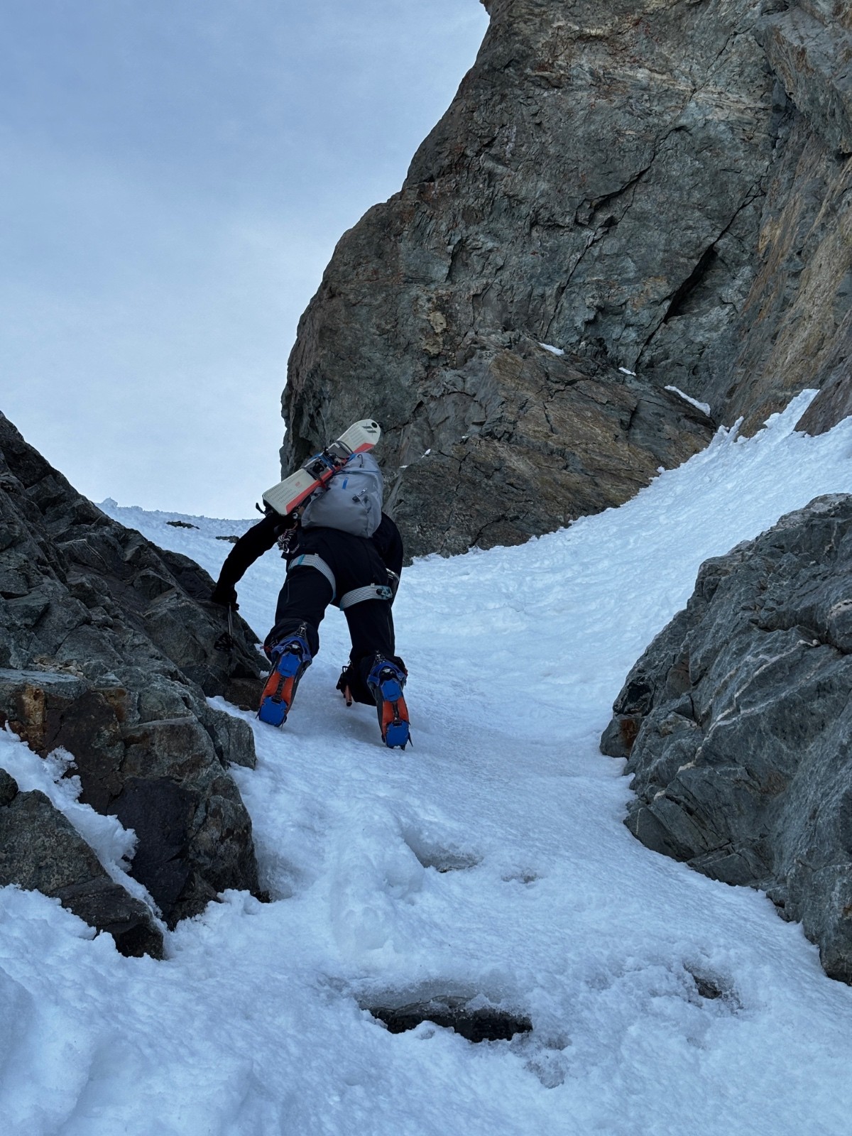 Ressaut à 3200m en crampons, assez large et qui passe encore bien (montée et descente). On rechausse, puis ressaut/couloir à 3400m. Là c'est bien plus étroit et technique, pointes avant et piolet traction sur un bon 50° en neige dure limite glace par endroits. Un champignon de neige est dispo pour tirer un rappel à la descente.