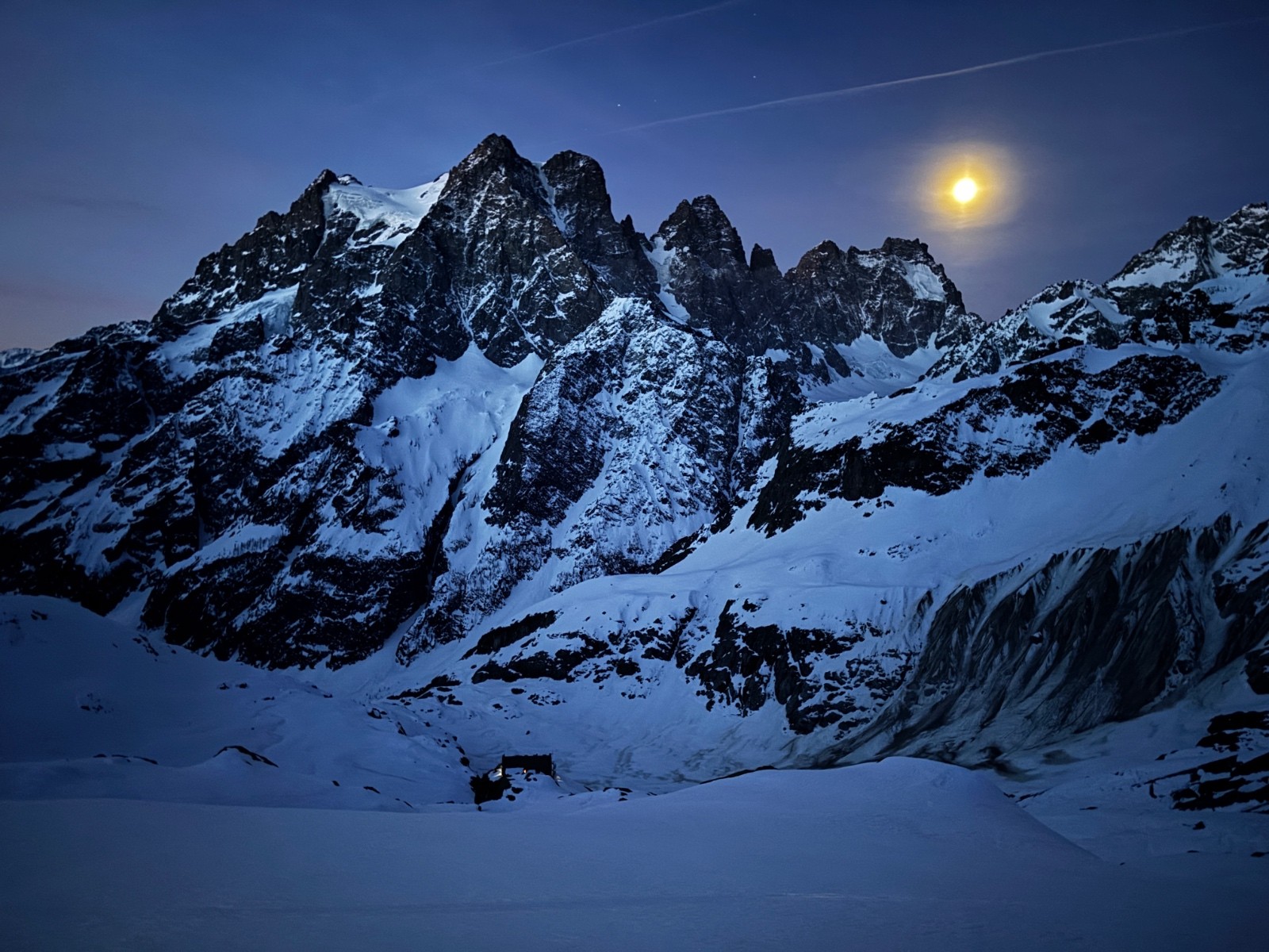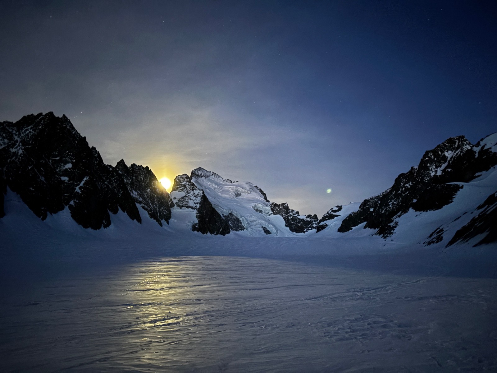 Dimanche, départ 6h des Ecrins, pour un peu de ski béton à la pleine lune sur le Glacier Blanc. La remontée du Glacier en S est plutôt pénible: c'est Sud, ça a chauffé hier et les traces ont regelé, la neige zippe. Je ne suis d'habitude pas fan des couteaux, mais là il faut avouer que je les aurais volontiers adoptés. :-P