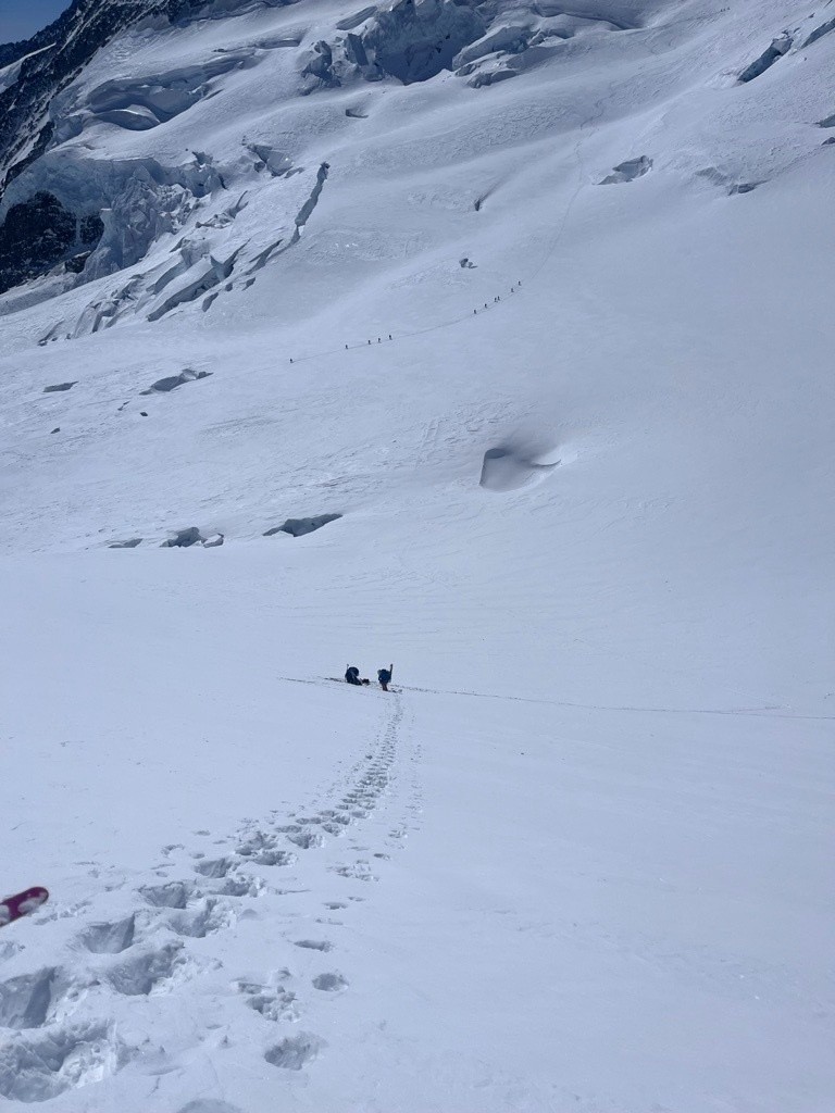 Conditions nivo et activité avalancheuse : demi-tour juste sous Rottalsattel, 50m de trav' bien chargée avec un bonne exposition au-dessus des séracs. Les 4 petits groupes du jour ont fait le même constat, trop plaquée