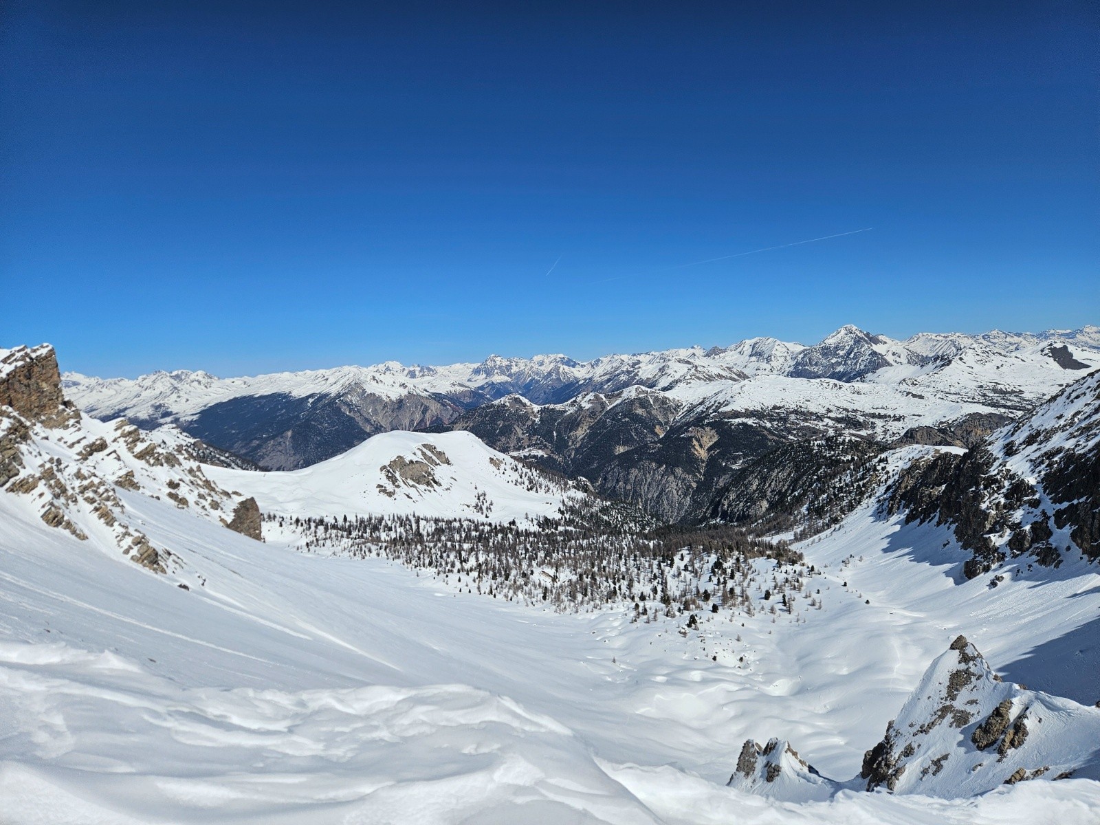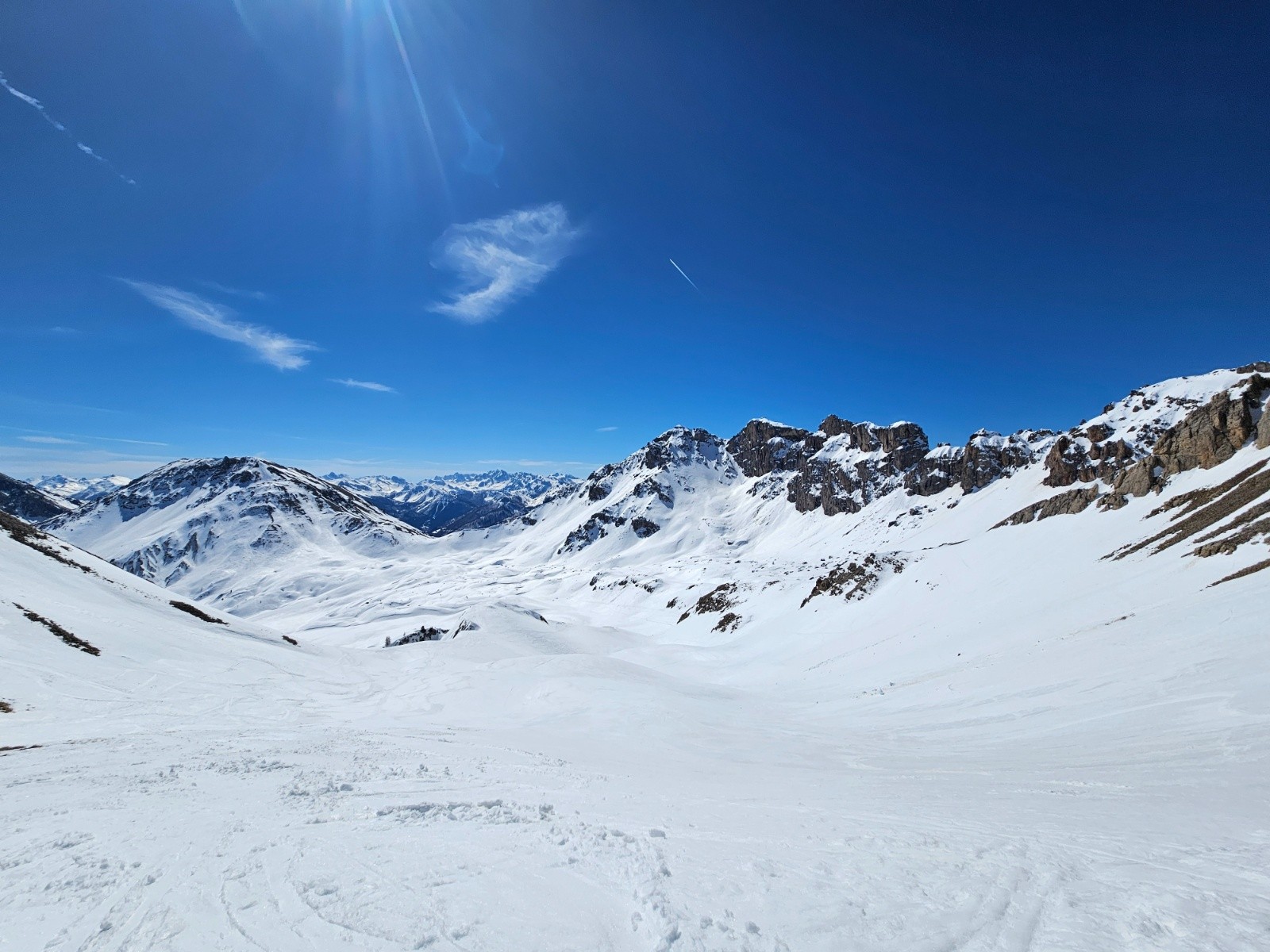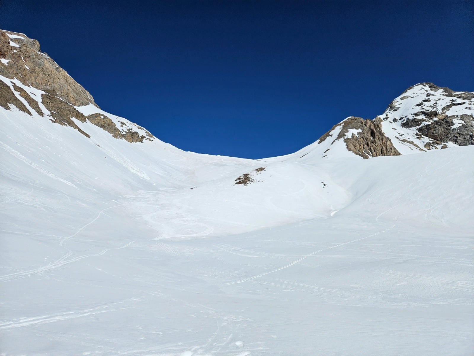 Redescente dans de la neige un peu trop recuite globalement. Il faut un peu d'attention sur des freinages inattendus, mais on arrive quand même à s'amuser jusqu'en bas.