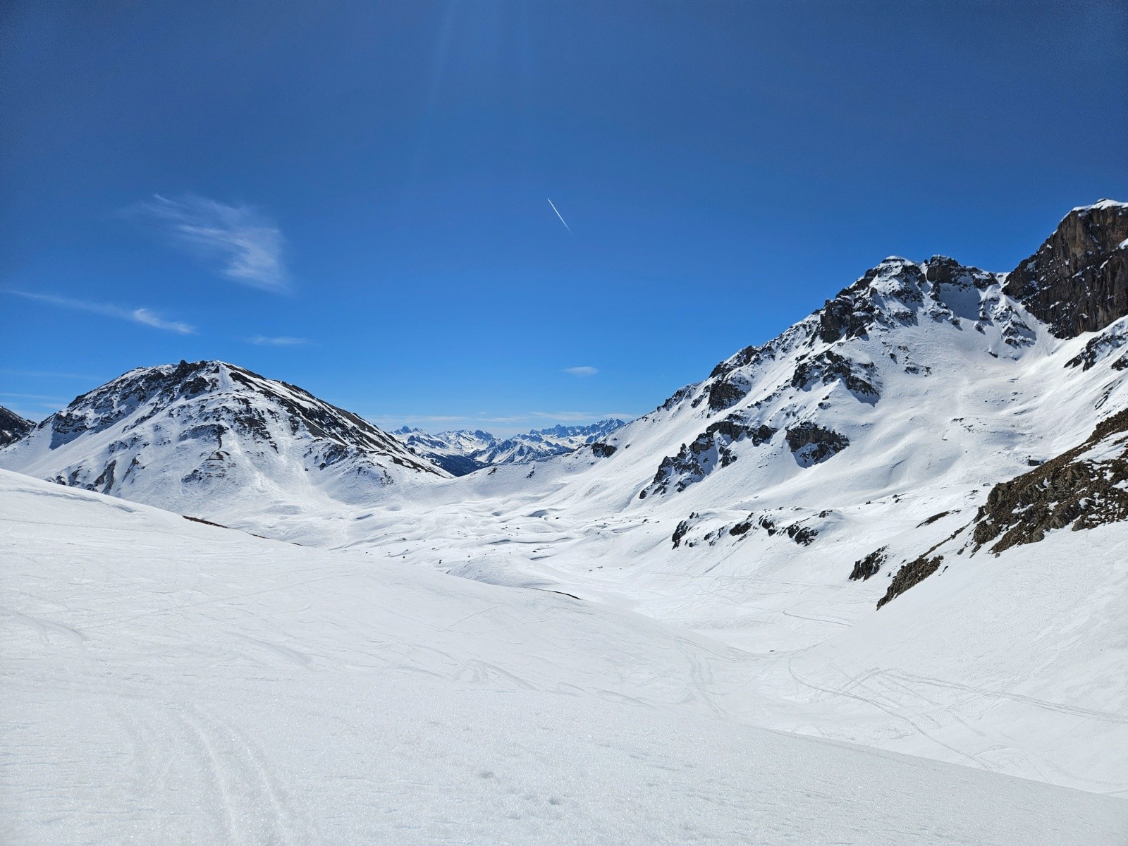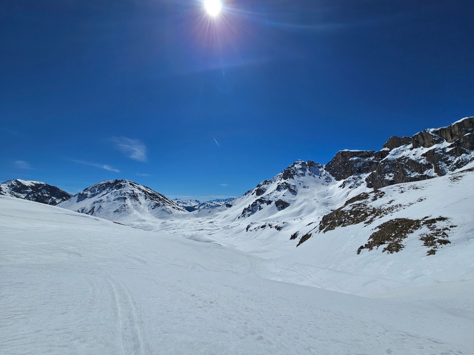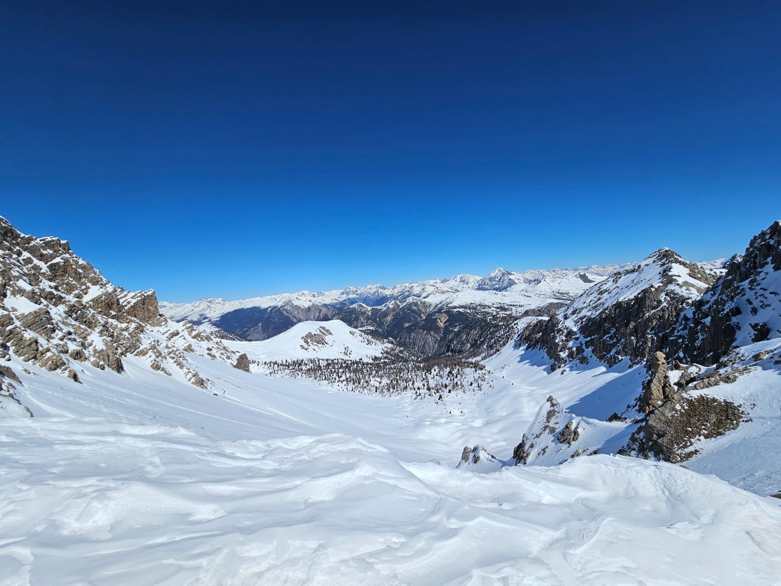 Redescente dans de la neige un peu trop recuite globalement. Il faut un peu d'attention sur des freinages inattendus, mais on arrive quand même à s'amuser jusqu'en bas.