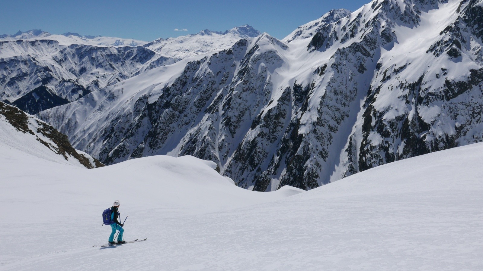 Descente par Combe Rousse où c'est bien collant. On devra remettre les peaux pour 5 minutes de traversée avant de rejoidre l'itinéraire de montée sous le col des fontaines.
