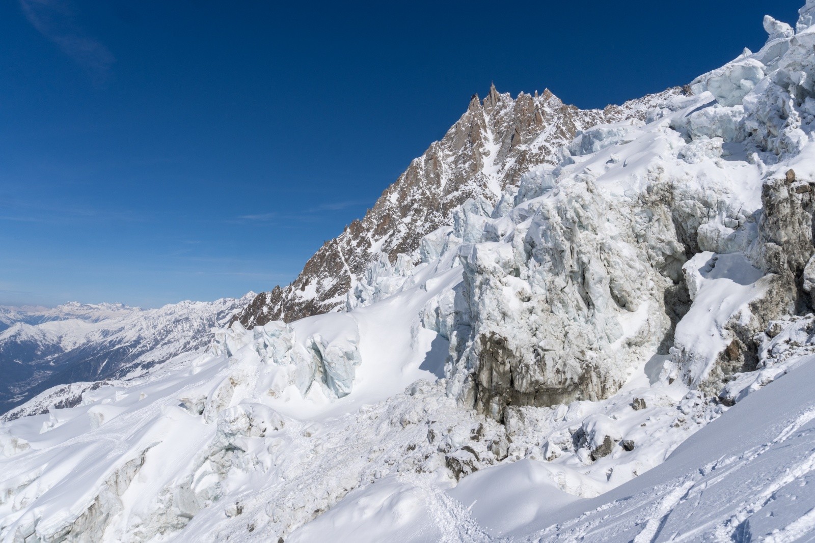 Conditions pour le ski : neige parfaite autour du refuge, cartonnée au dessus de 4000
