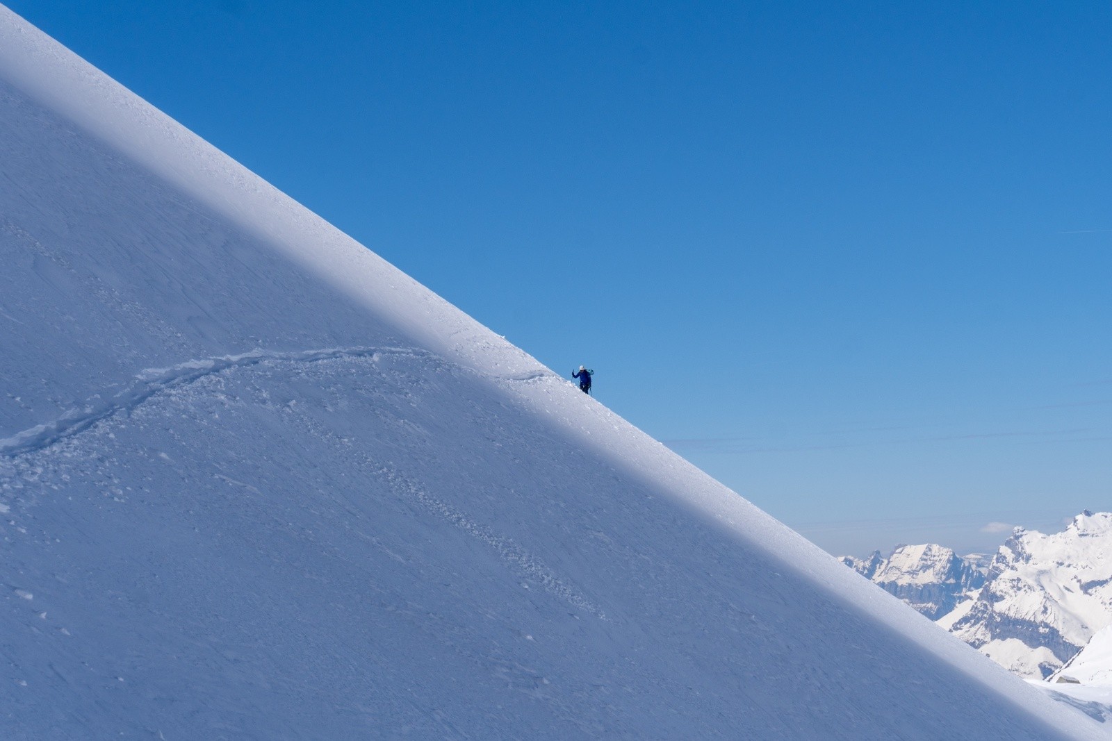 On ski dans la purée, on n’y voit rien, la trace à la montre nous aide bien. Combo mal de tête à cause de l’altitude et nausées à cause du jour blanc, c’est pas le meilleur ski. Enfin, après le petit plateau, on y voit clair, et la neige est au top. Un repos rapide au refuge, et on redescend à la benne, accompagné d’un polonais qui aura finalement lui aussi du renoncer. On apprendra plus tard que deux autres cordées se sont abrités deux heures à Vallot, et le temps se dégageant, ont commencé l’arête des bosses mais sans succès.