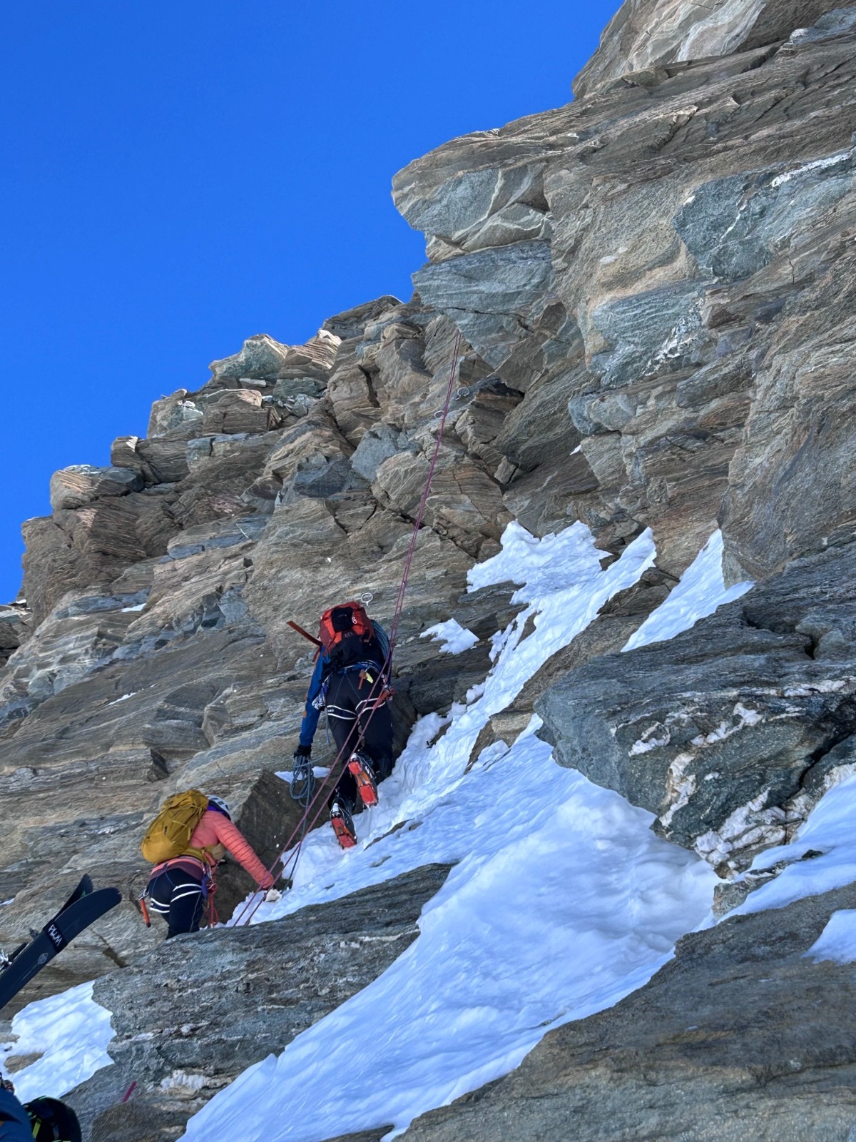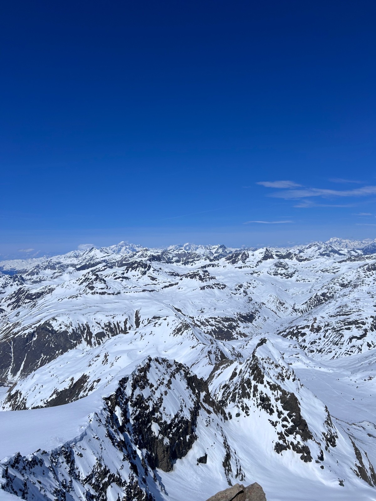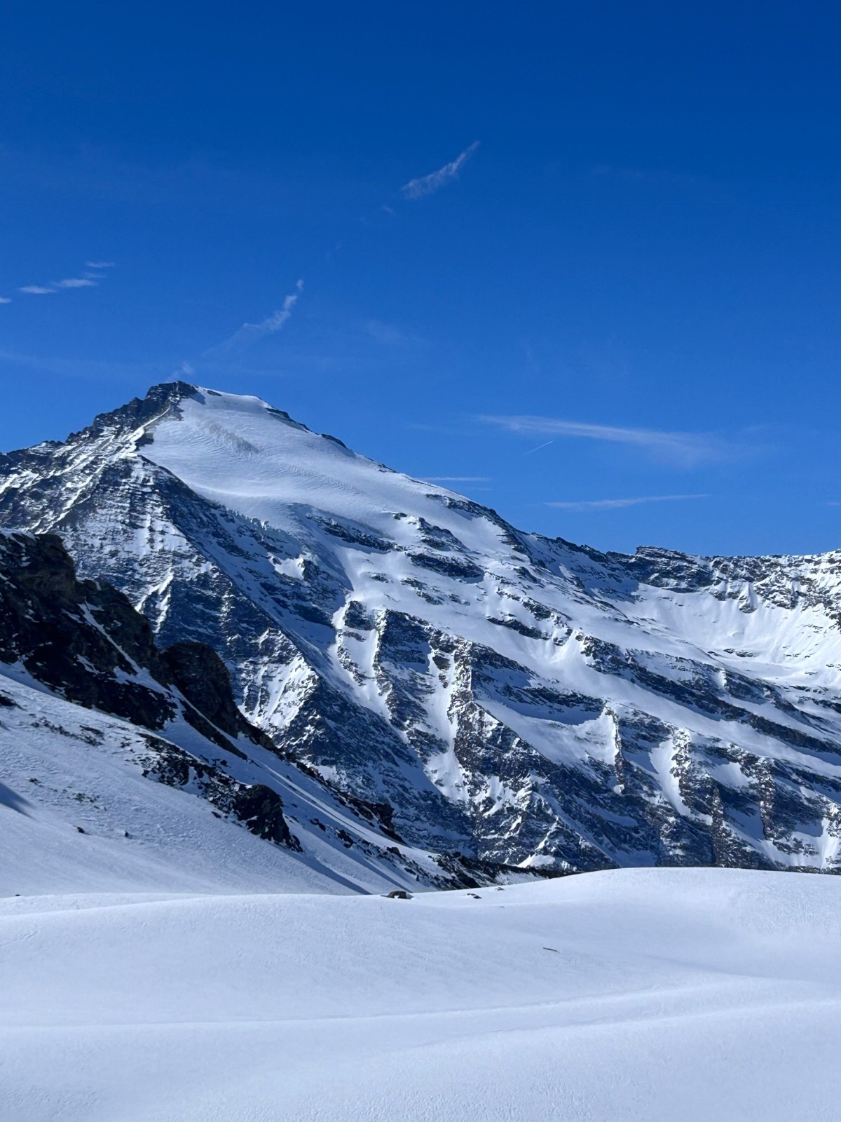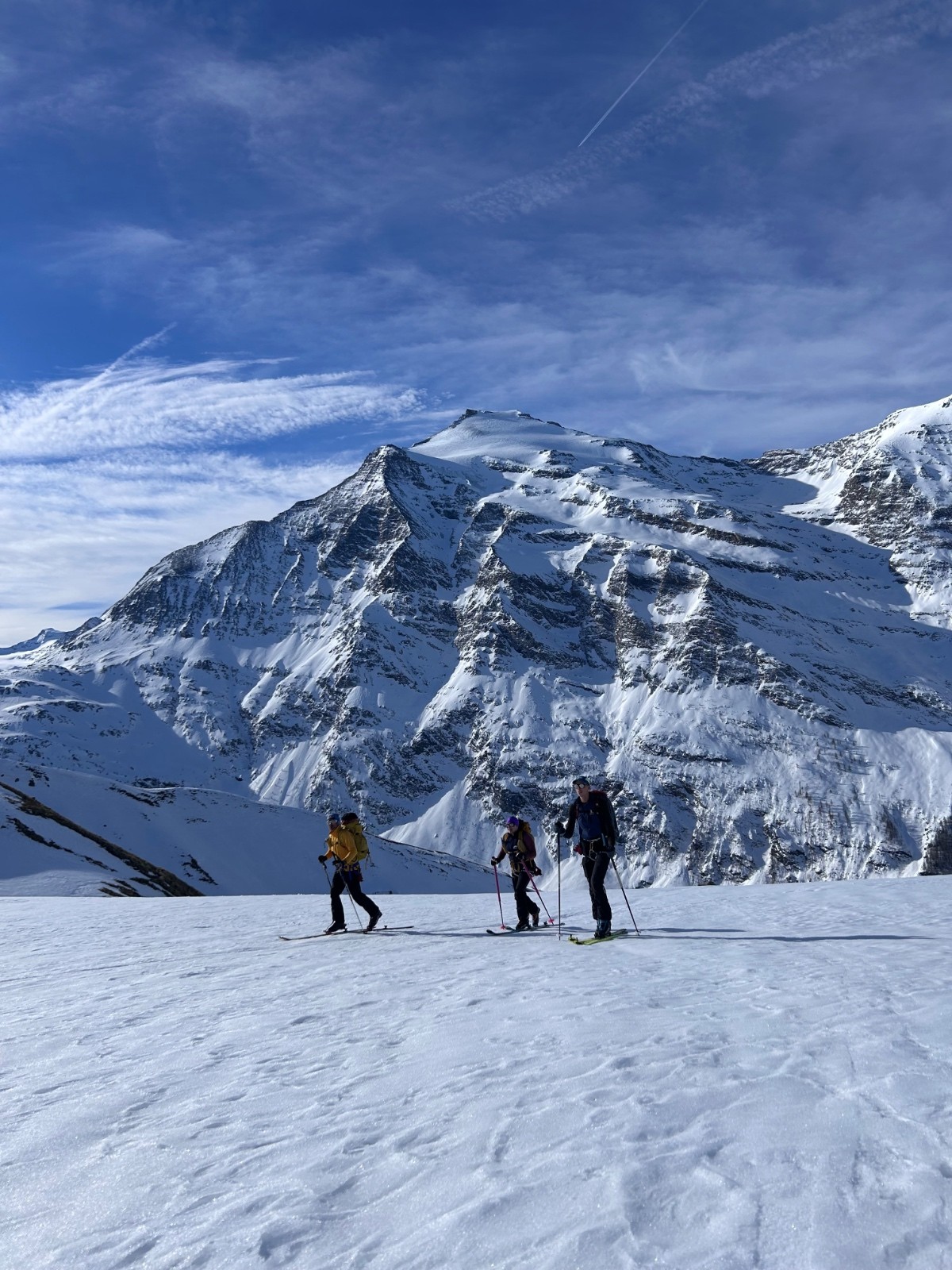 Sommet que je voulais parcourir depuis un moment, c’est fait et c’était magnifique. Montée par le glacier du grand fond, couteaux pour la partie raide tout en bas au départ juste après la piste de ski de fond. Sinon le reste de la montée top. Glacier complètement bouché. Dépose ski sous le sommet. Les bouchons, on arrive au ressaut à 13h, on sera en bas de celui ci à 15h… 2h pour grimper et descendre 20 mètres. Les intéressés se reconnaîtront probablement si ils traînent sur skitour. Faudra aller s’entraîner à poser des rappels 🤪