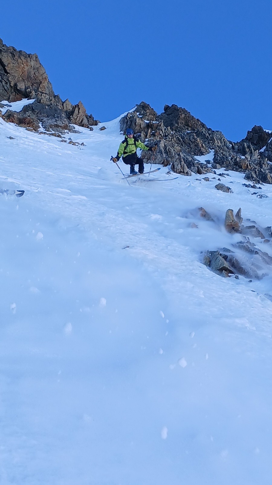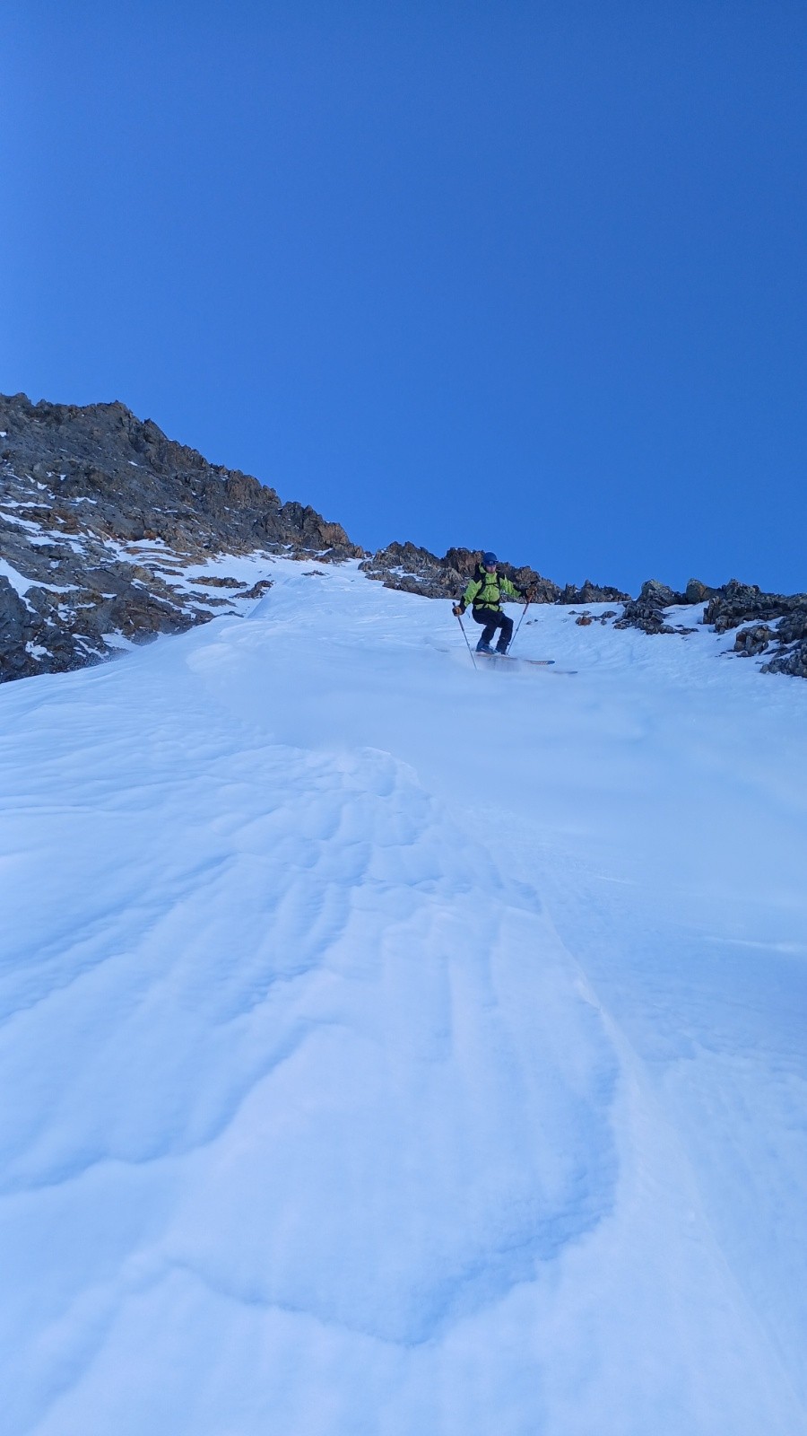 Conditions pour le ski : Ne pas descendre trop tard au Soleil car sinon ça colle. couloir W béton et neige compacte/ventée dans l'écharpe